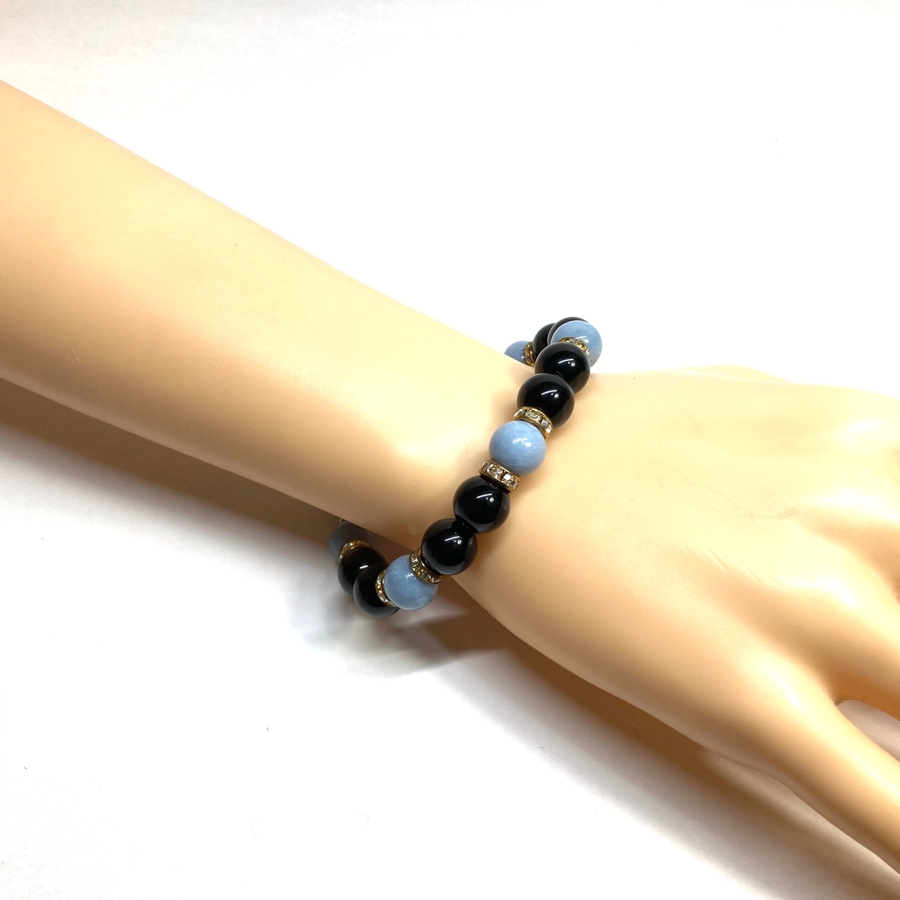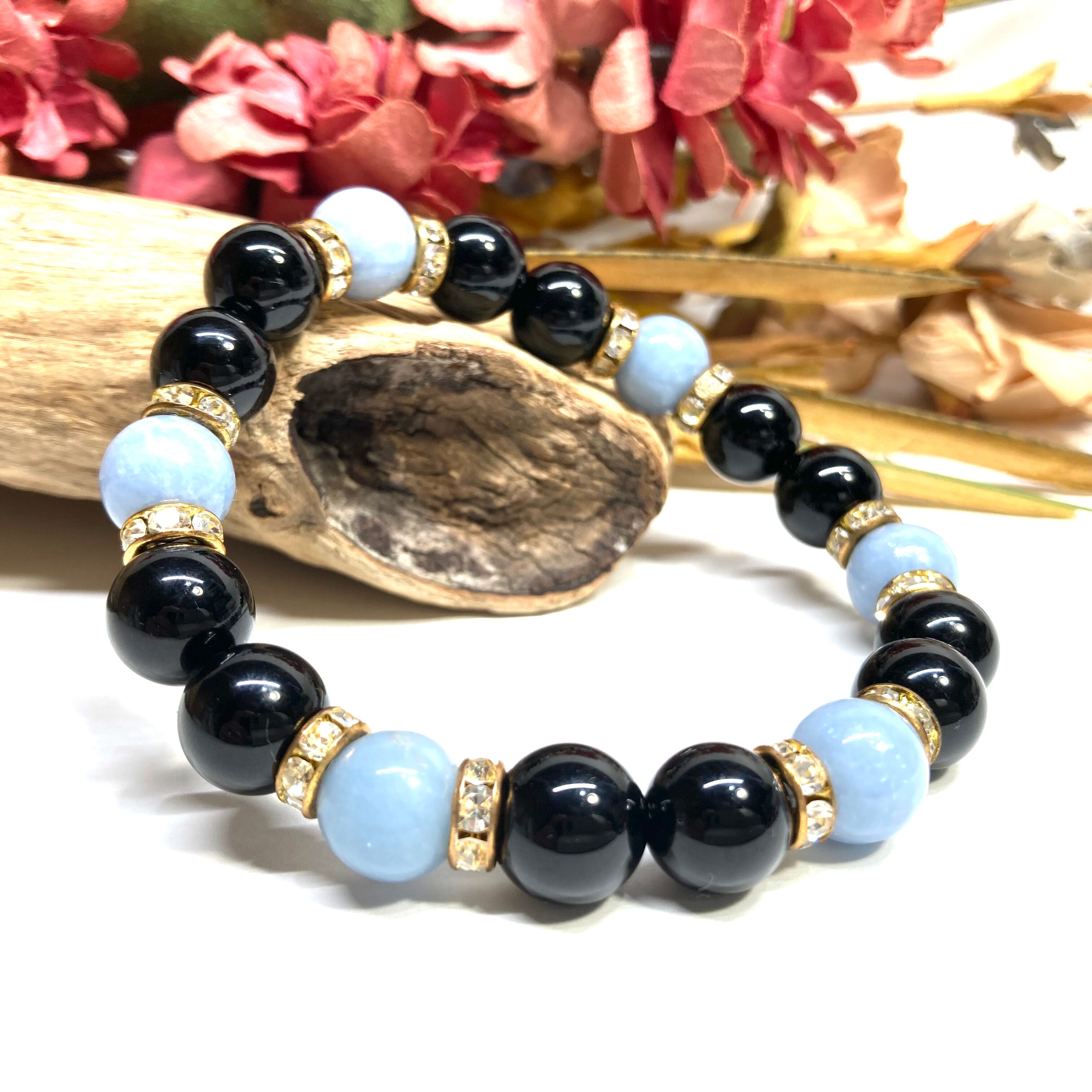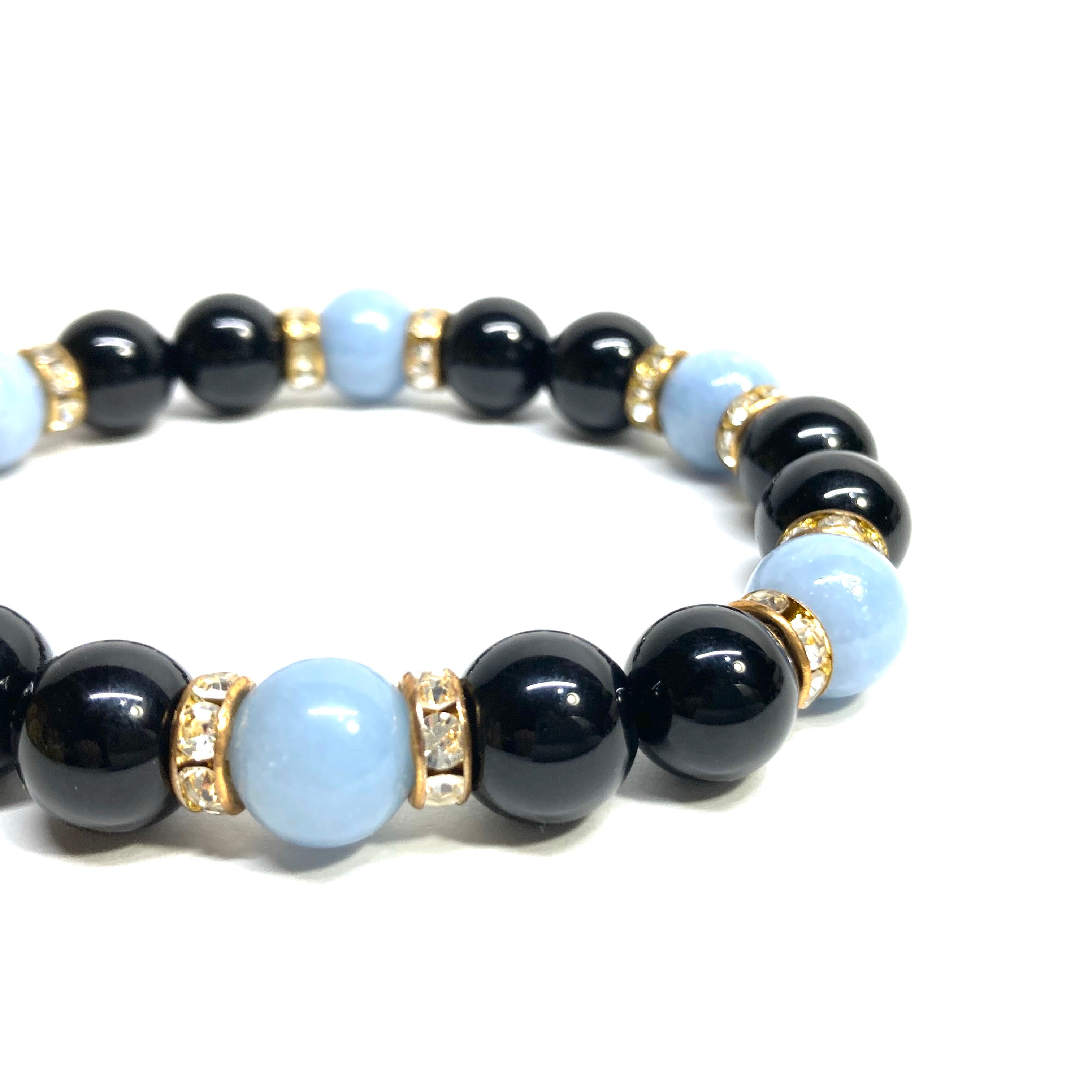 こちらは、モリオンとエンジェライトを組み合わせたパワーストーンブレスレットです。間にはロンデルを挟み高級感あるデザインに仕上げております。石大きさは腕にも馴染みやすいように10mm玉で内径約18cm(伸可能)です。 数に限りがございますので気になる方はお早めにどうぞ。