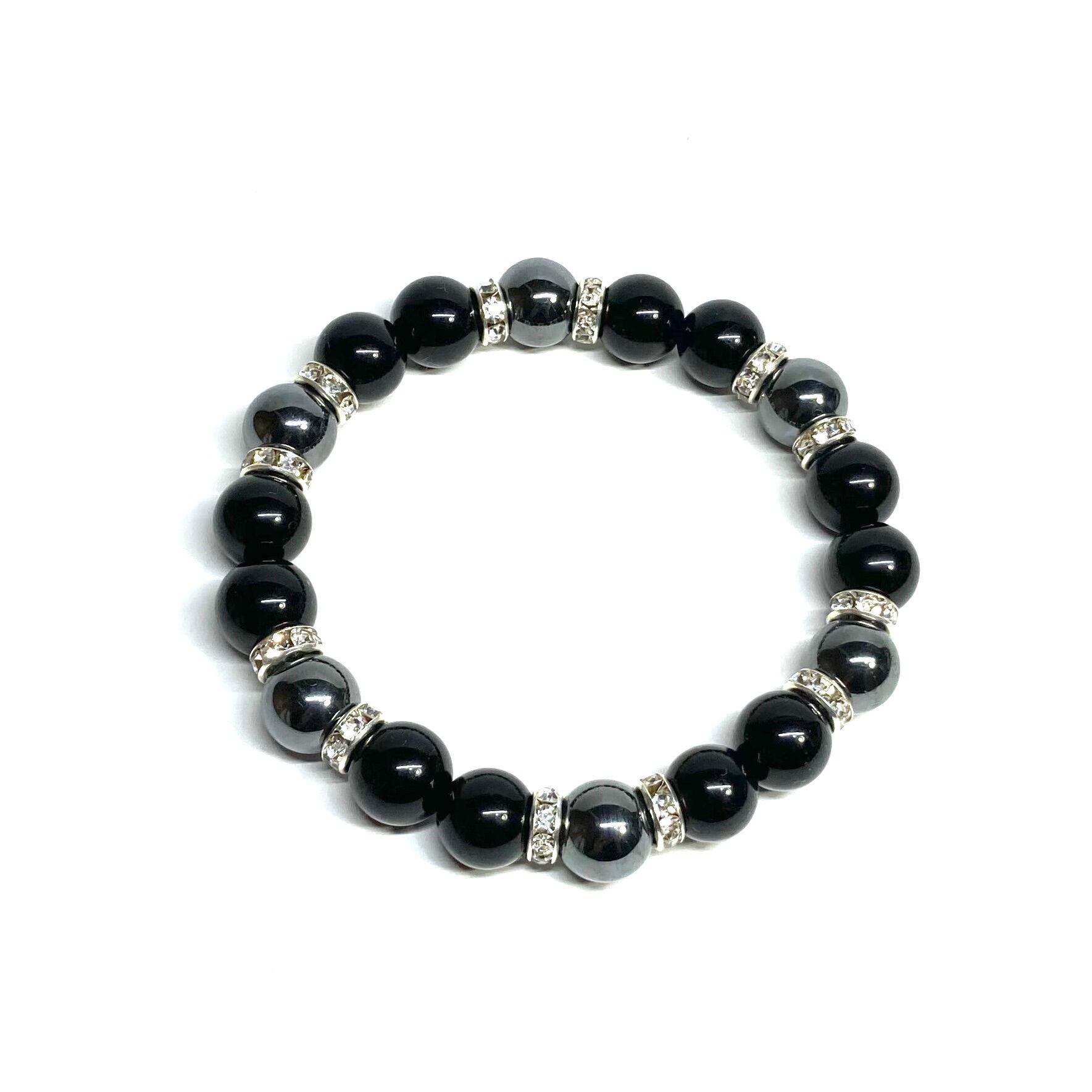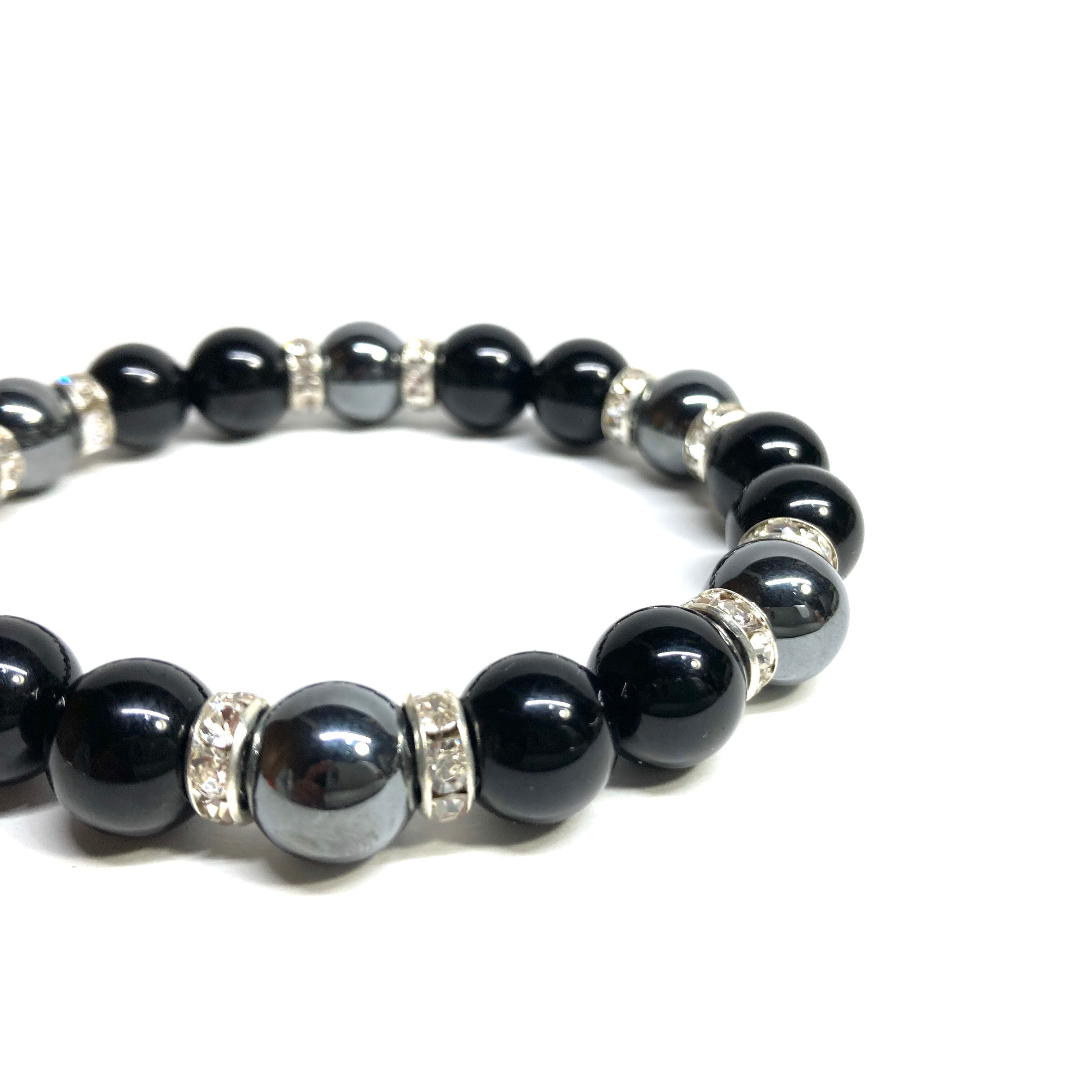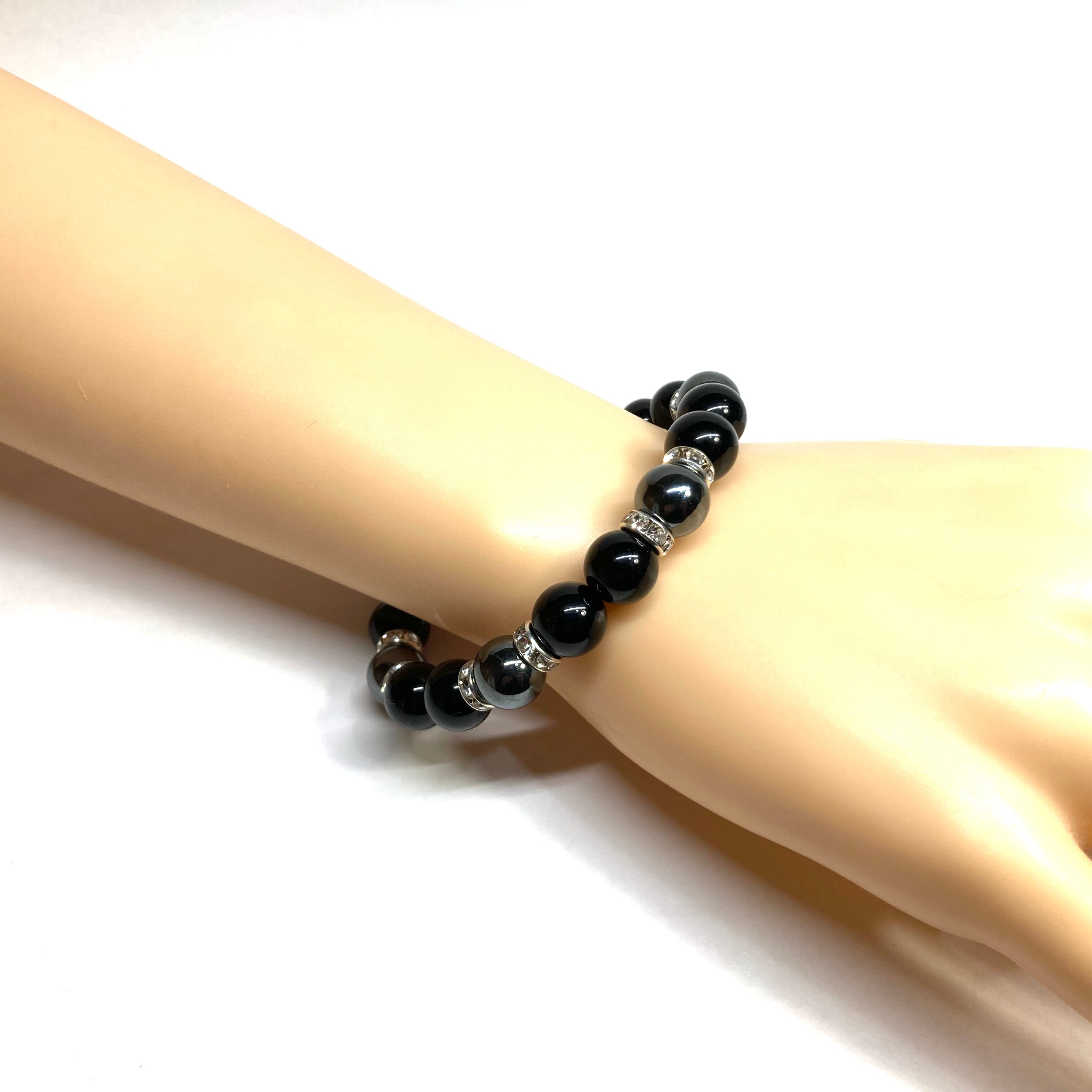 こちらは、モリオンとヘマタイトを組み合わせたパワーストーンブレスレットです。間にはロンデルを挟み高級感あるデザインに仕上げております。石大きさは腕にも馴染みやすいように10mm玉で内径約18cm(伸可能)です。 数に限りがございますので気になる方はお早めにどうぞ。