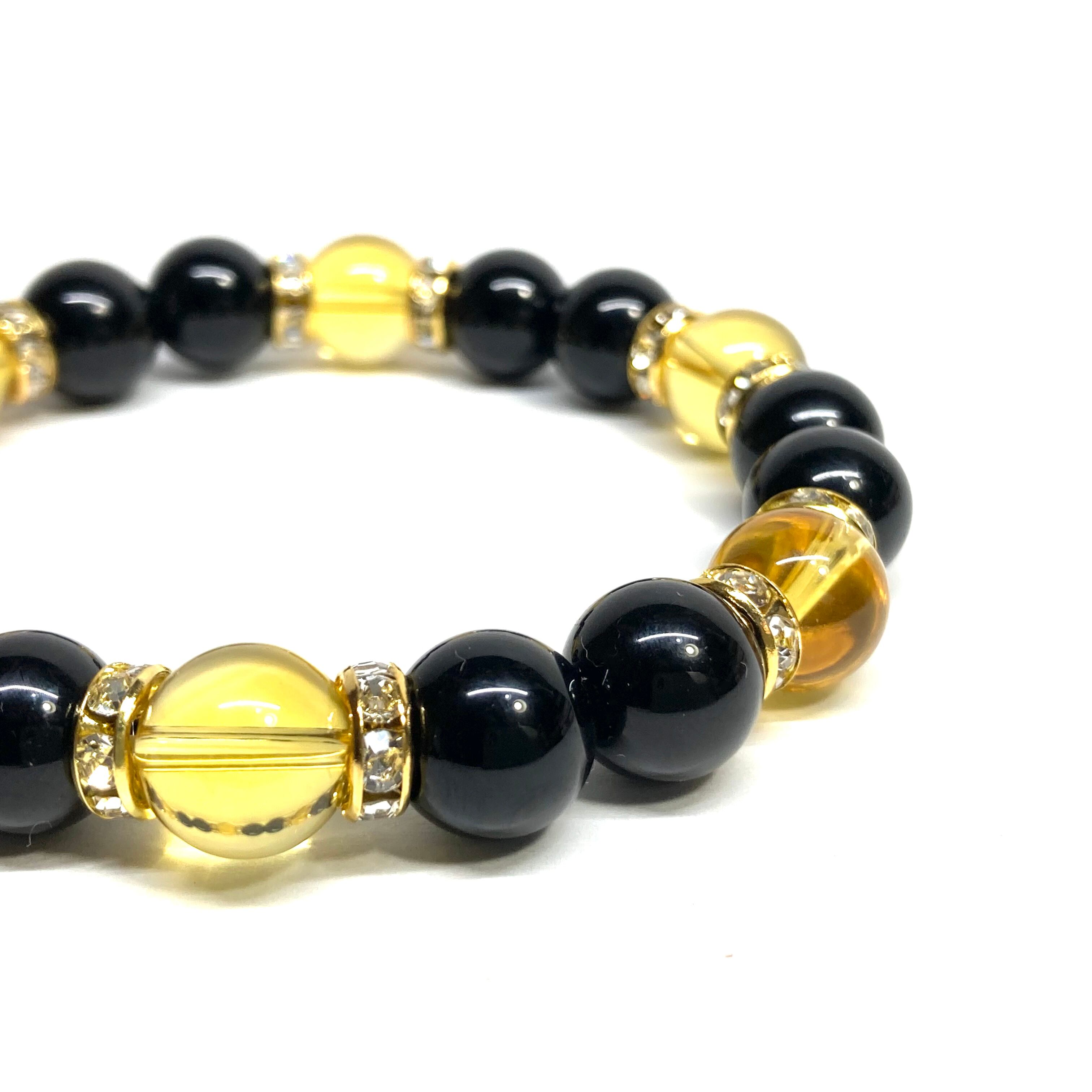こちらは、モリオンとシトリンを組み合わせたパワーストーンブレスレットです。間にはロンデルを挟み高級感あるデザインに仕上げております。石大きさは腕にも馴染みやすいように10mm玉で内径約18cm(伸可能)です。 数に限りがございますので気になる方はお早めにどうぞ。