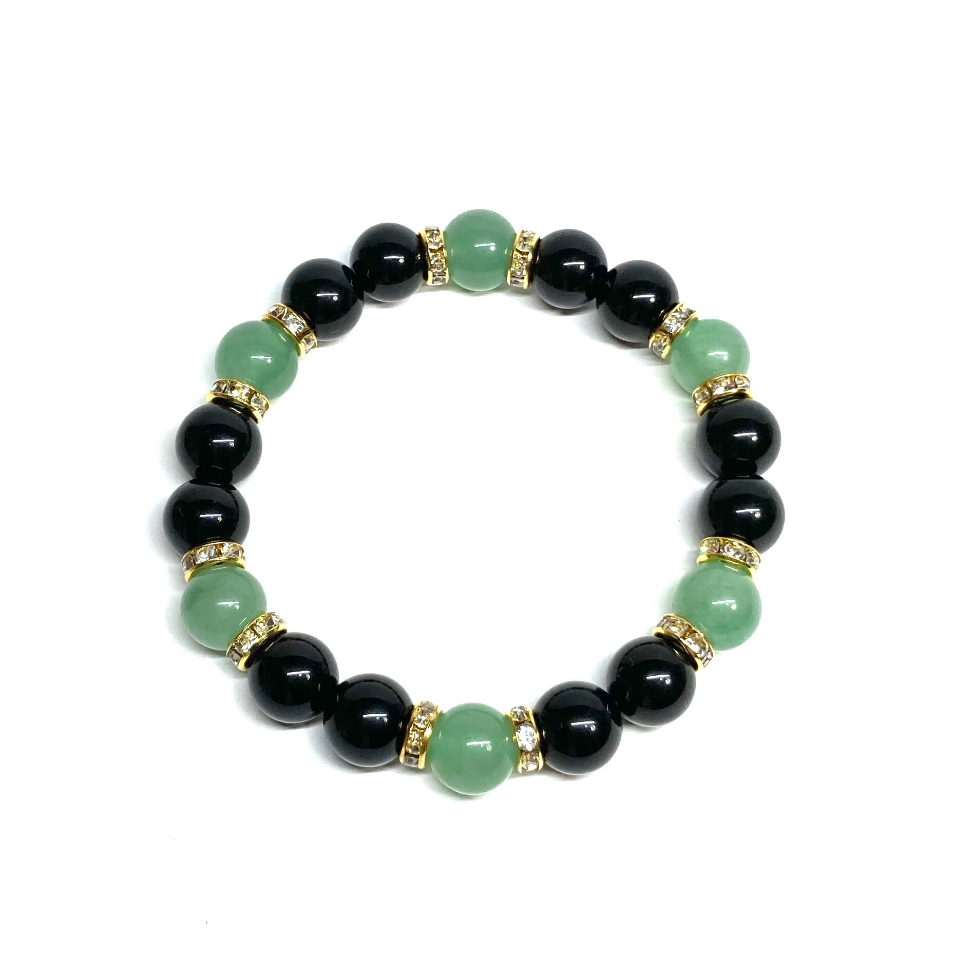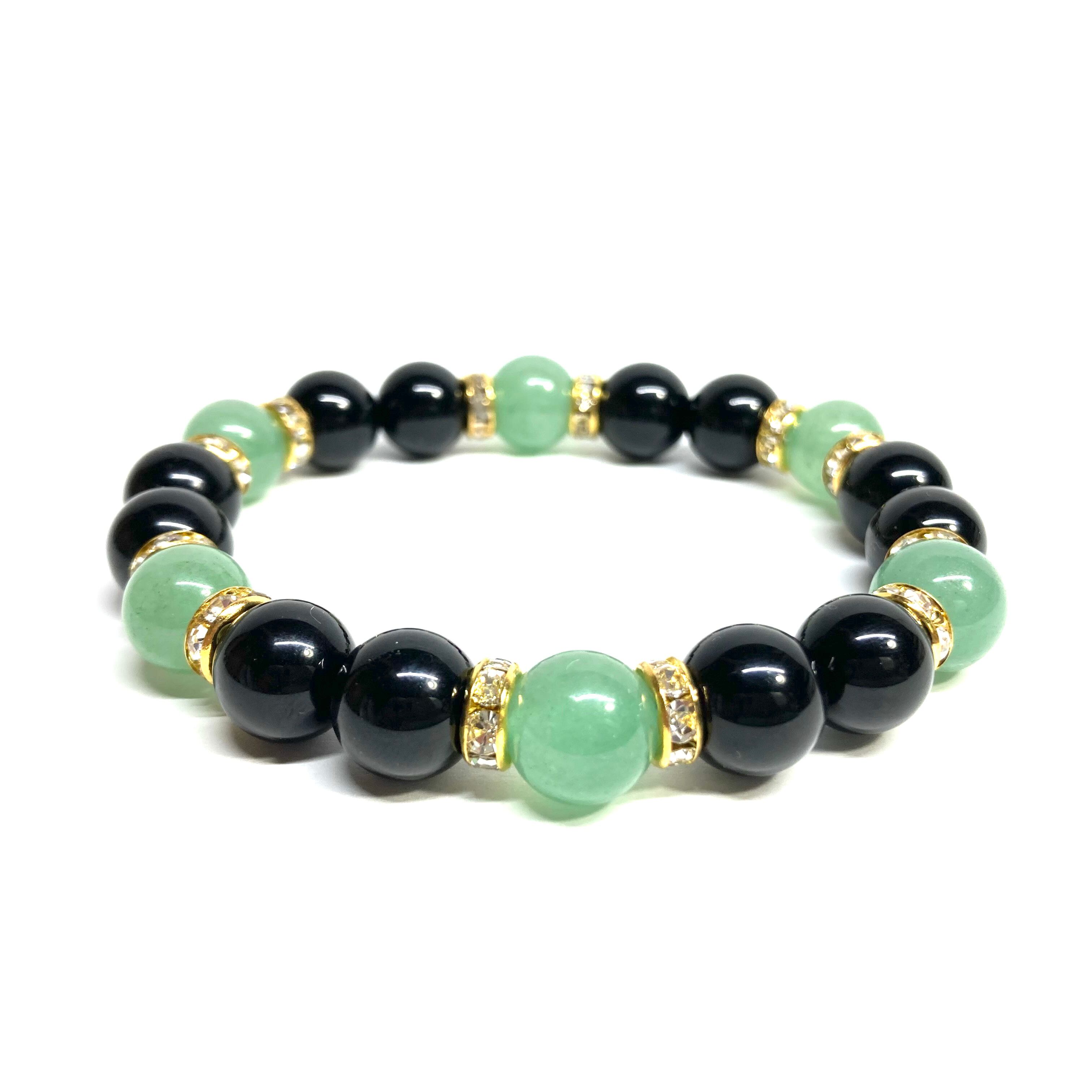 こちらは、モリオンとアベンチュリンを組み合わせたパワーストーンブレスレットです。間にはロンデルを挟み高級感あるデザインに仕上げております。石大きさは腕にも馴染みやすいように10mm玉で内径約18cm(伸可能)です。 数に限りがございますので気になる方はお早めにどうぞ。