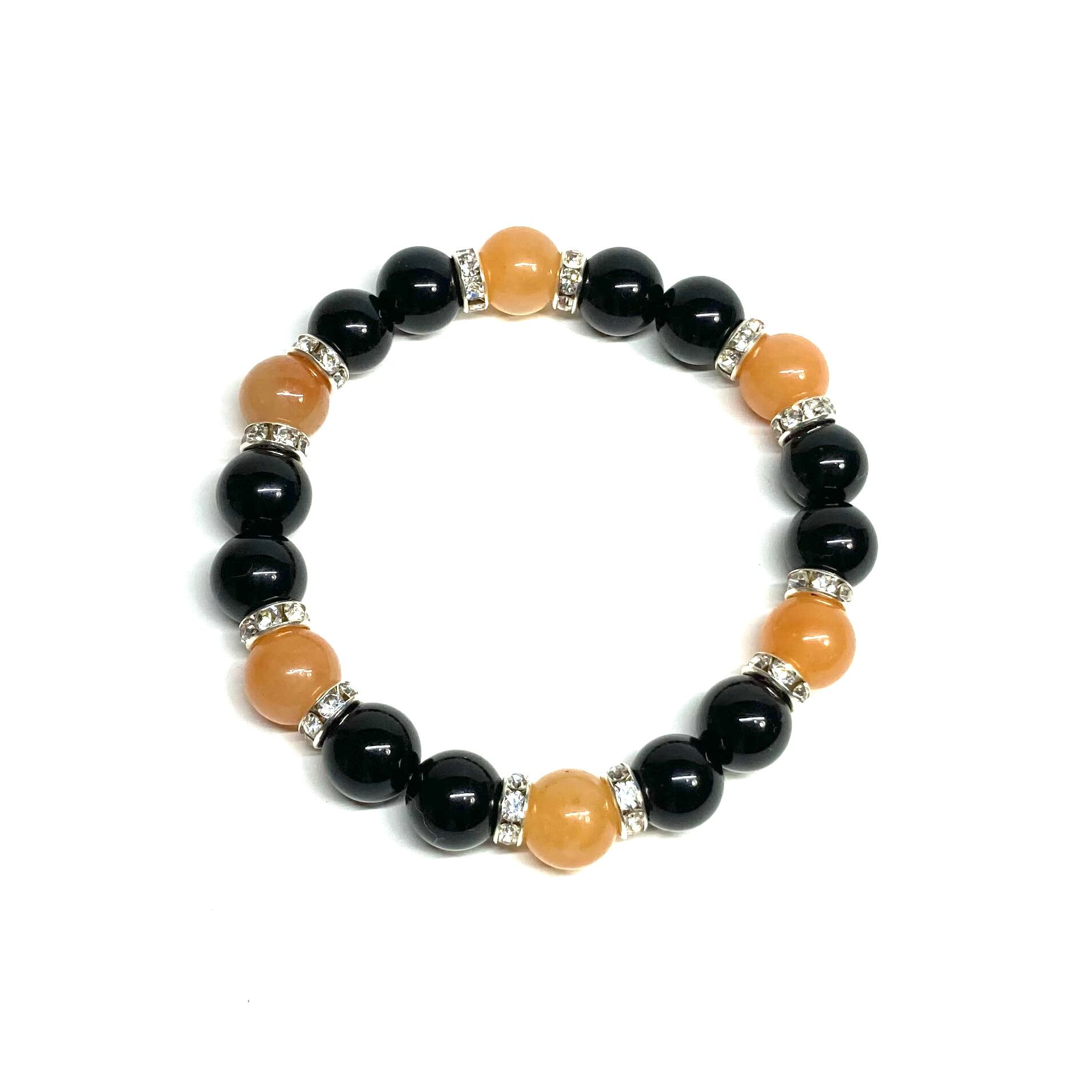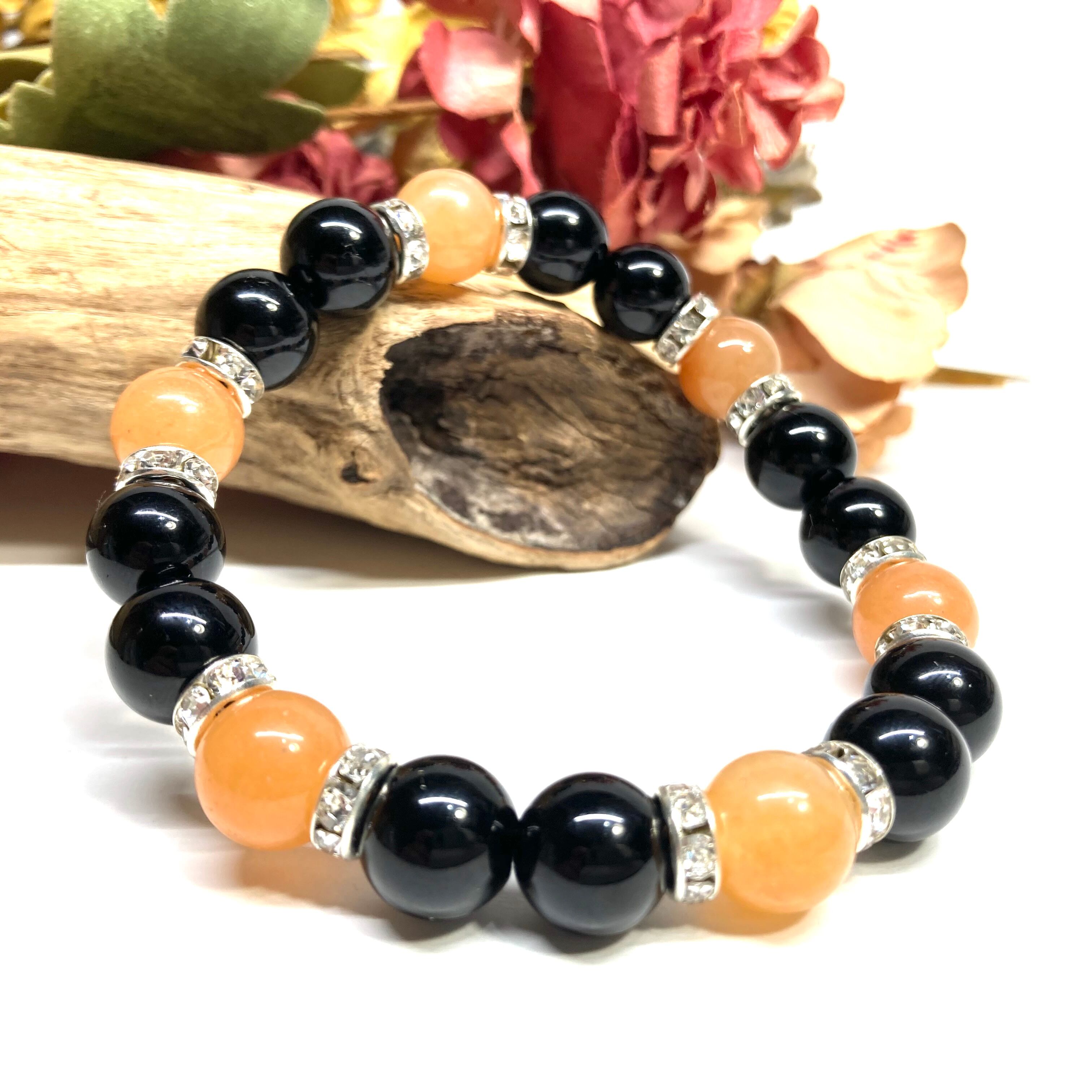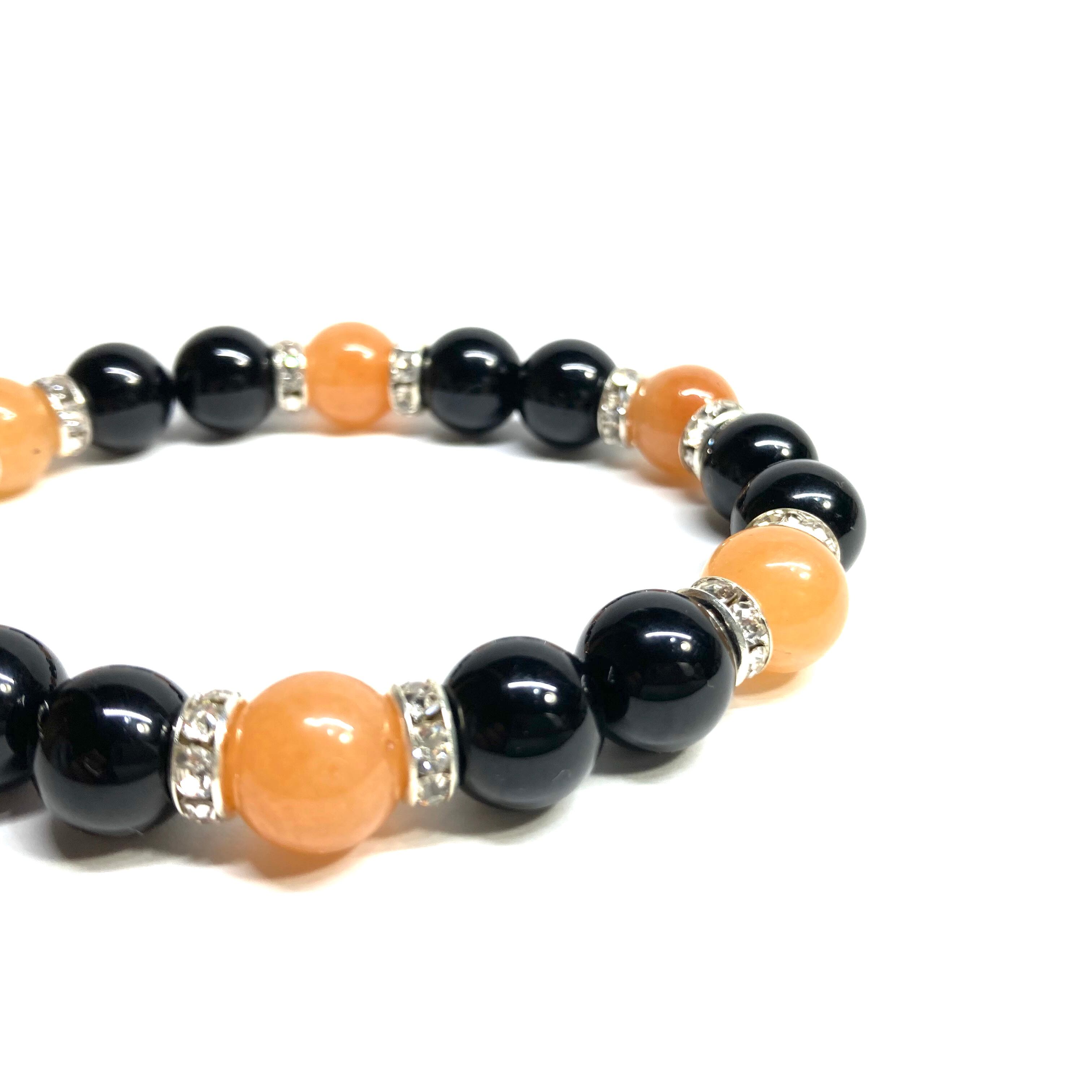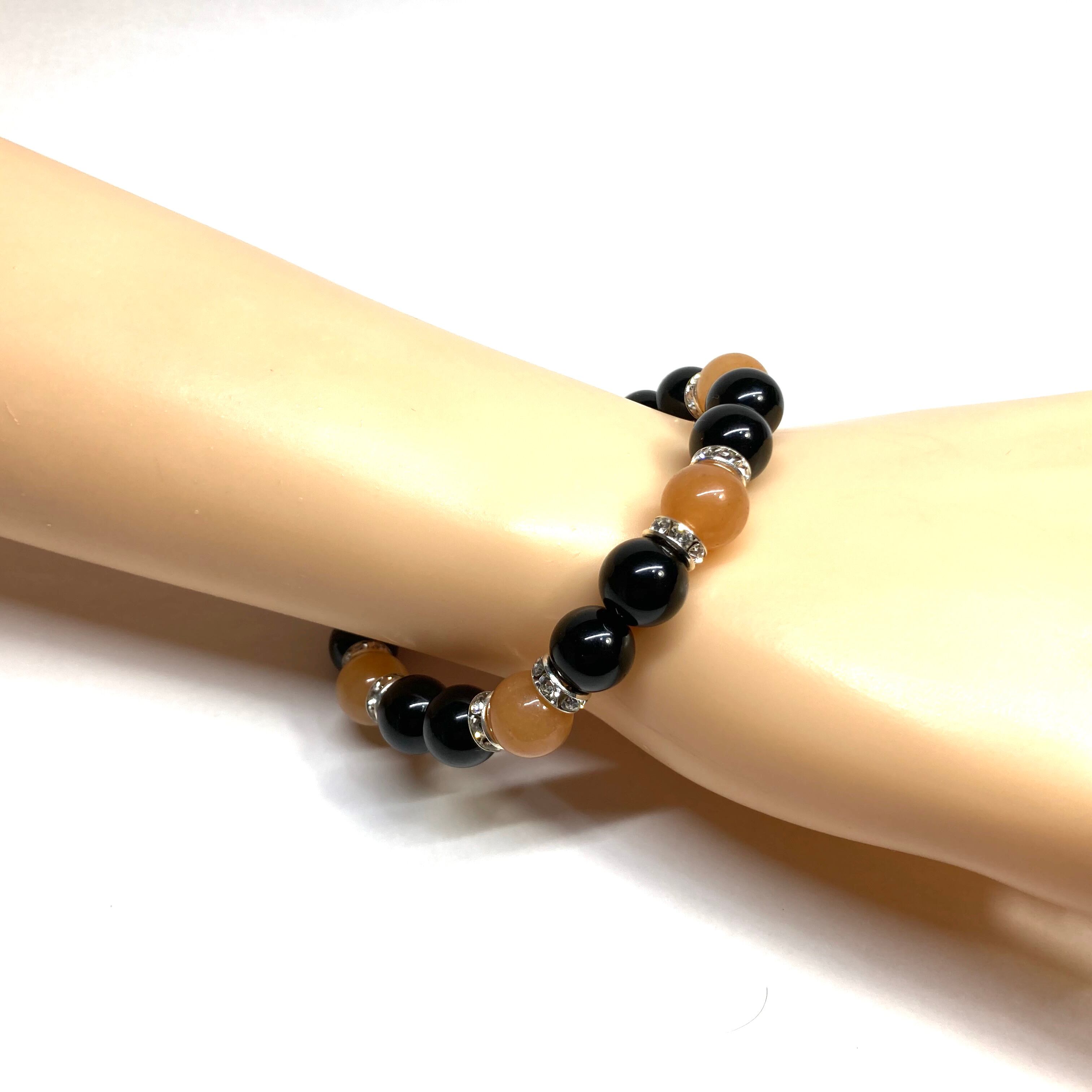 こちらは、モリオンとレッドアベンチュリンを組み合わせたパワーストーンブレスレットです。間にはロンデルを挟み高級感あるデザインに仕上げております。石大きさは腕にも馴染みやすいように10mm玉で内径約18cm(伸可能)です。 数に限りがございますので気になる方はお早めにどうぞ。