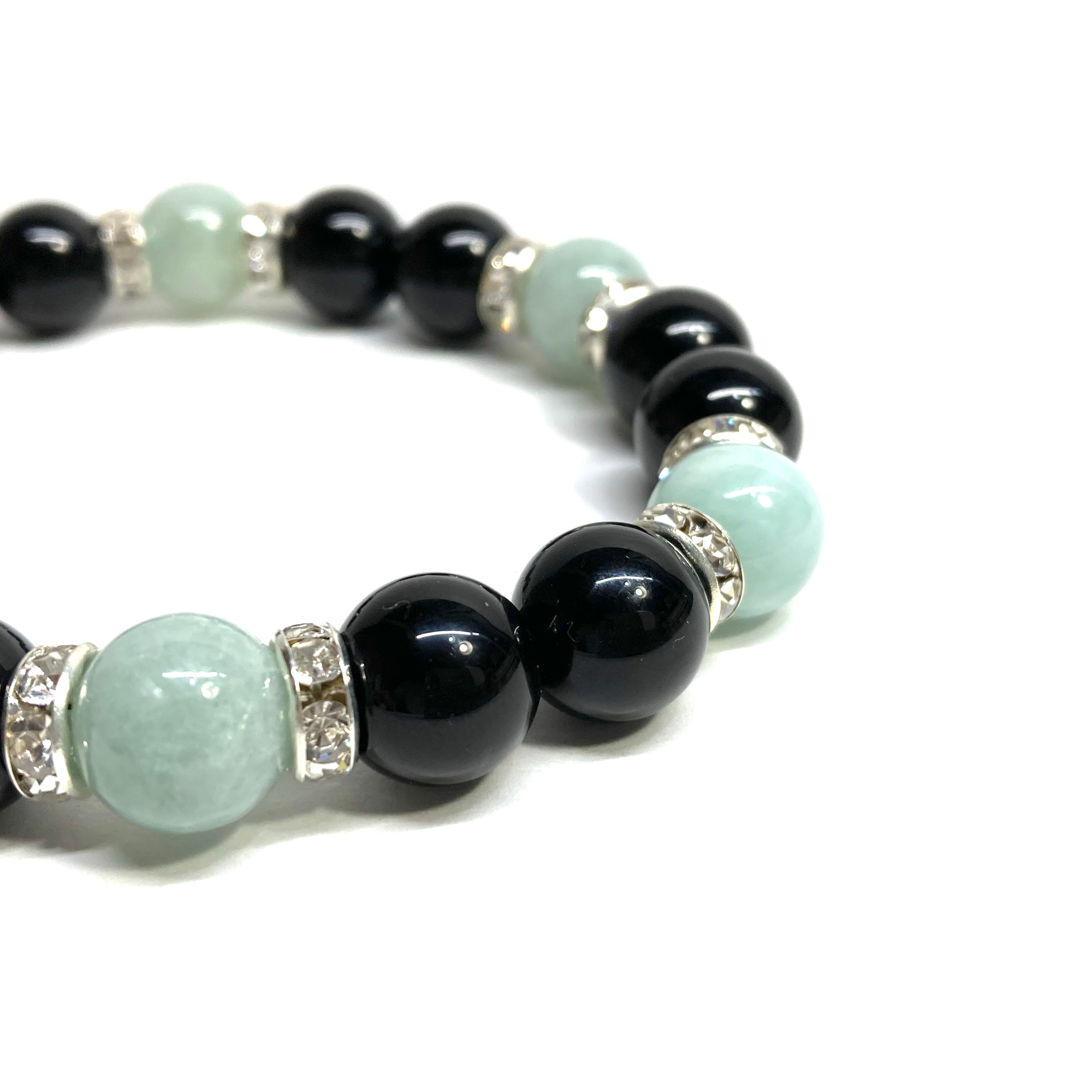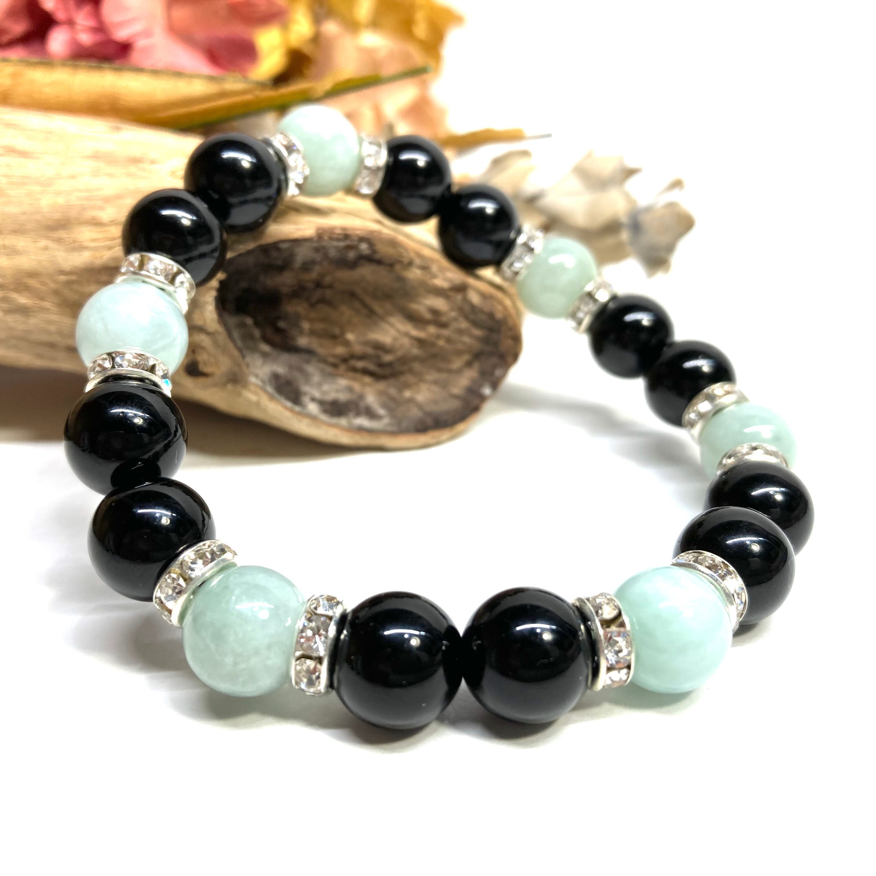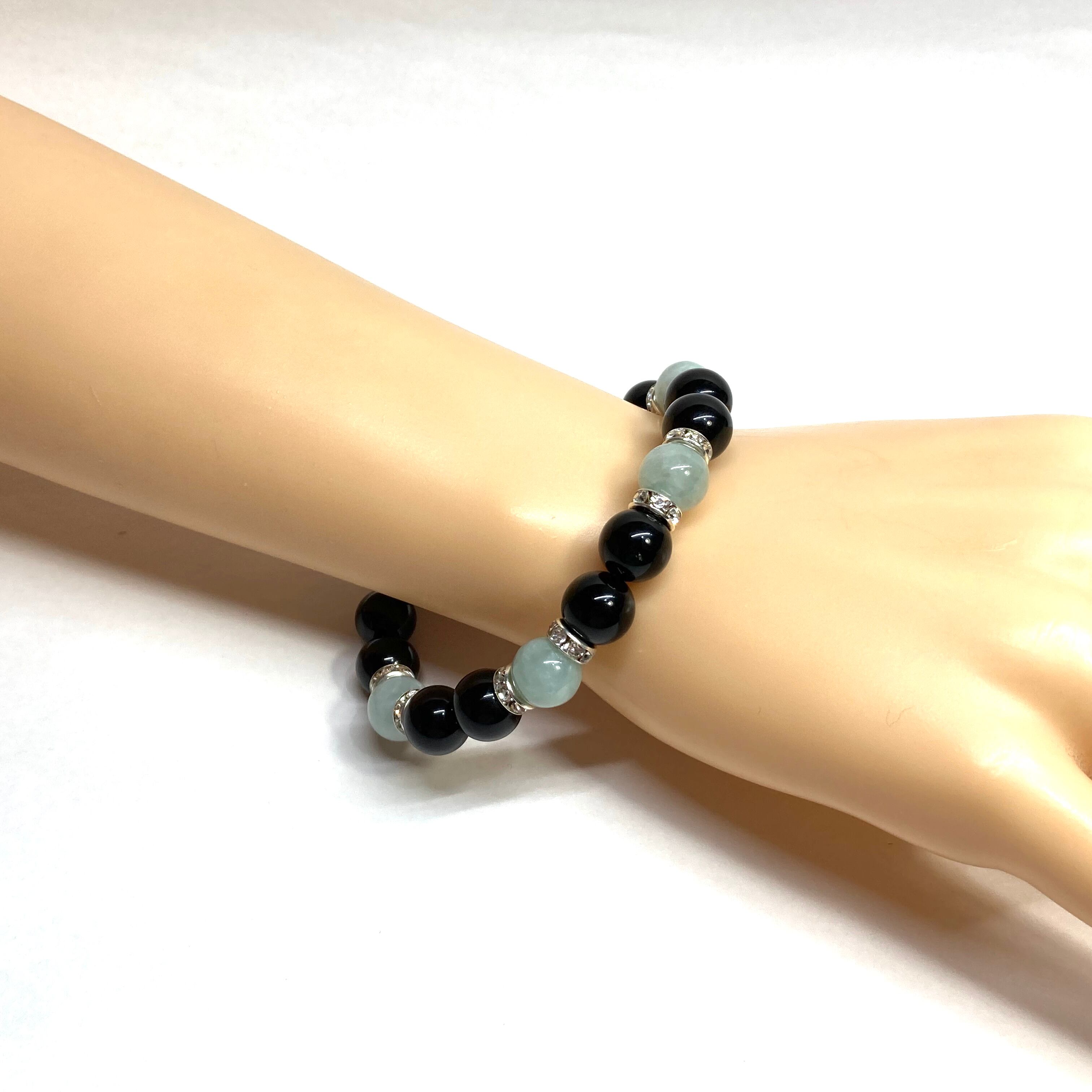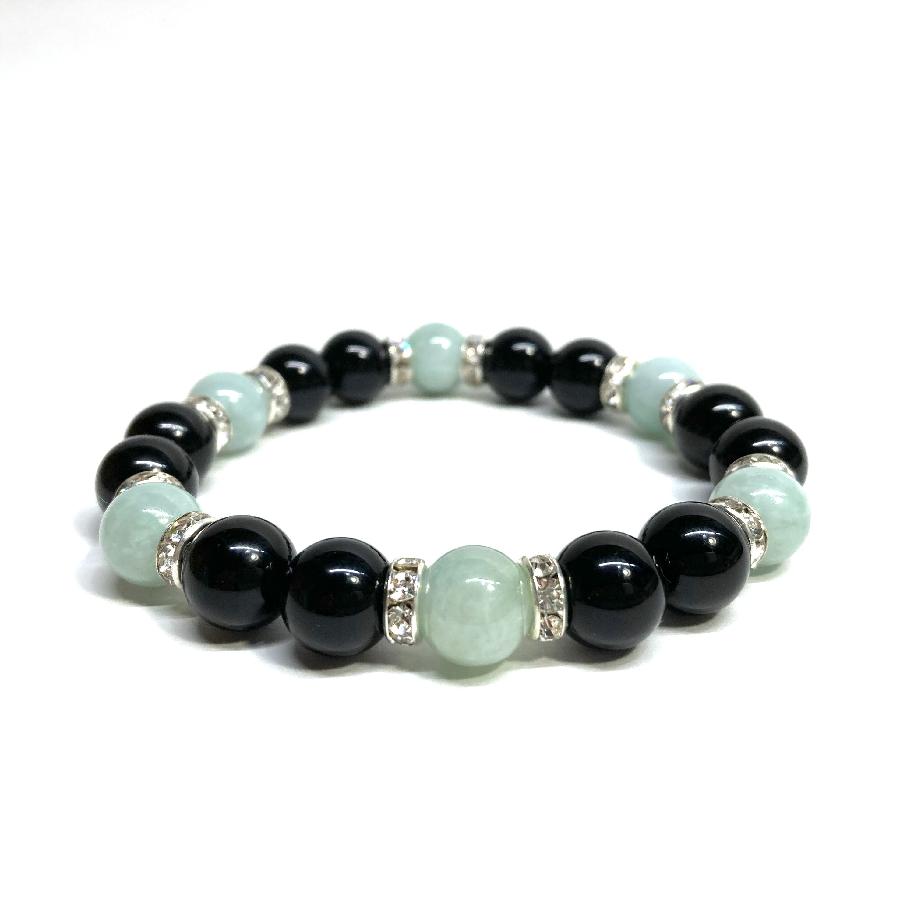 こちらは、モリオンとビルマ翡翠を組み合わせたパワーストーンブレスレットです。間にはロンデルを挟み高級感あるデザインに仕上げております。石大きさは腕にも馴染みやすいように10mm玉で内径約18cm(伸可能)です。 数に限りがございますので気になる方はお早めにどうぞ。