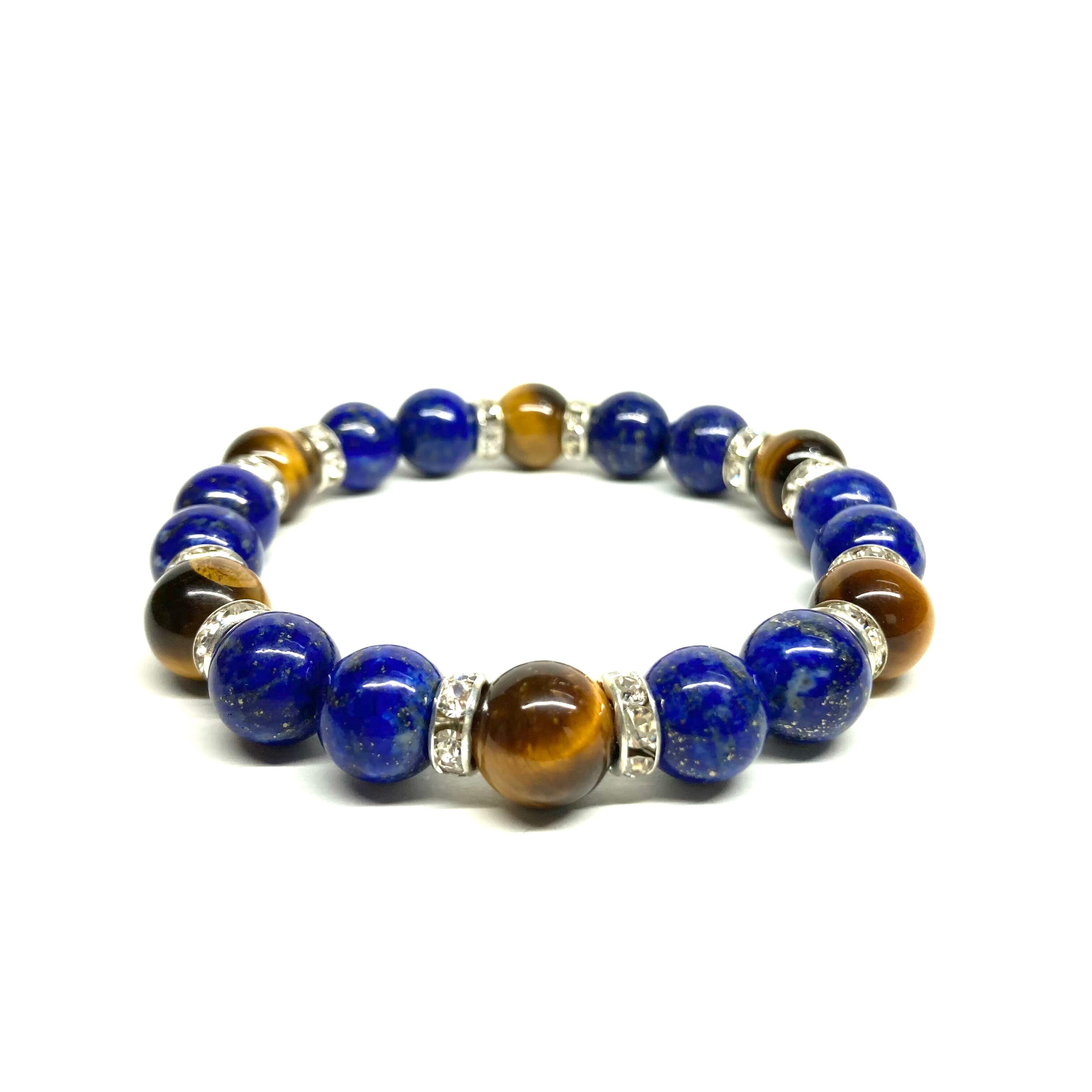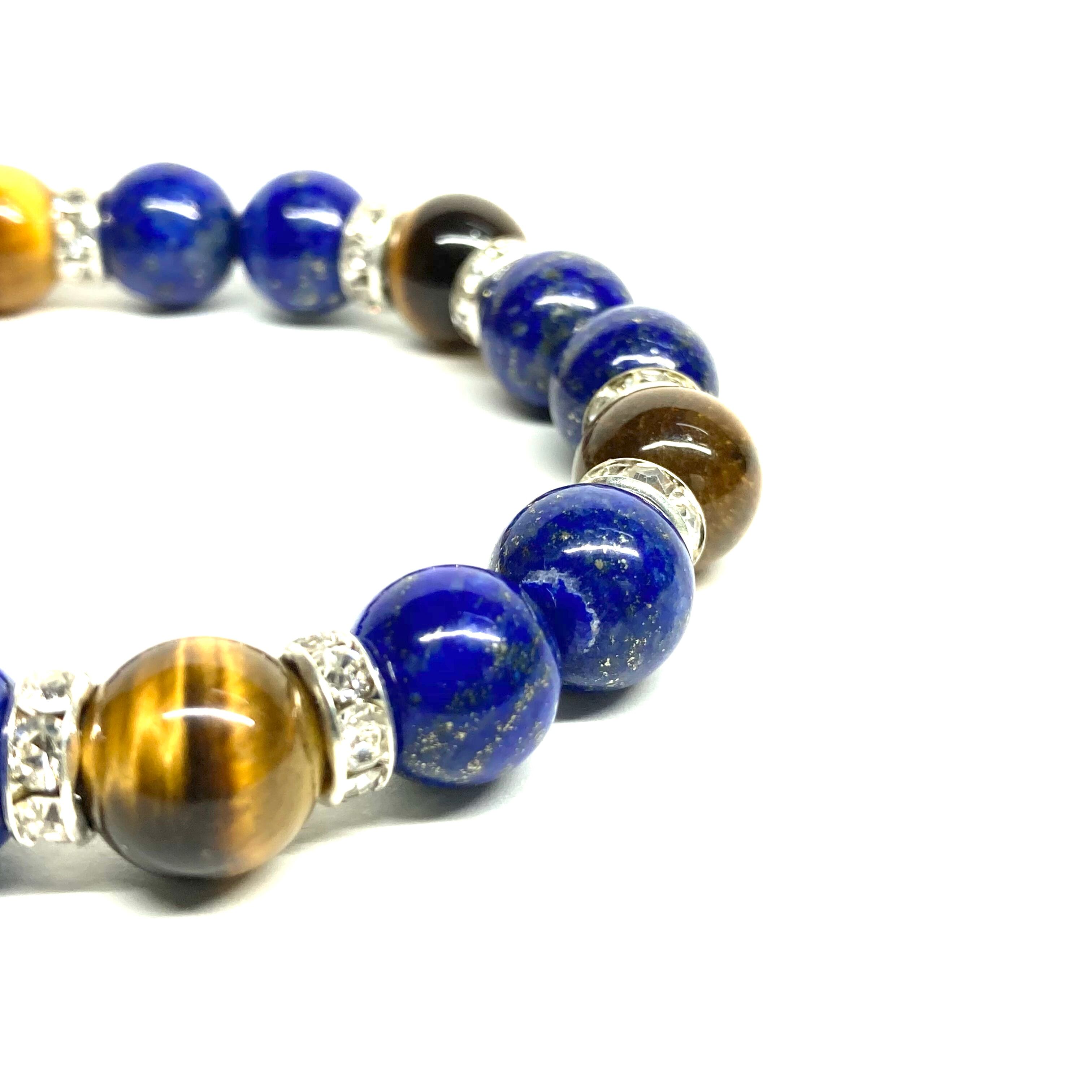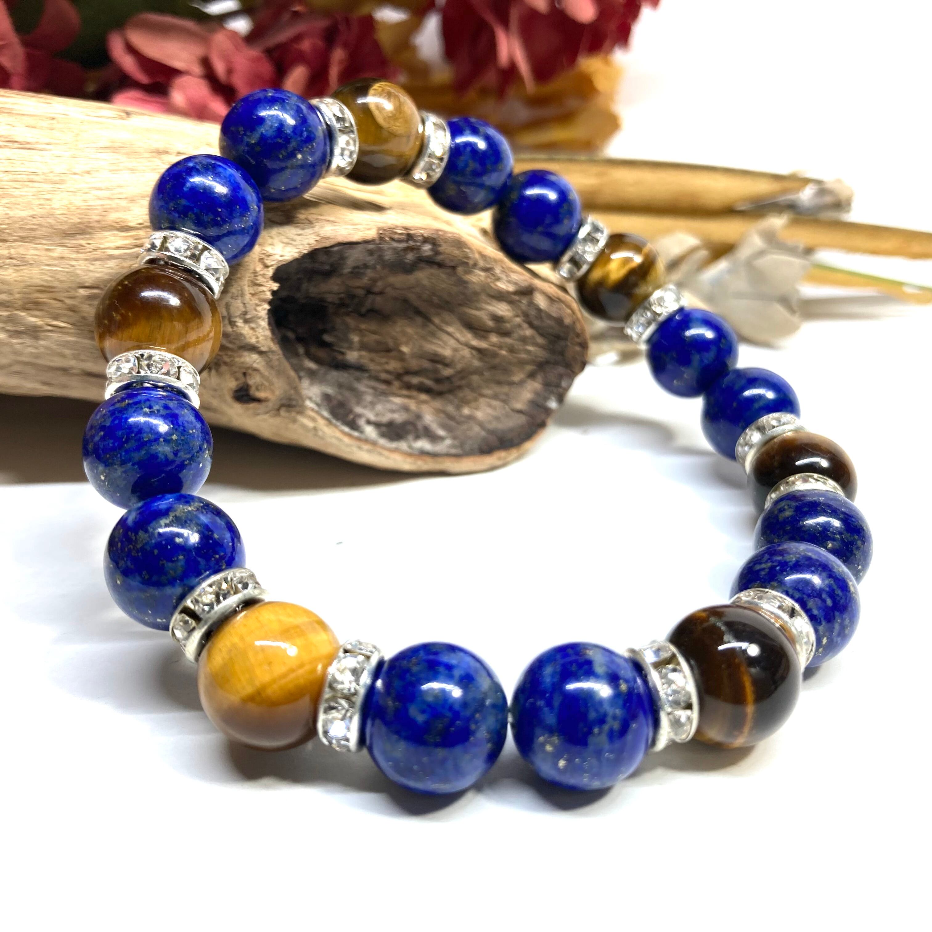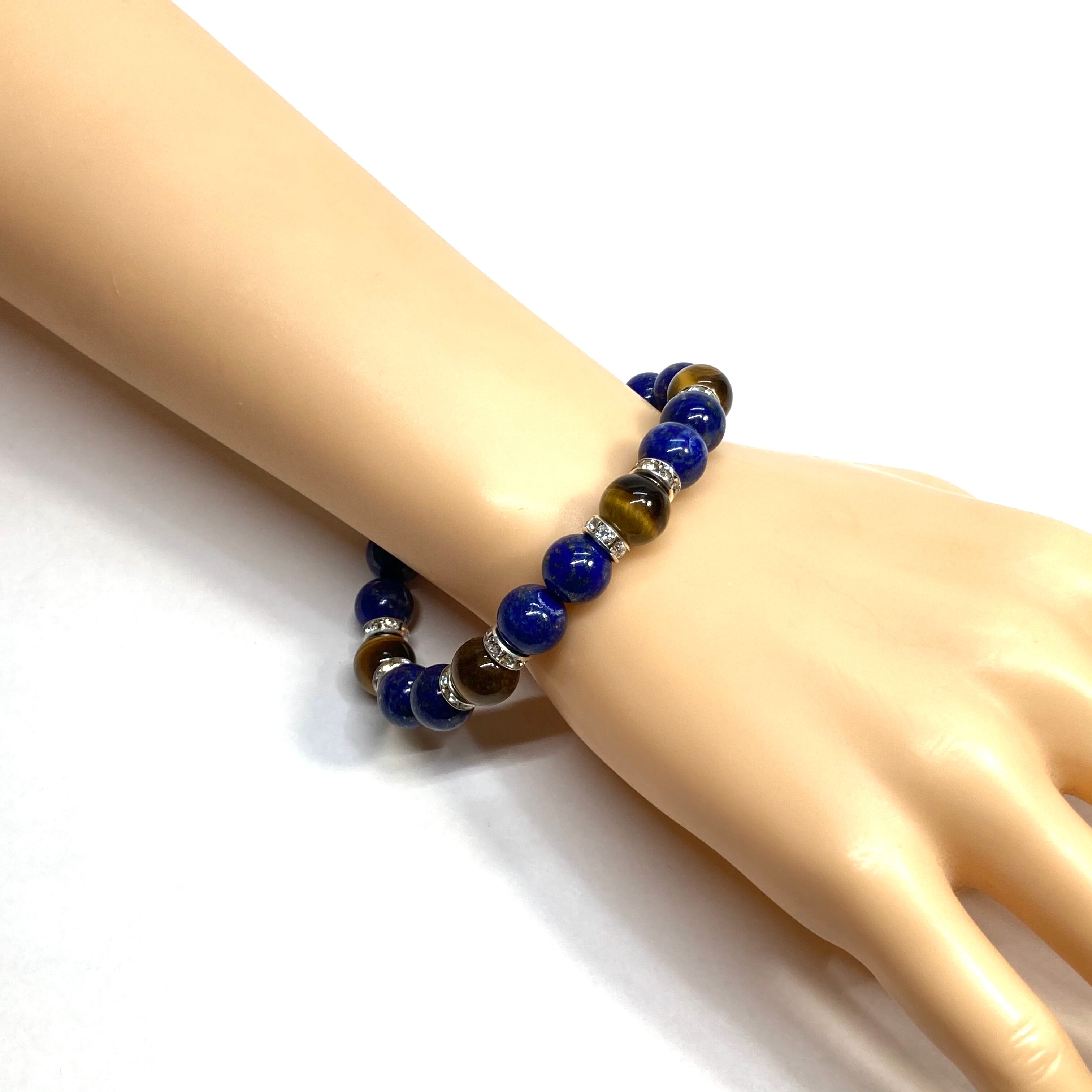 こちらは、ラピスラズリとタイガーアイを組み合わせたパワーストーンブレスレットです。間にはロンデルを挟み高級感あるデザインに仕上げております。石大きさは腕にも馴染みやすいように10mm玉で内周 約18cm(伸可能)です。 数に限りがございますので気になる方はお早めにどうぞ。