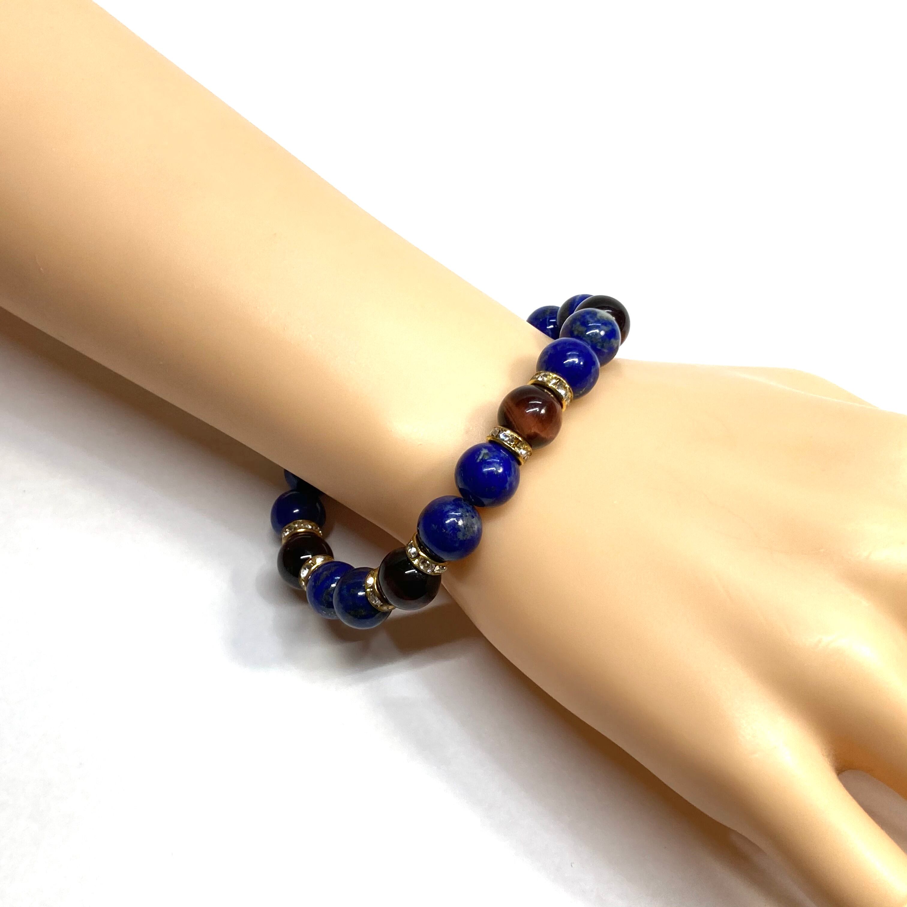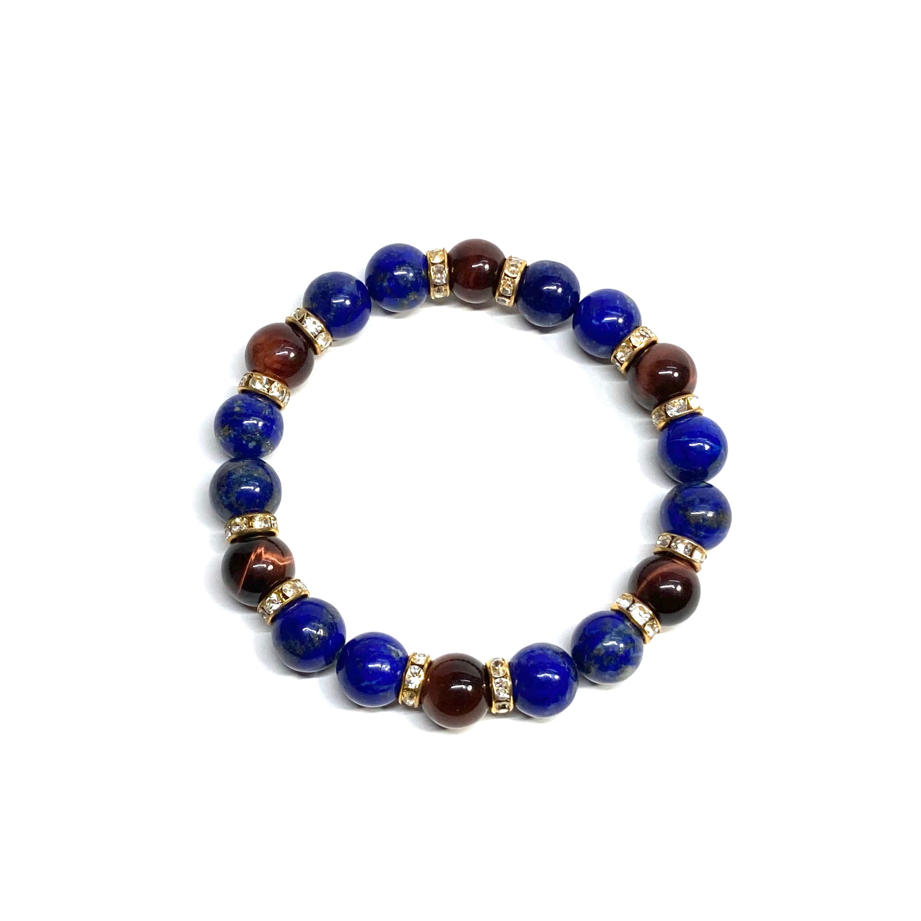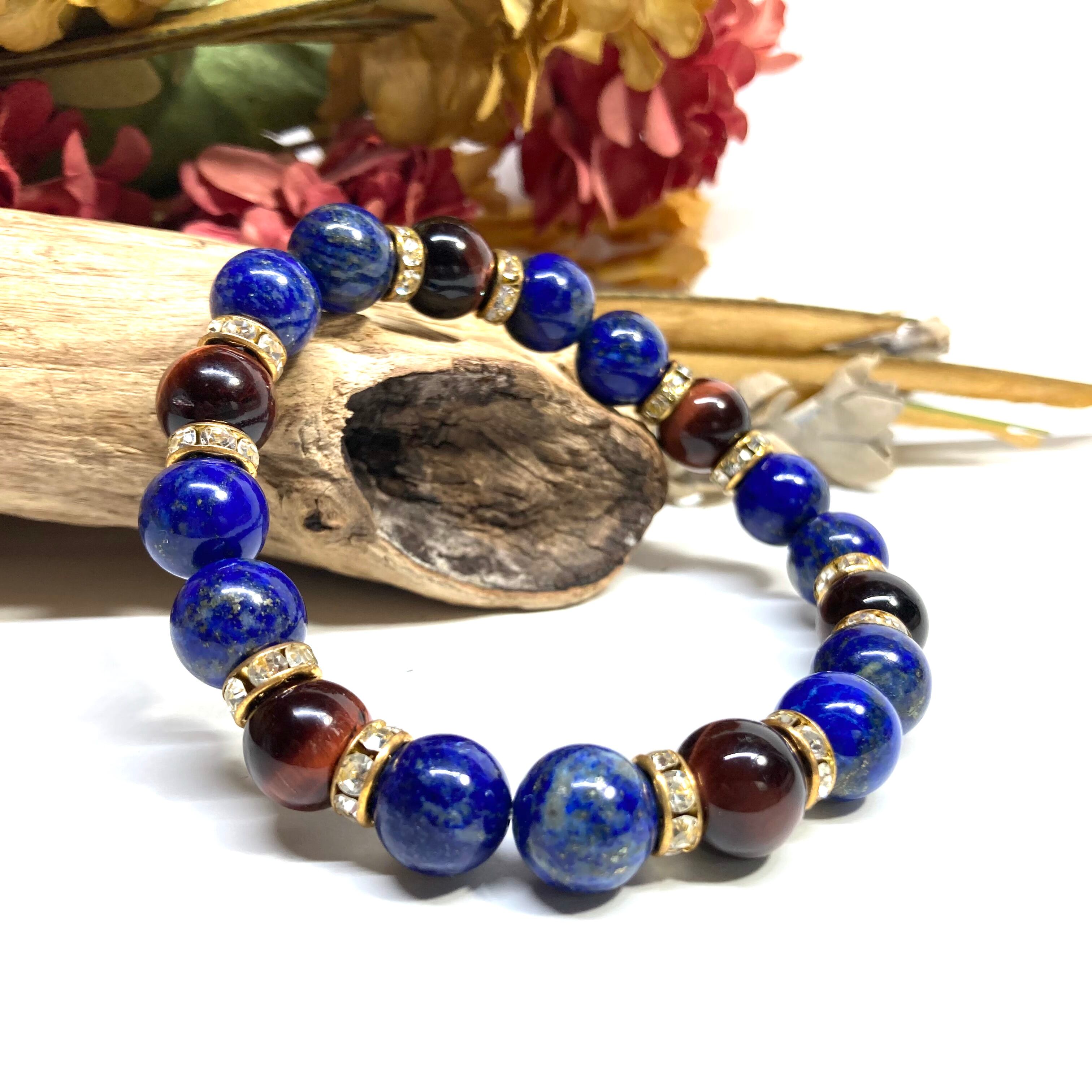 こちらは、ラピスラズリとレッドタイガーアイを組み合わせたパワーストーンブレスレットです。間にはロンデルを挟み高級感あるデザインに仕上げております。石大きさは腕にも馴染みやすいように10mm玉で内径約18cm(伸可能)です。 数に限りがございますので気になる方はお早めにどうぞ。