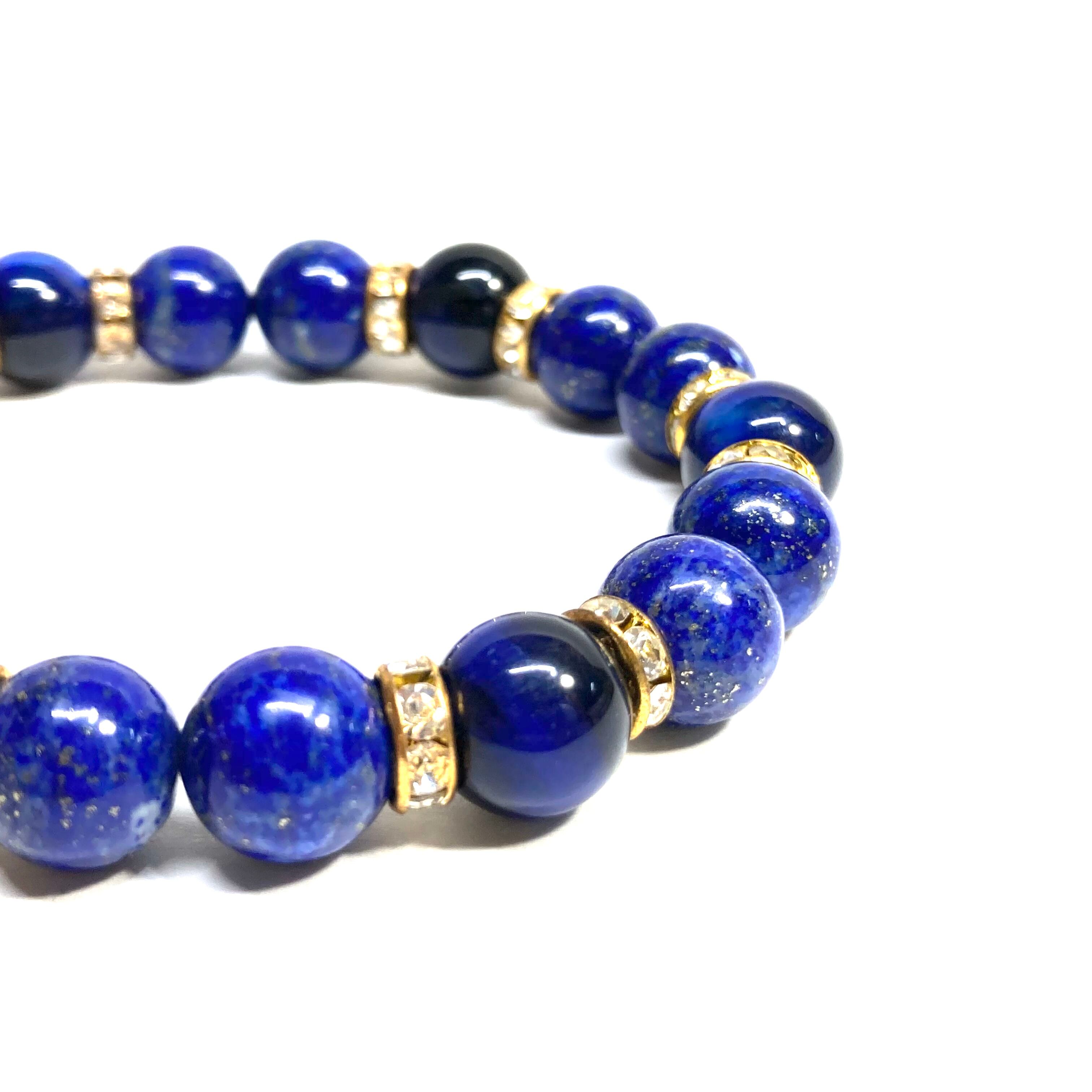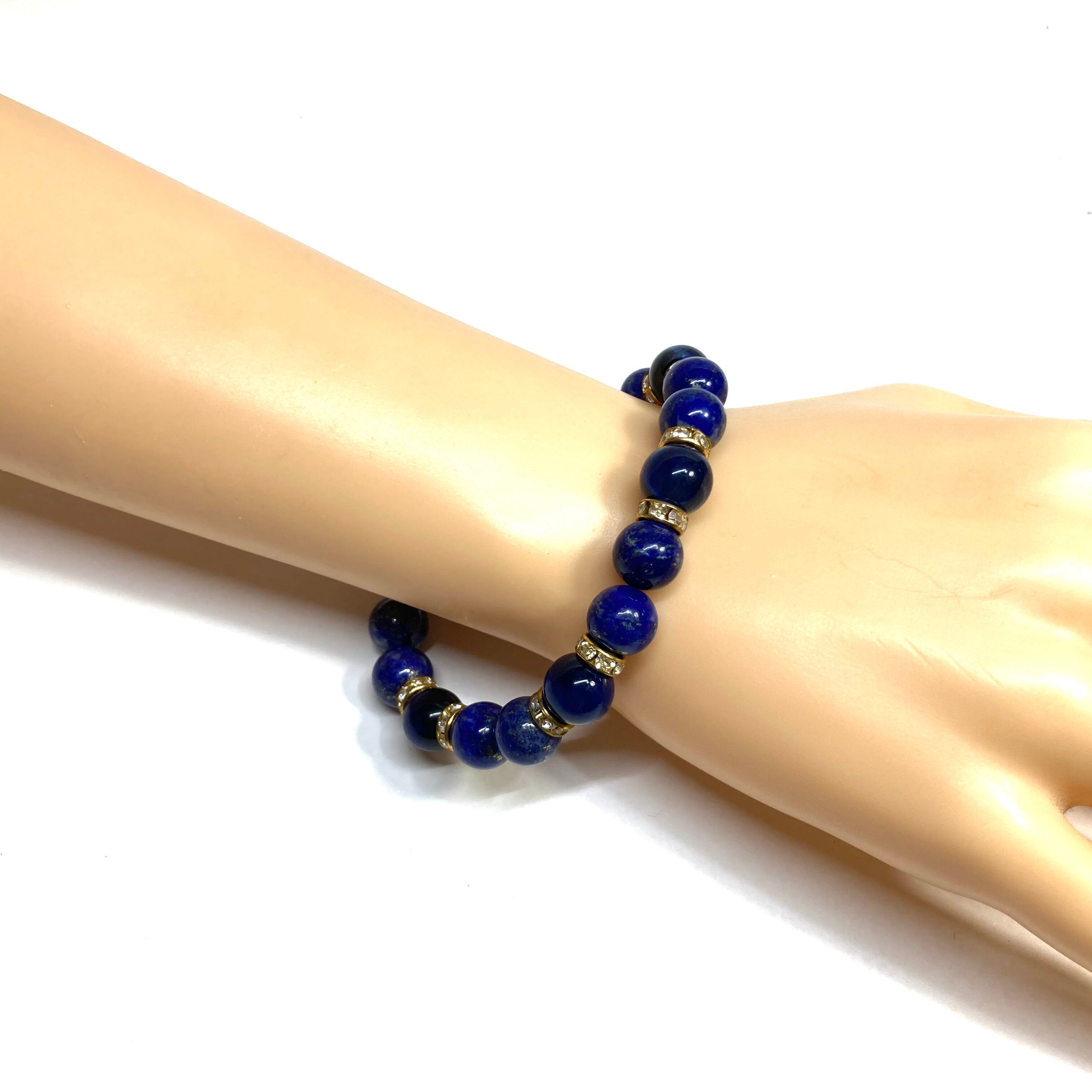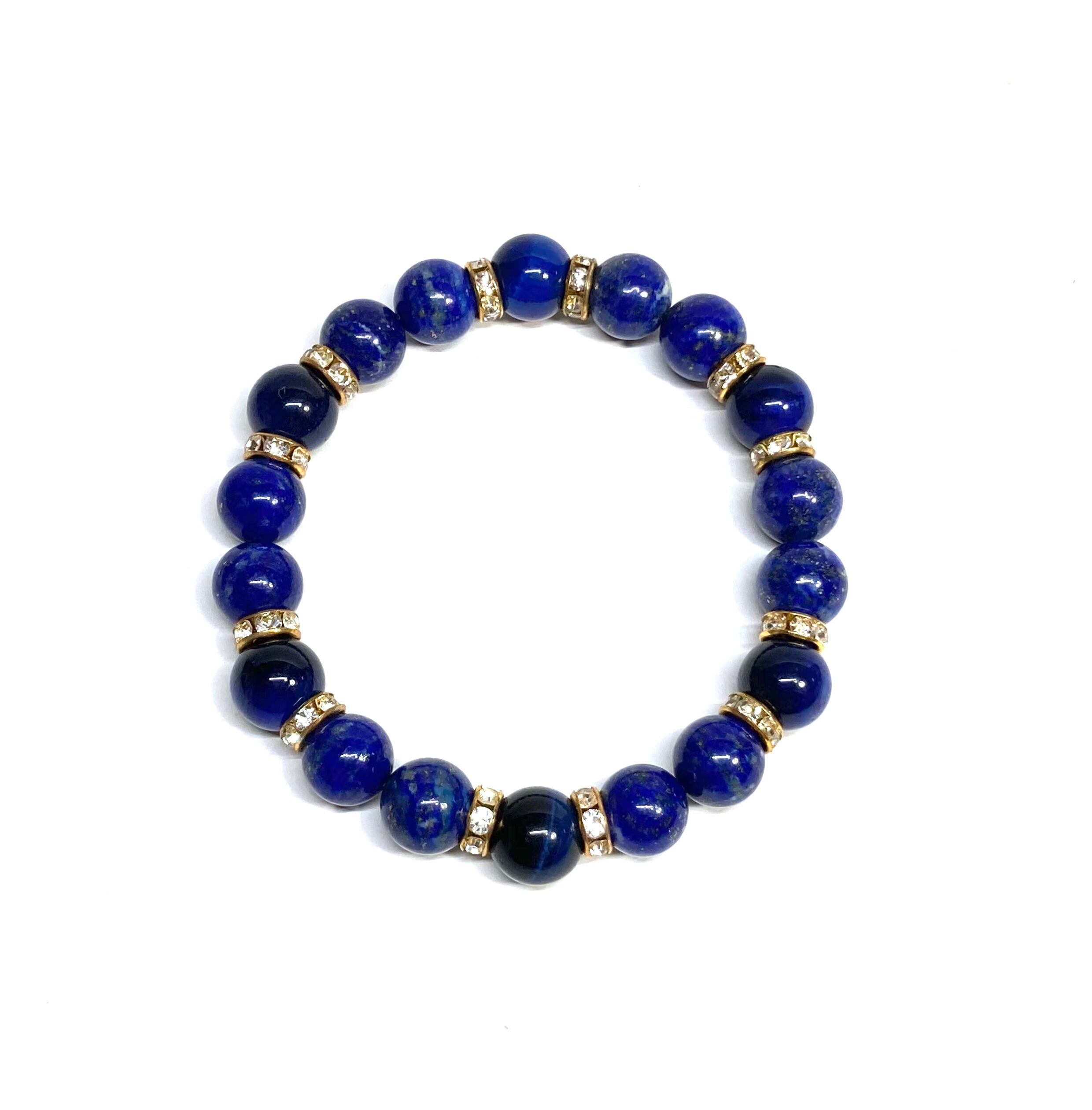 こちらは、ラピスラズリとブルータイガーアイを組み合わせたパワーストーンブレスレットです。間にはロンデルを挟み高級感あるデザインに仕上げております。石大きさは腕にも馴染みやすいように10mm玉で内径約18cm(伸可能)です。 数に限りがございますので気になる方はお早めにどうぞ。