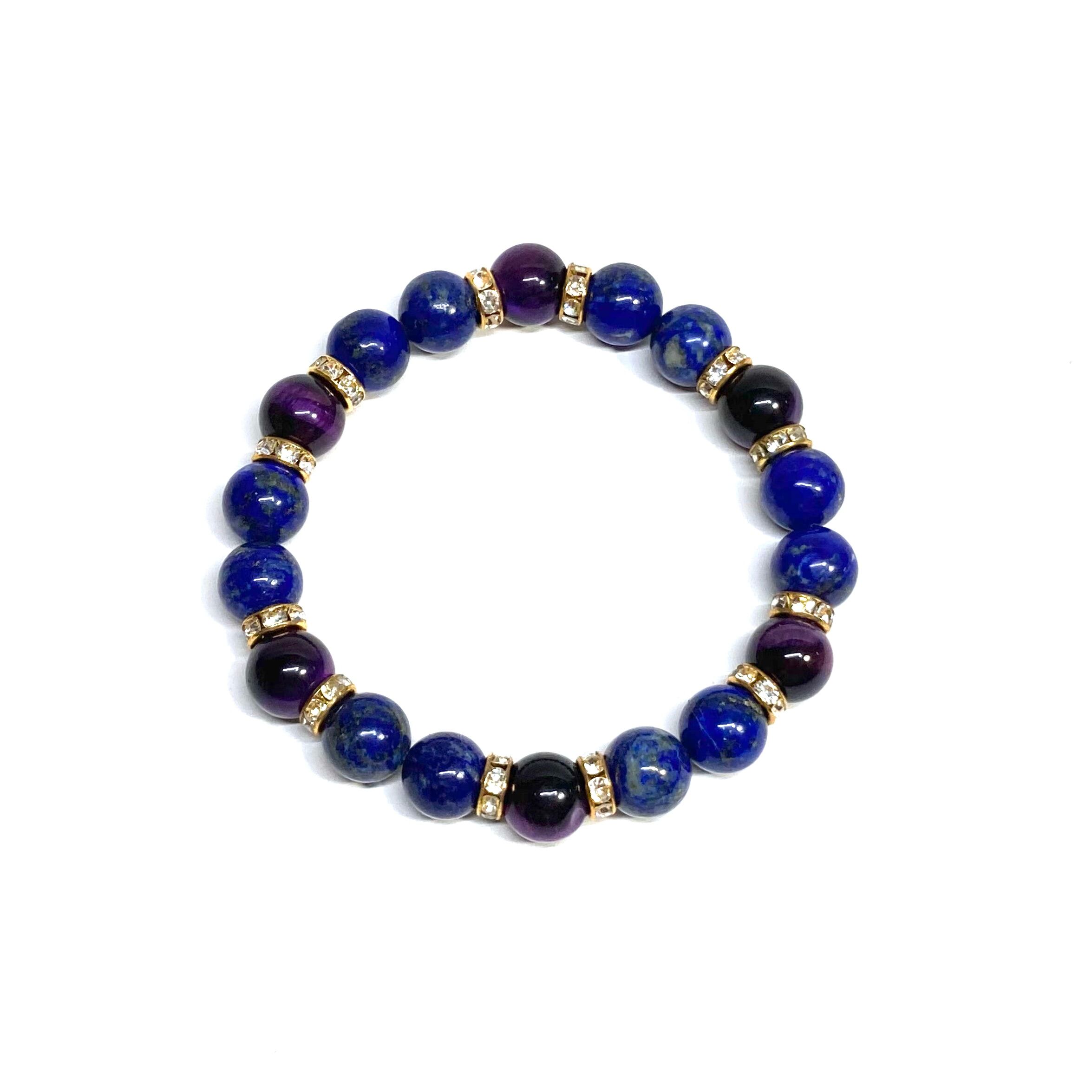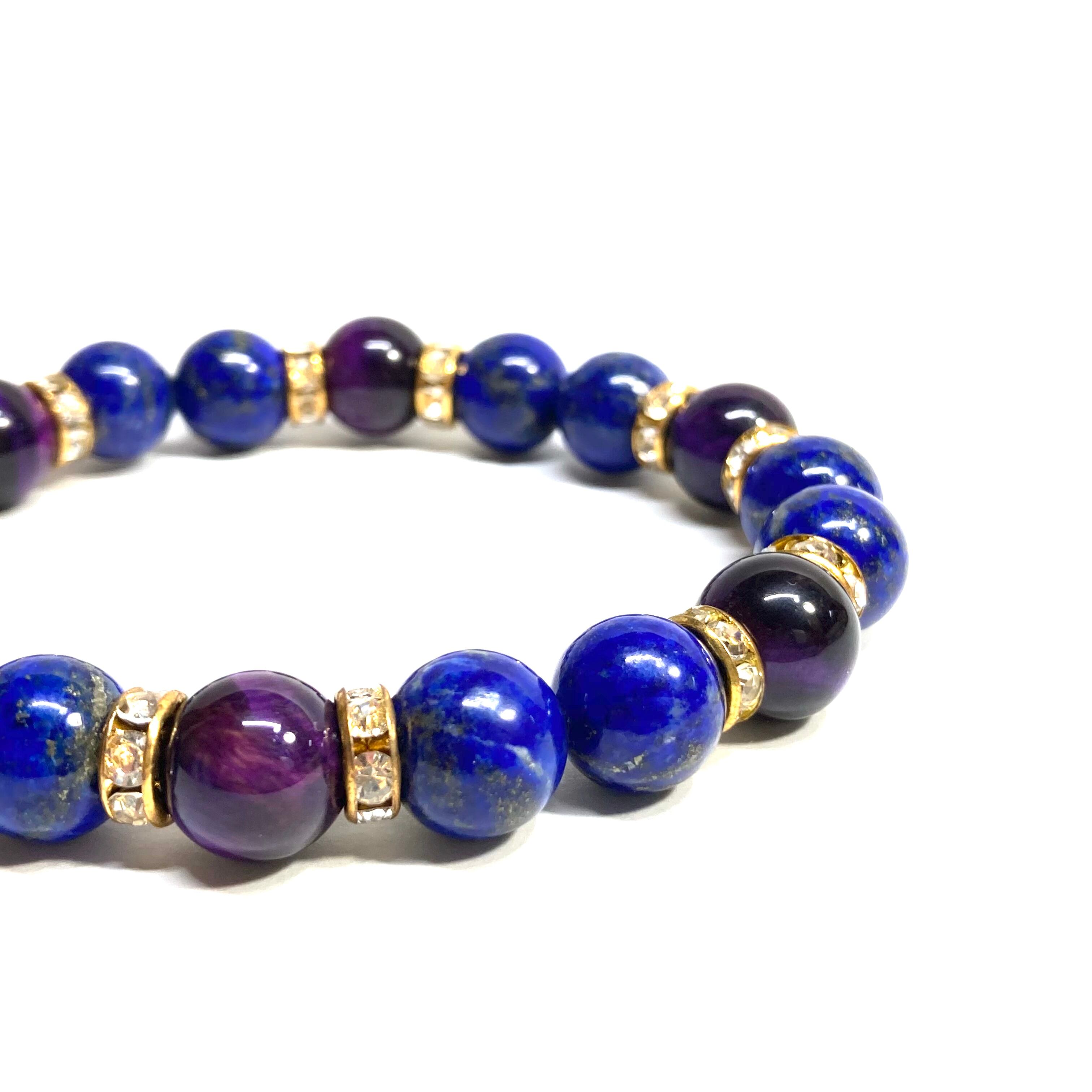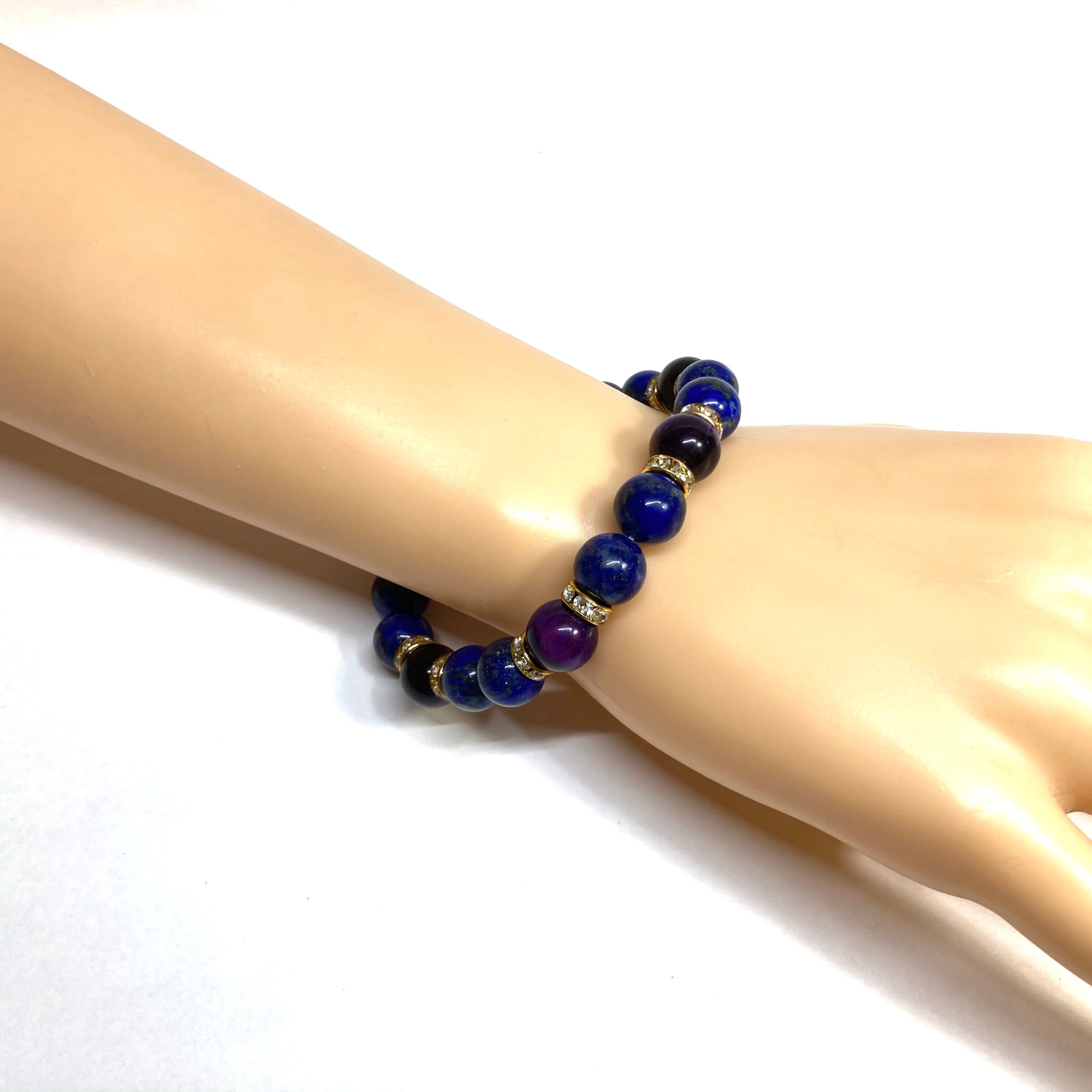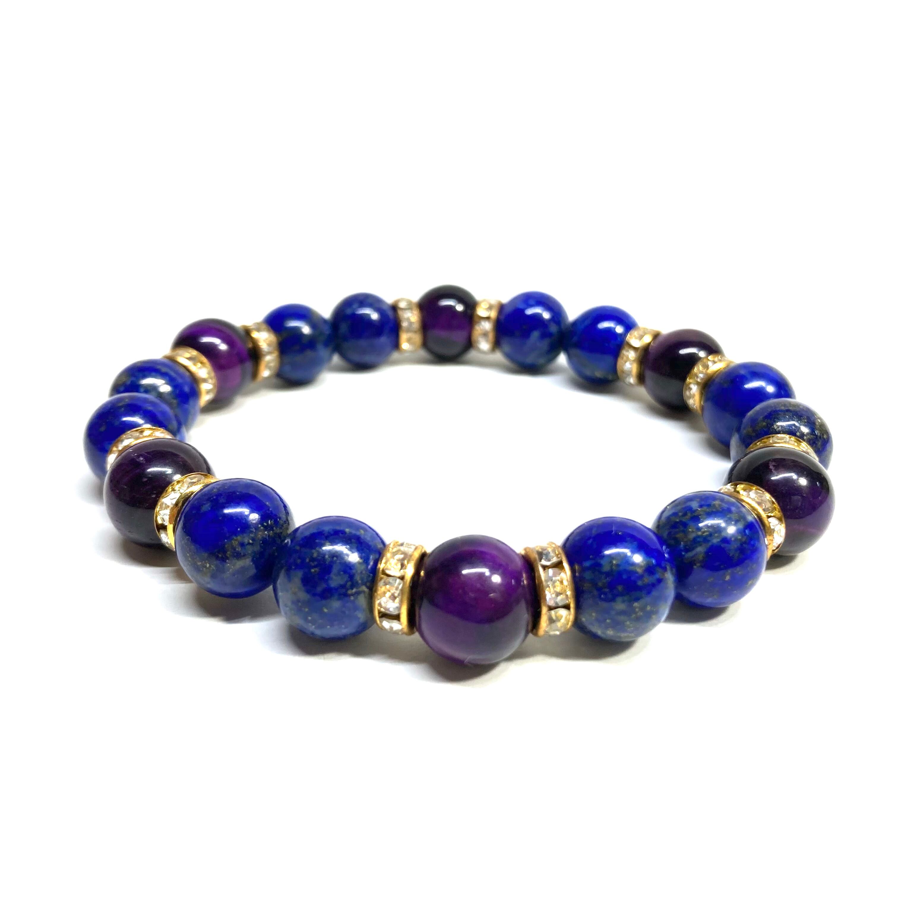 こちらは、ラピスラズリとパープル タイガーアイを組み合わせたパワーストーンブレスレットです。間にはロンデルを挟み高級感あるデザインに仕上げております。石大きさは腕にも馴染みやすいように10mm玉で内径約18cm(伸可能)です。 数に限りがございますので気になる方はお早めにどうぞ。