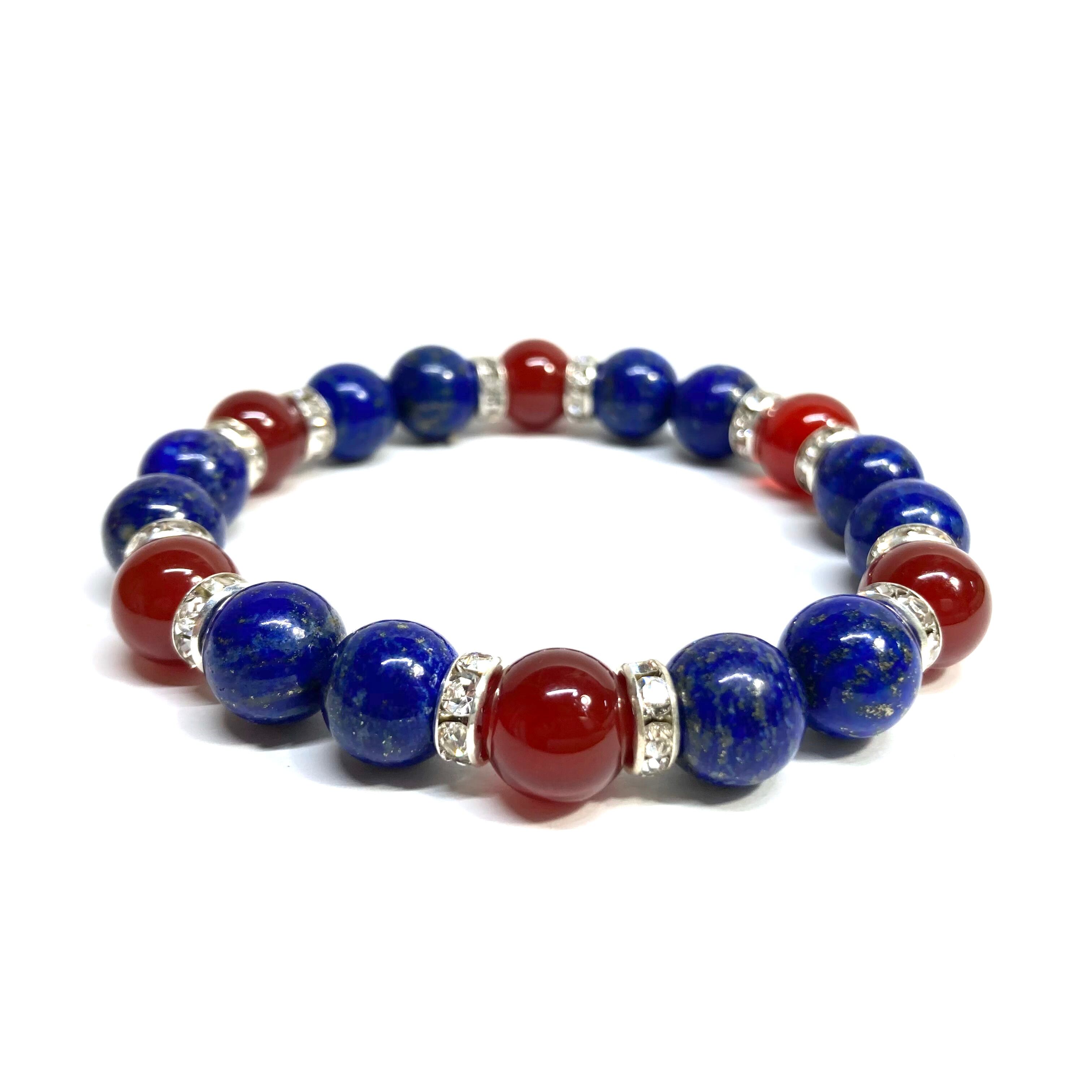 こちらは、ラピスラズリと赤瑪瑙を組み合わせたパワーストーンブレスレットです。間にはロンデルを挟み高級感あるデザインに仕上げております。石大きさは腕にも馴染みやすいように10mm玉で内径約18cm(伸可能)です。 数に限りがございますので気になる方はお早めにどうぞ。