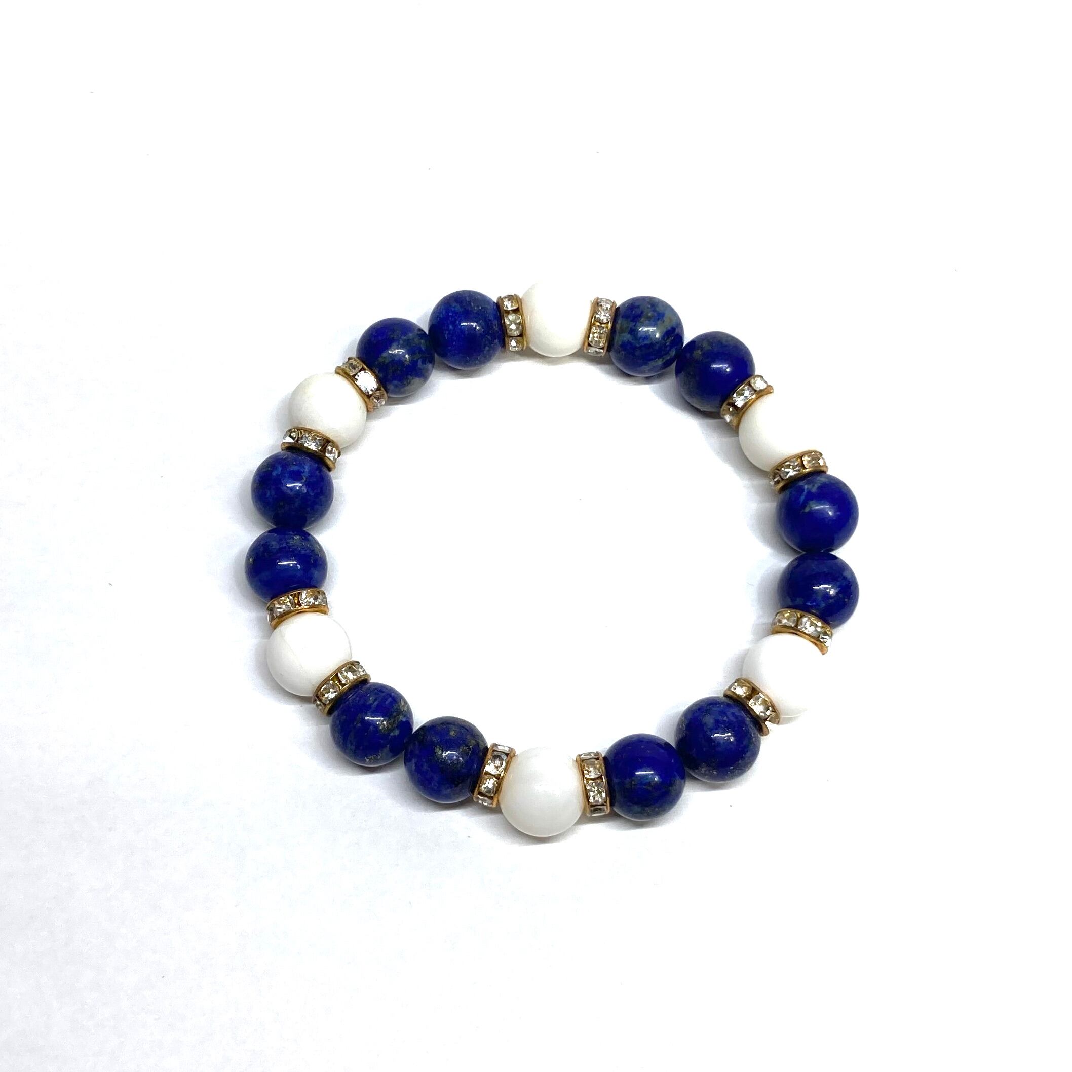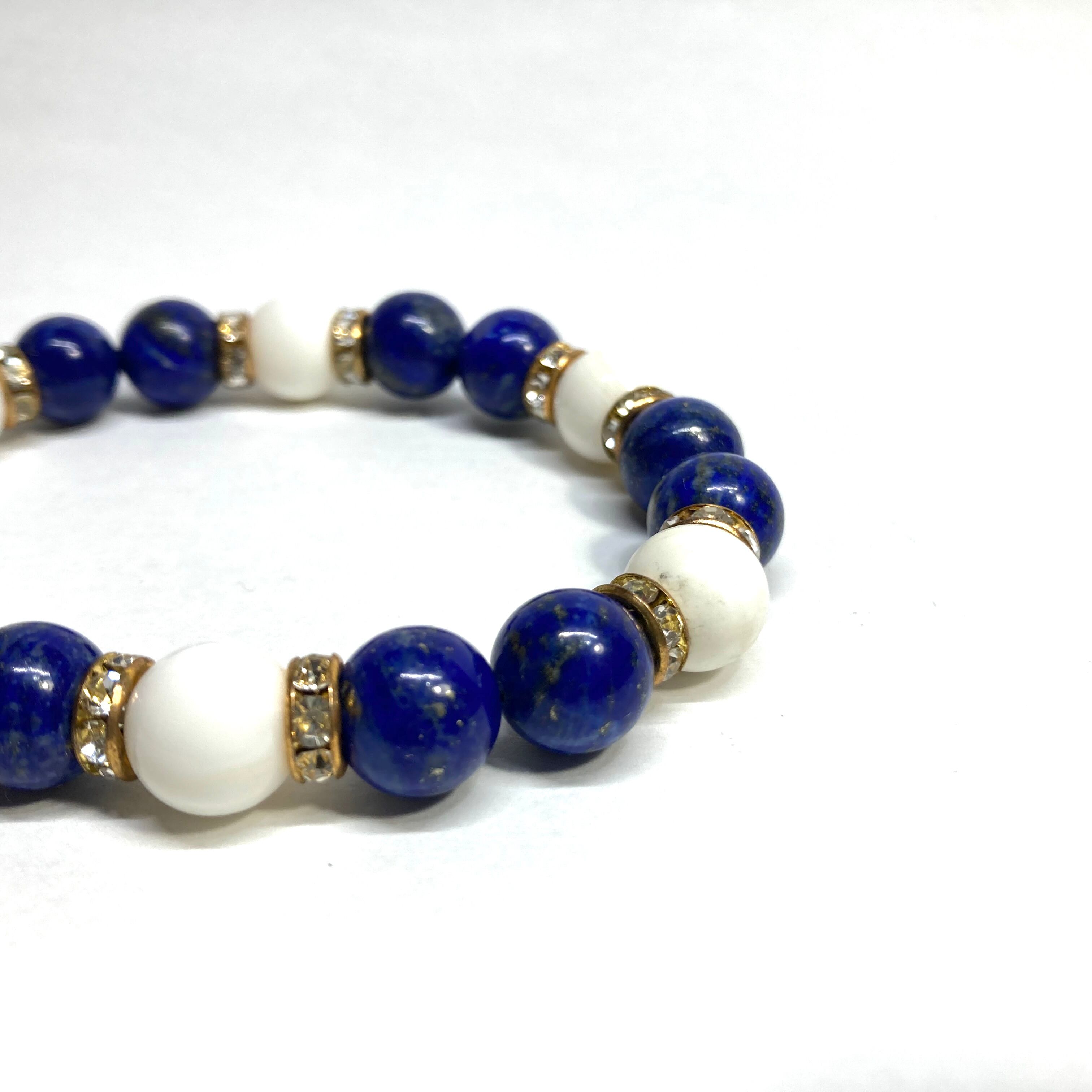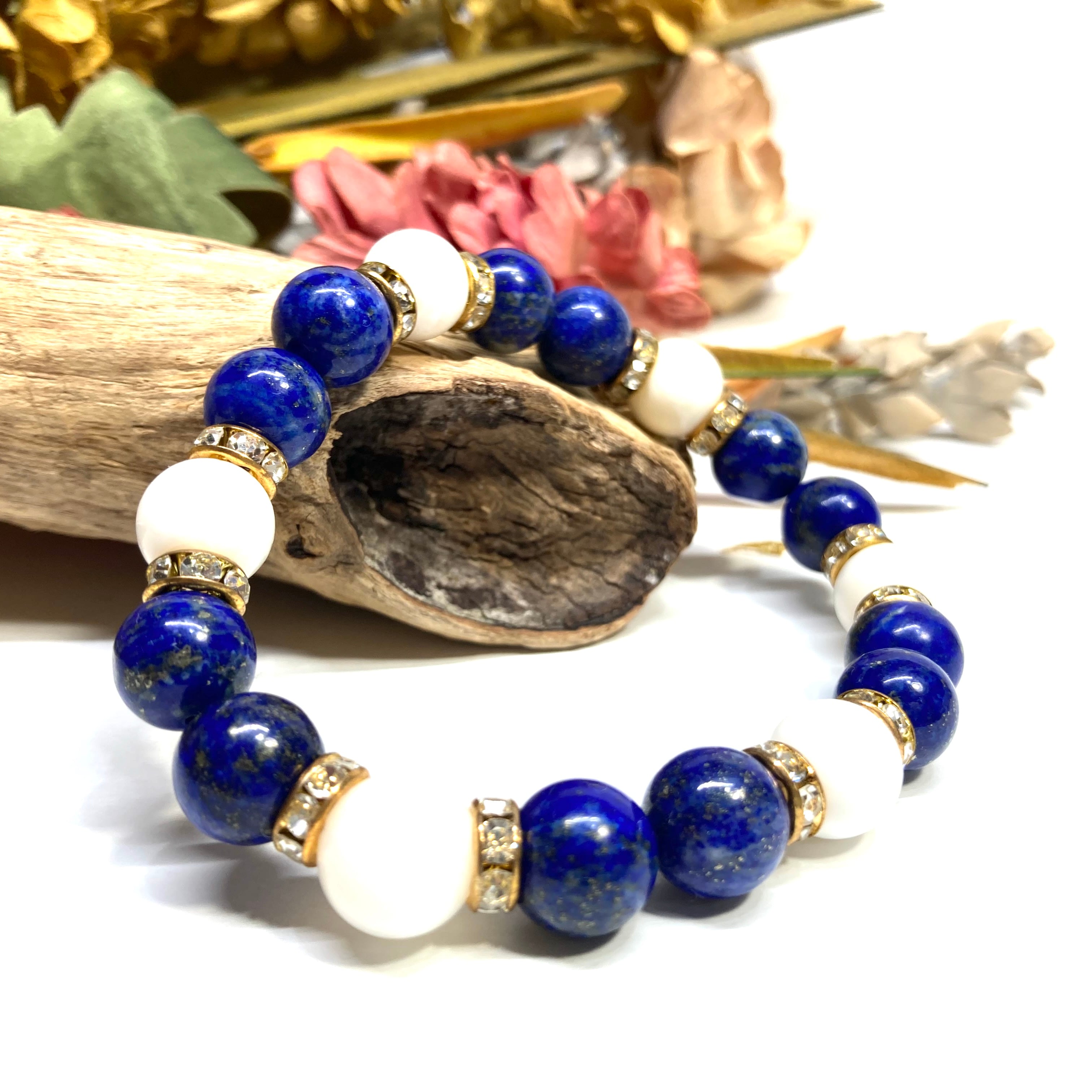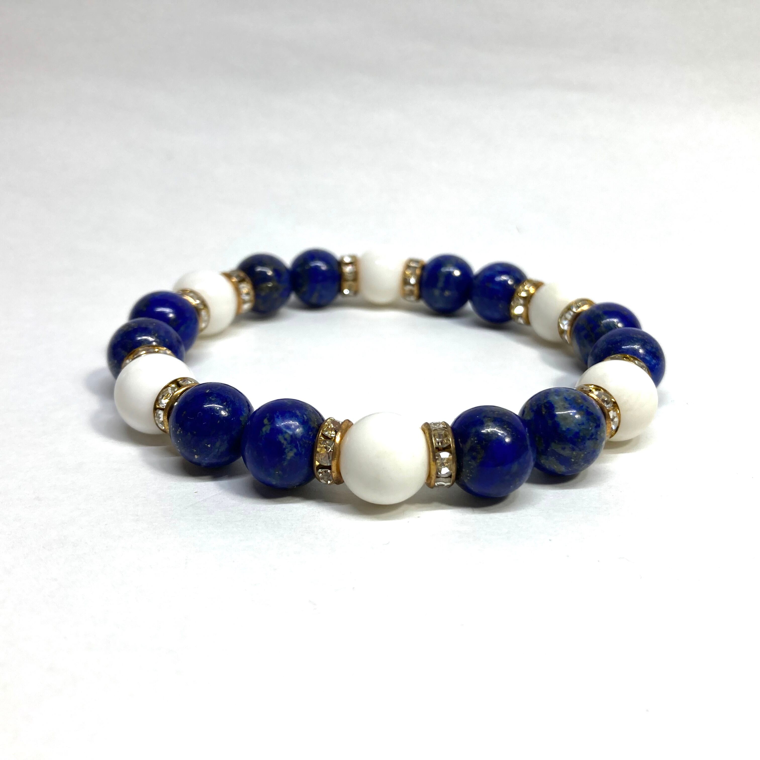 こちらは、ラピスラズリとホワイトオニキスを組み合わせたパワーストーンブレスレットです。間にはロンデルを挟み高級感あるデザインに仕上げております。石大きさは腕にも馴染みやすいように10mm玉で内径約18cm(伸可能)です。 数に限りがございますので気になる方はお早めにどうぞ。