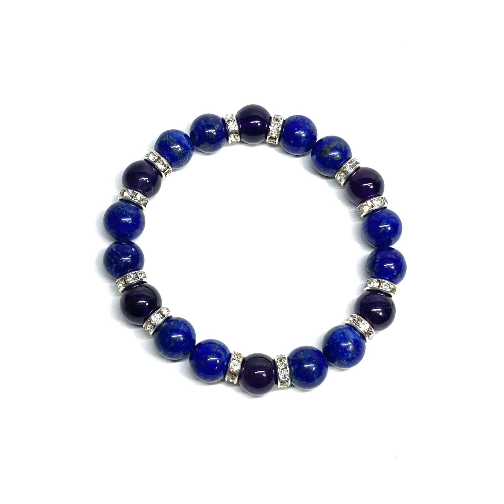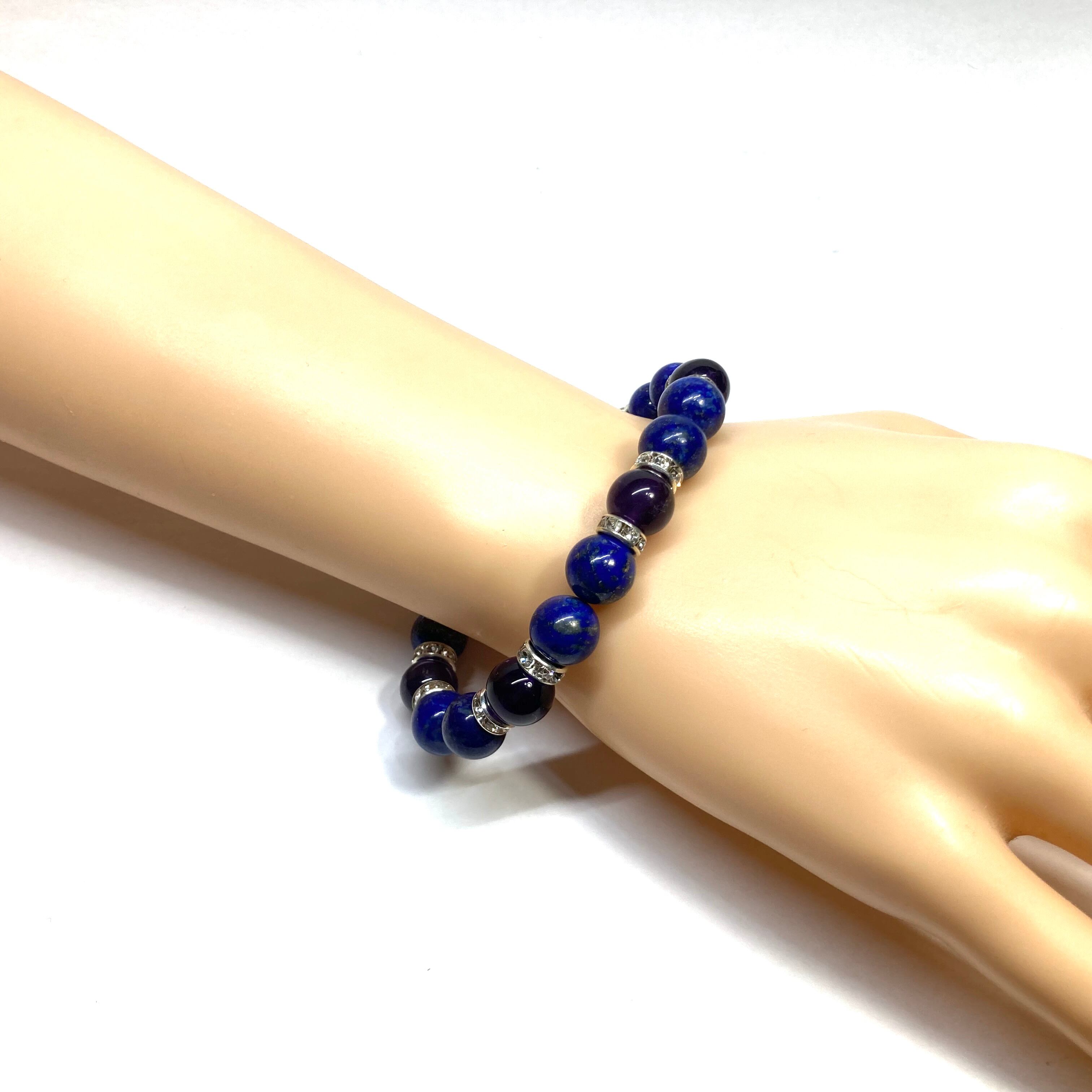 こちらは、ラピスラズリとアメジストを組み合わせたパワーストーンブレスレットです。間にはロンデルを挟み高級感あるデザインに仕上げております。石大きさは腕にも馴染みやすいように10mm玉で内径約18cm(伸可能)です。 数に限りがございますので気になる方はお早めにどうぞ。