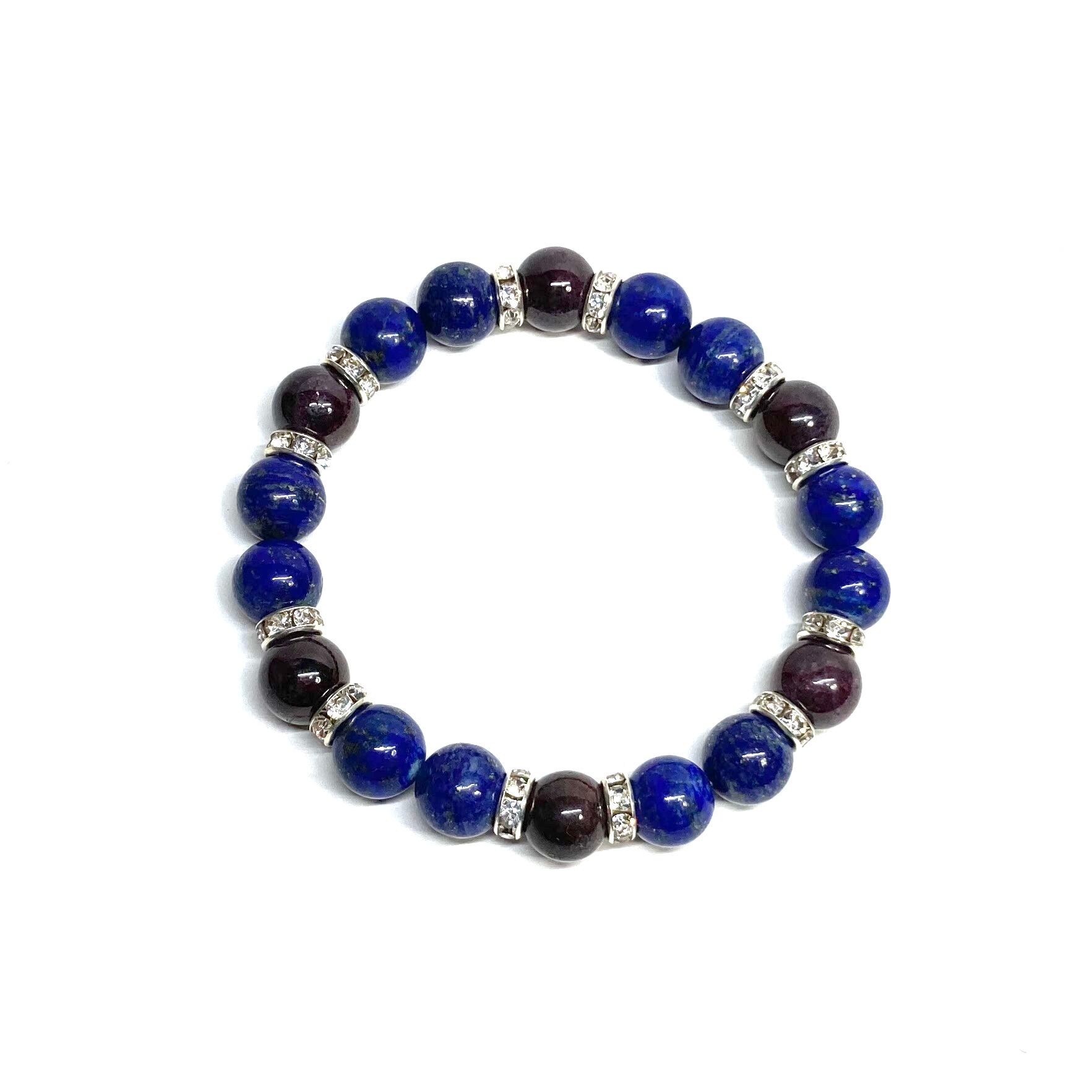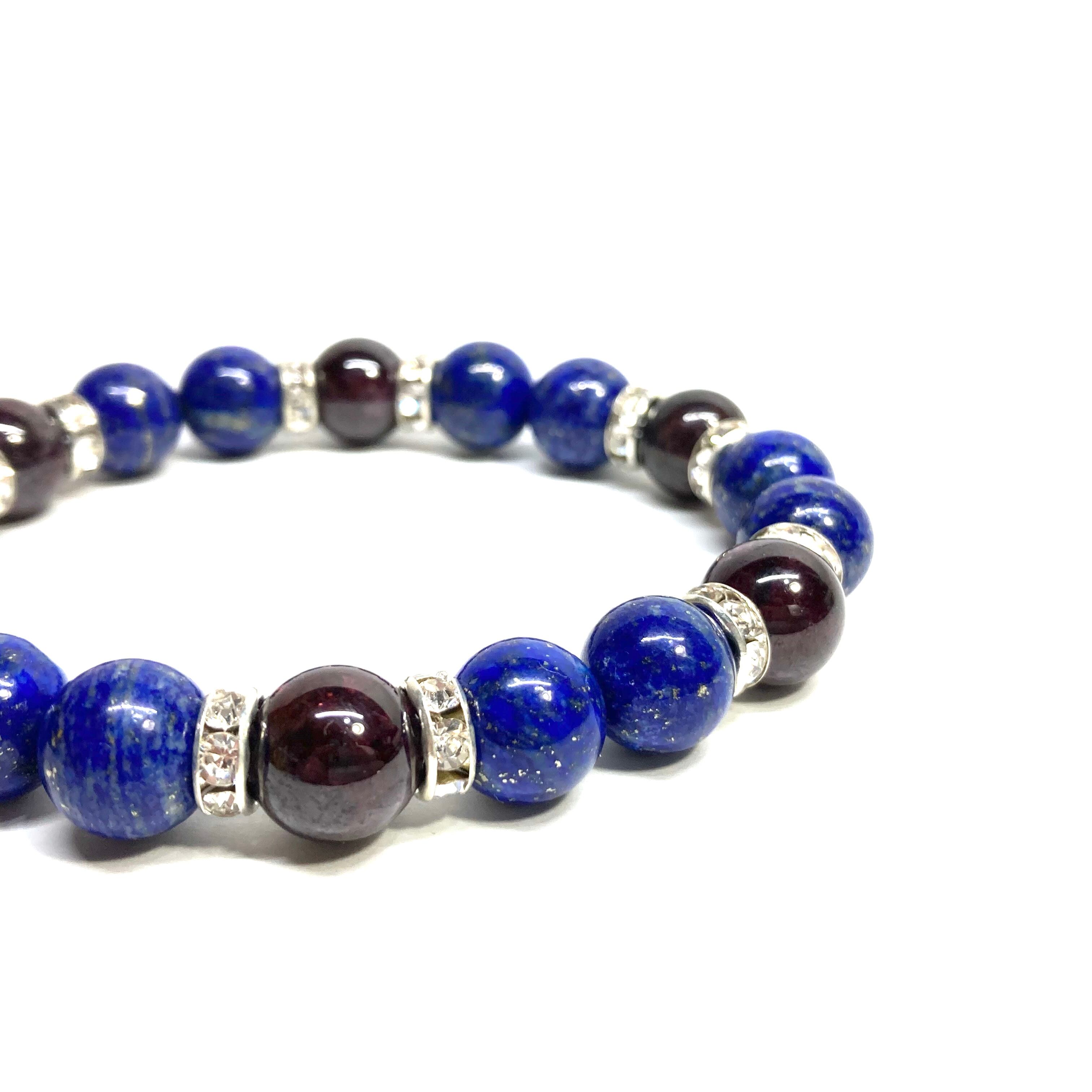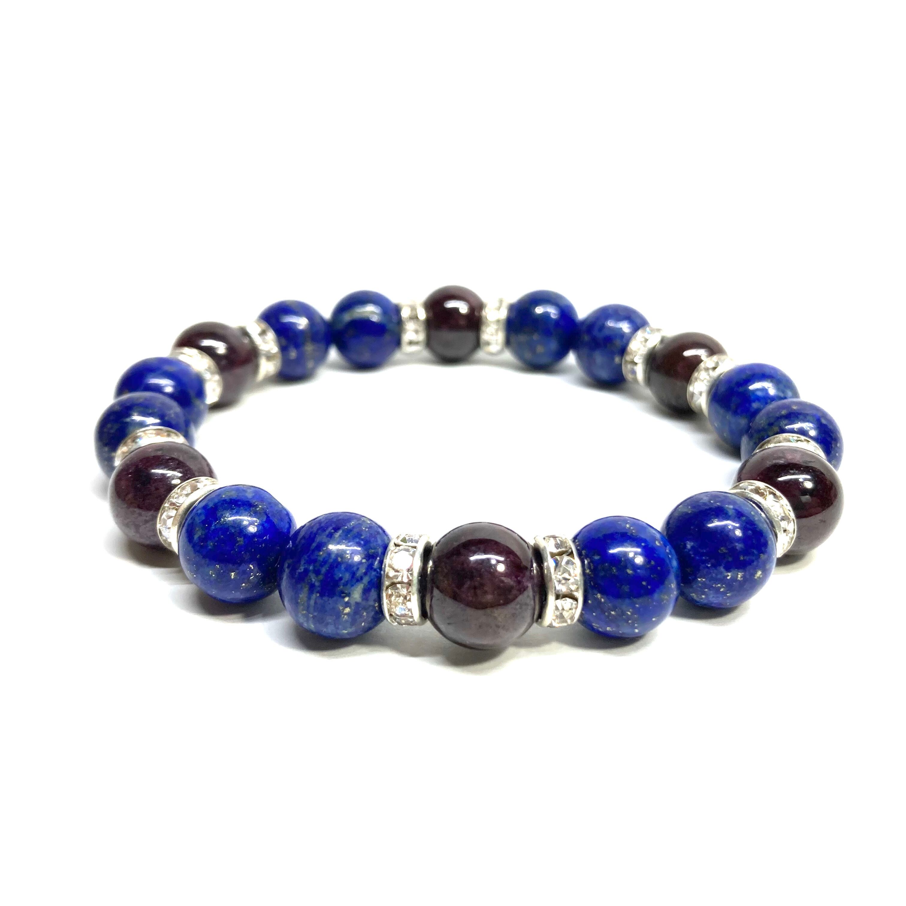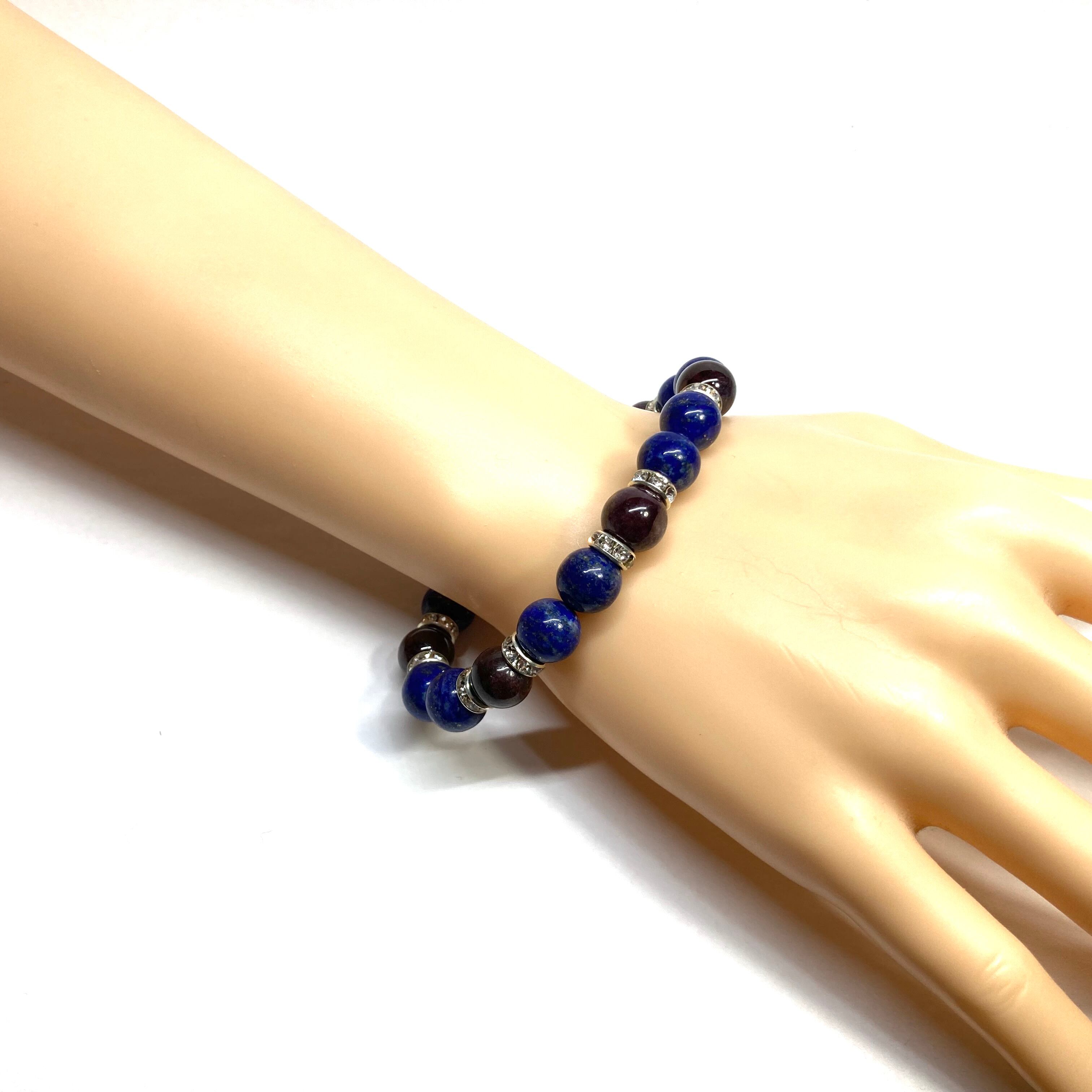 こちらは、ラピスラズリとガーネットを組み合わせたパワーストーンブレスレットです。間にはロンデルを挟み高級感あるデザインに仕上げております。石大きさは腕にも馴染みやすいように10mm玉で内径約18cm(伸可能)です。 数に限りがございますので気になる方はお早めにどうぞ。