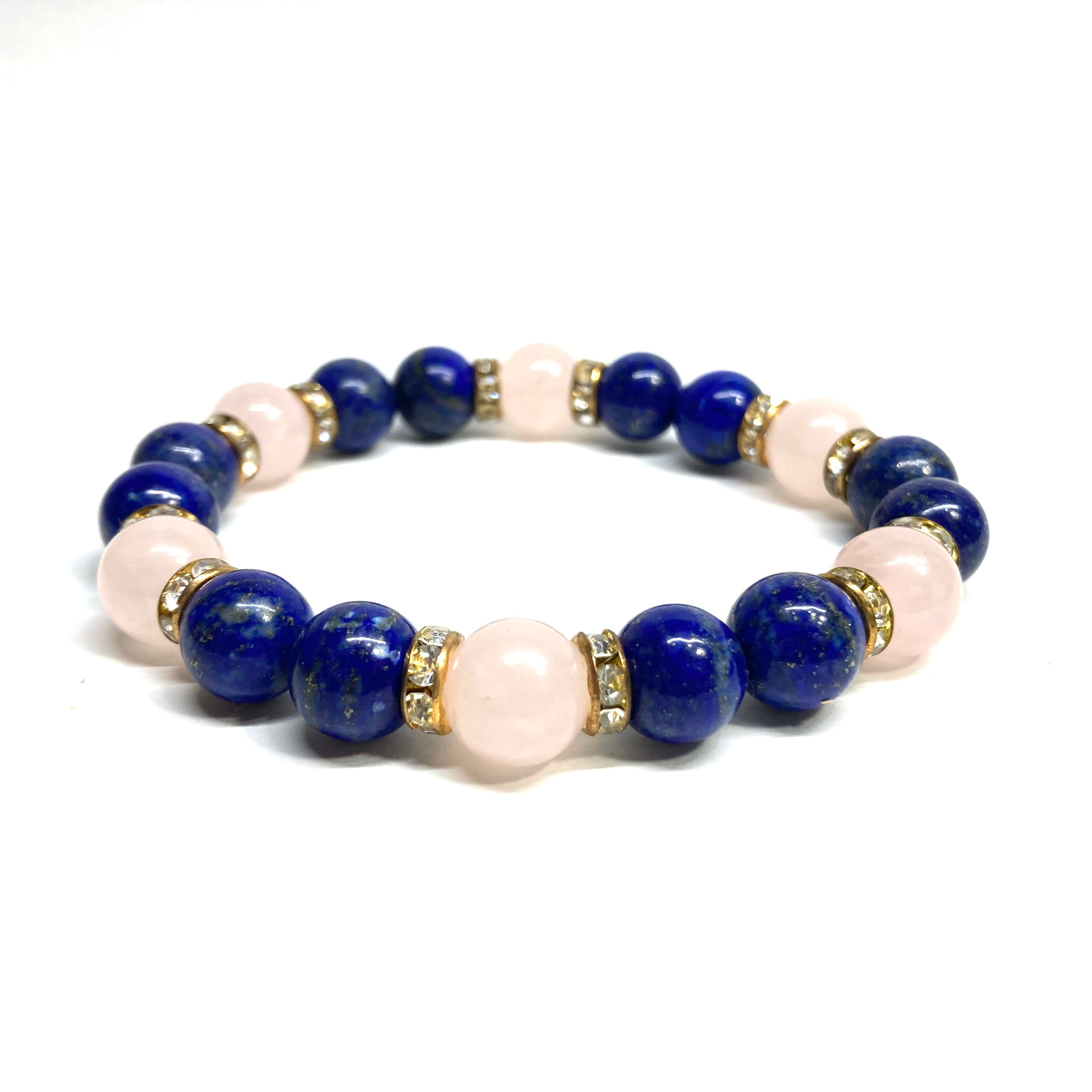 こちらは、ラピスラズリとローズクォーツを組み合わせたパワーストーンブレスレットです。間にはロンデルを挟み高級感あるデザインに仕上げております。石大きさは腕にも馴染みやすいように10mm玉で内径約18cm(伸可能)です。 数に限りがございますので気になる方はお早めにどうぞ。