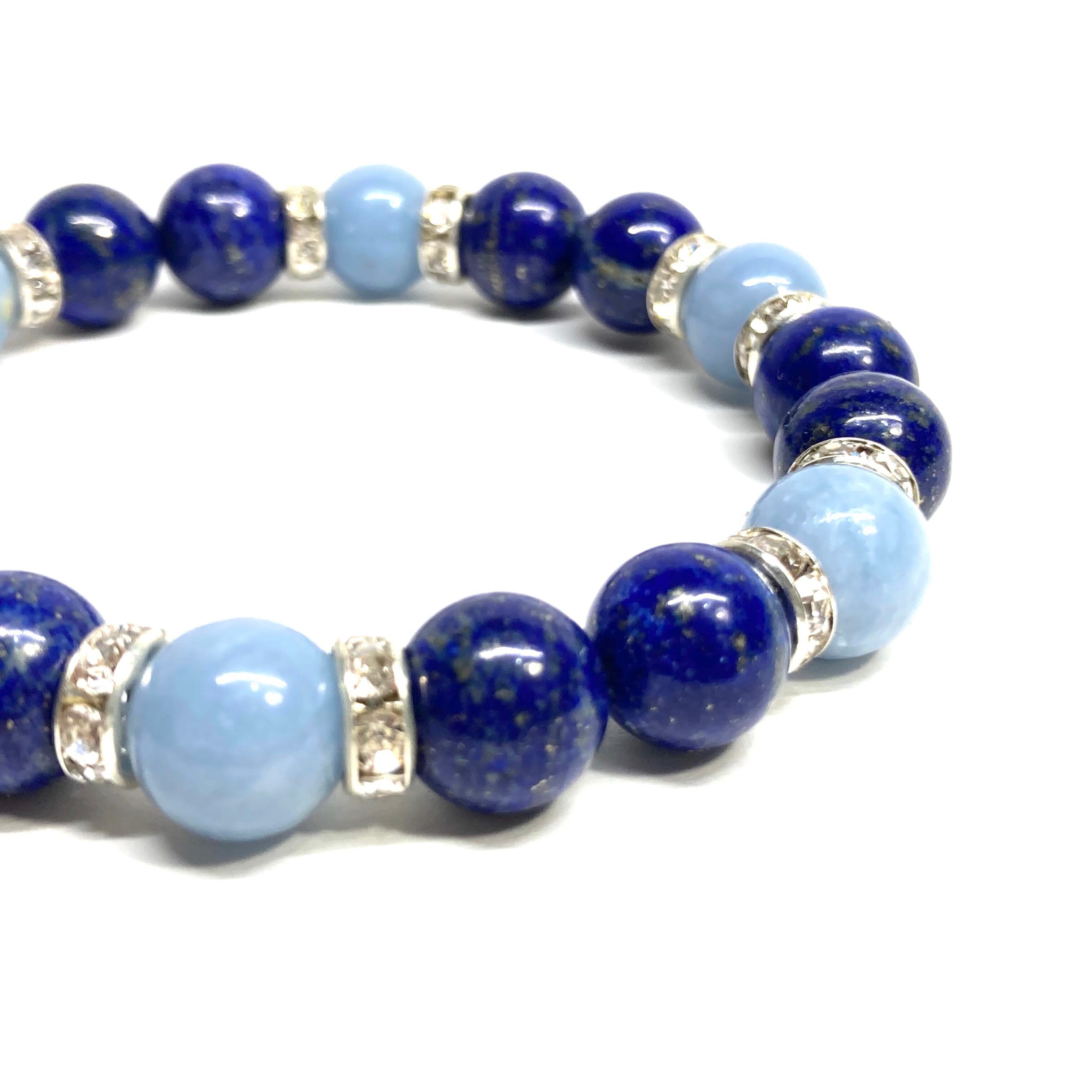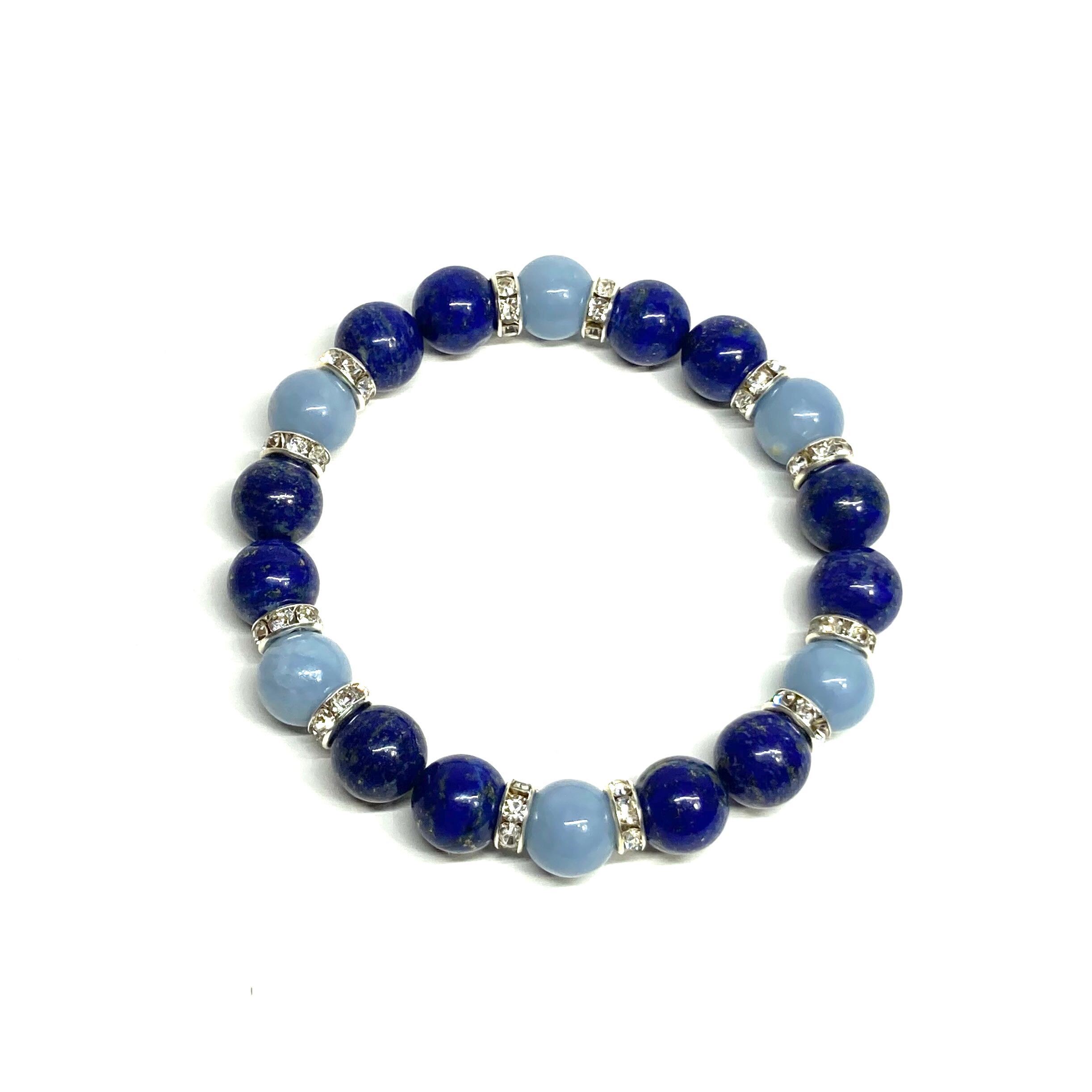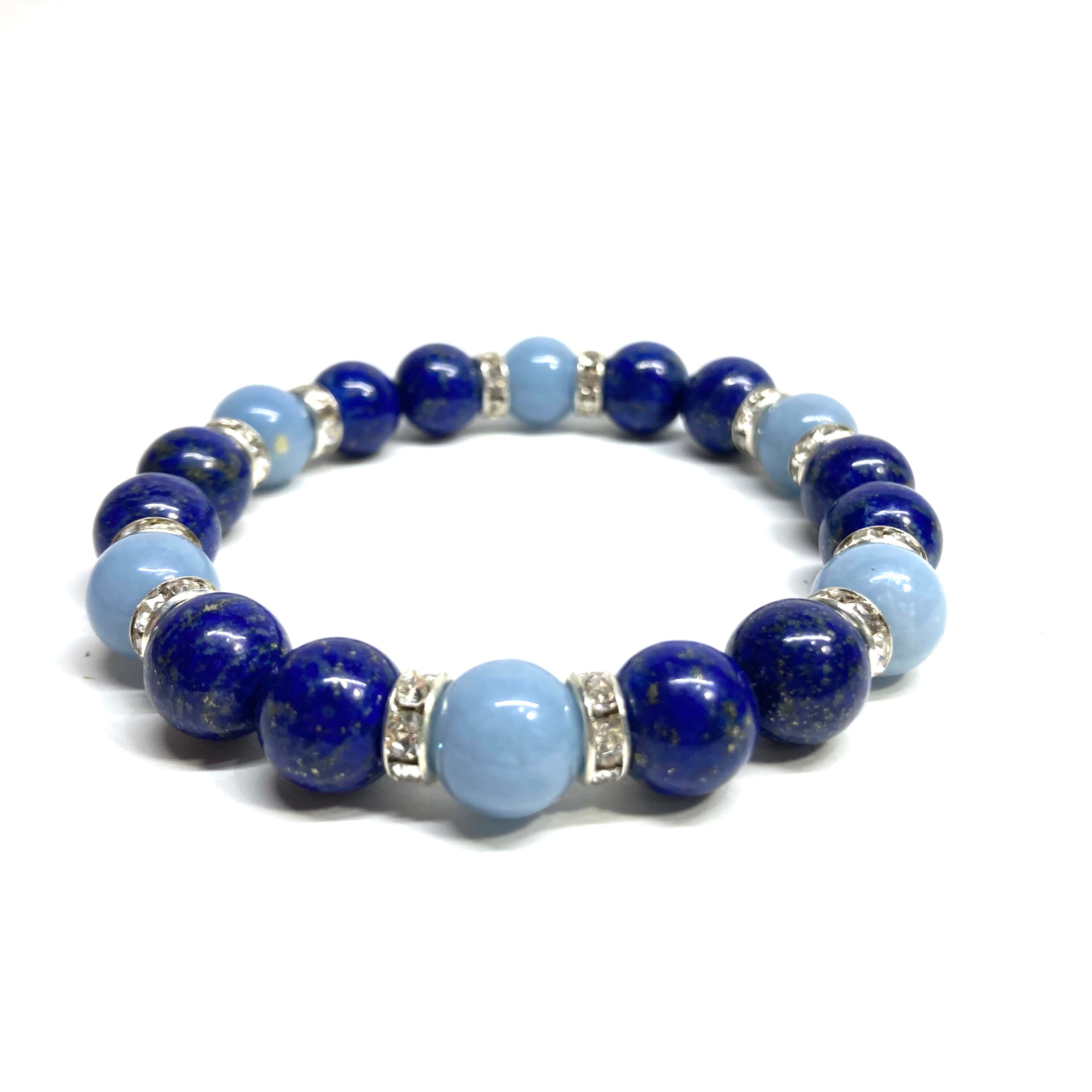 こちらは、ラピスラズリとエンジェライトを組み合わせたパワーストーンブレスレットです。間にはロンデルを挟み高級感あるデザインに仕上げております。石大きさは腕にも馴染みやすいように10mm玉で内径約18cm(伸可能)です。 数に限りがございますので気になる方はお早めにどうぞ。