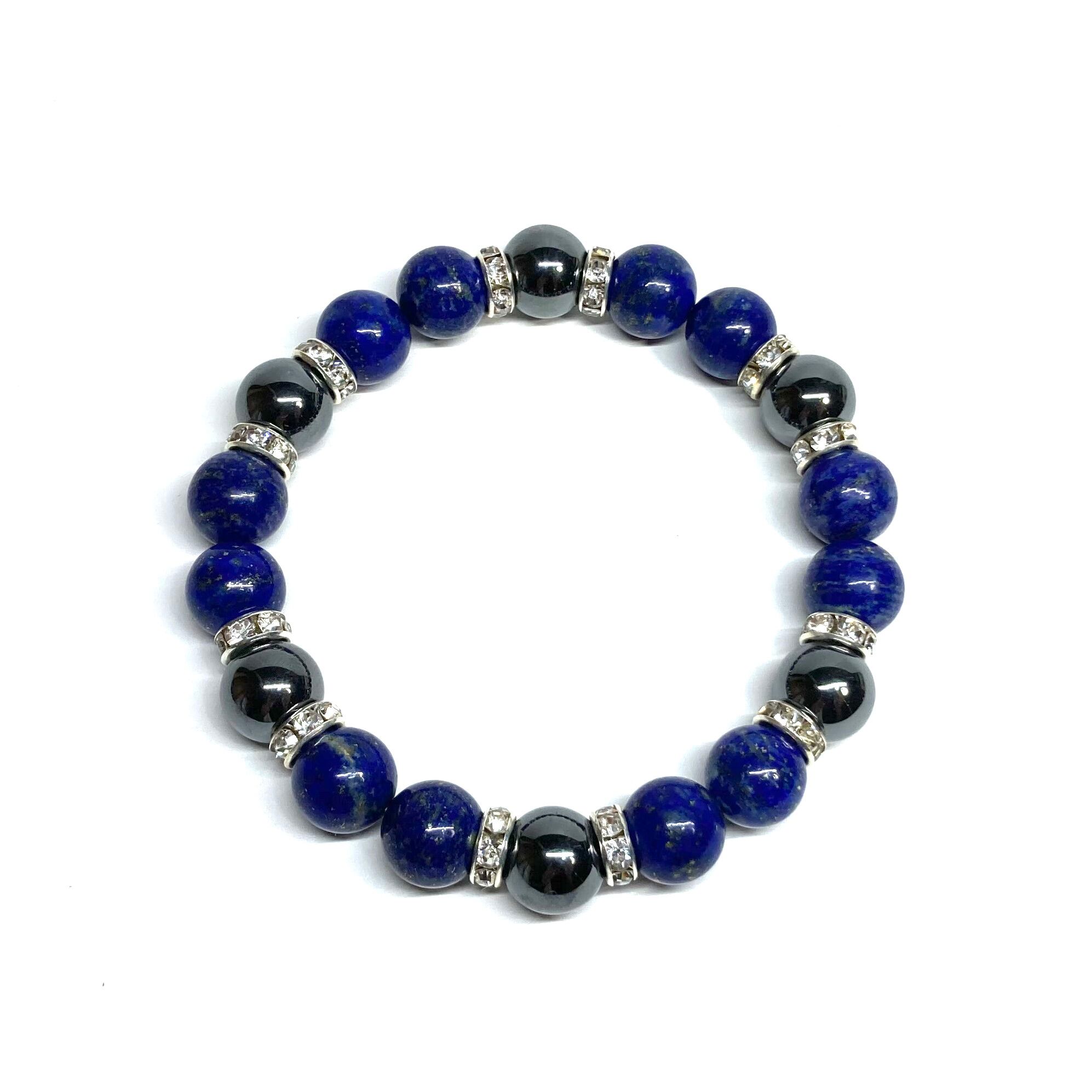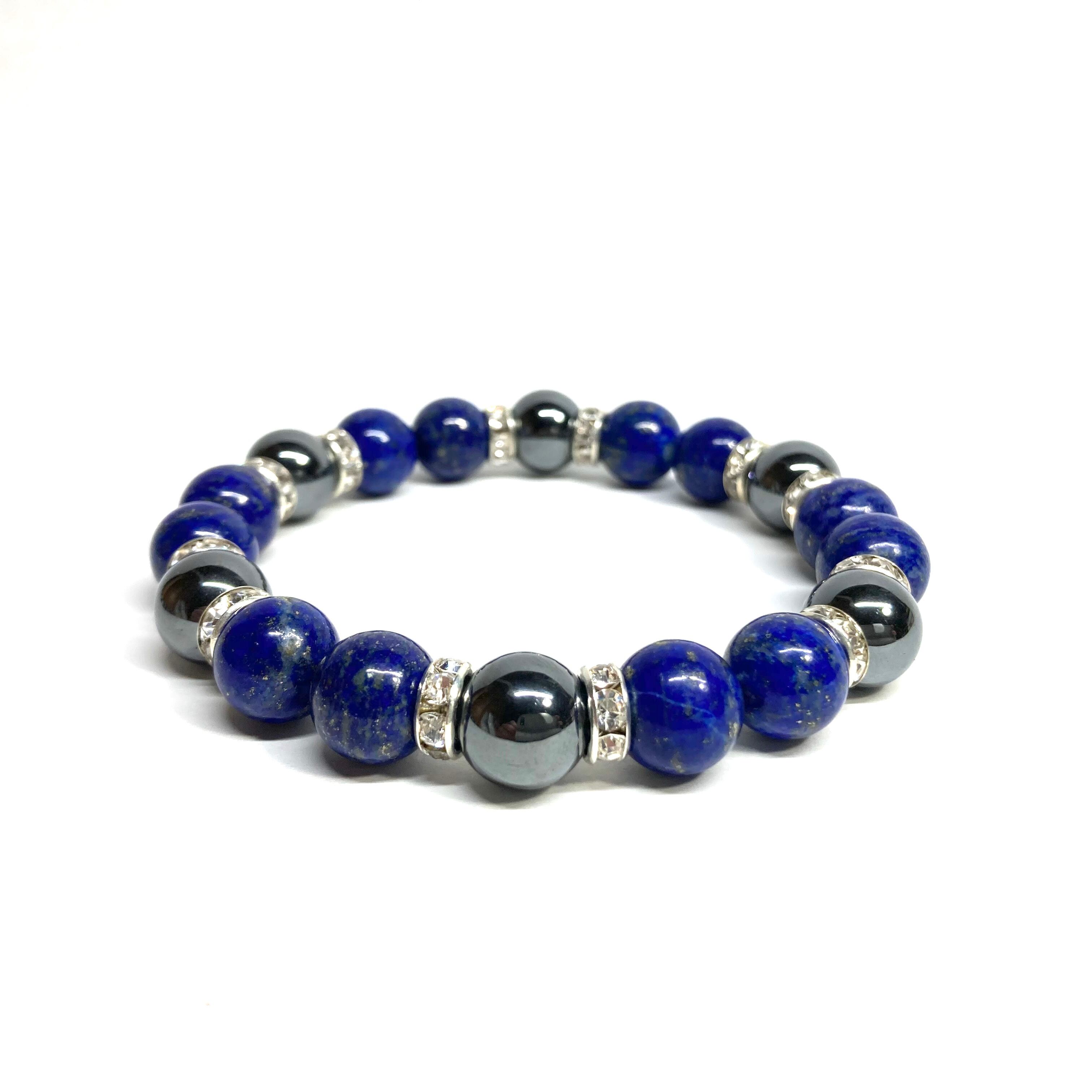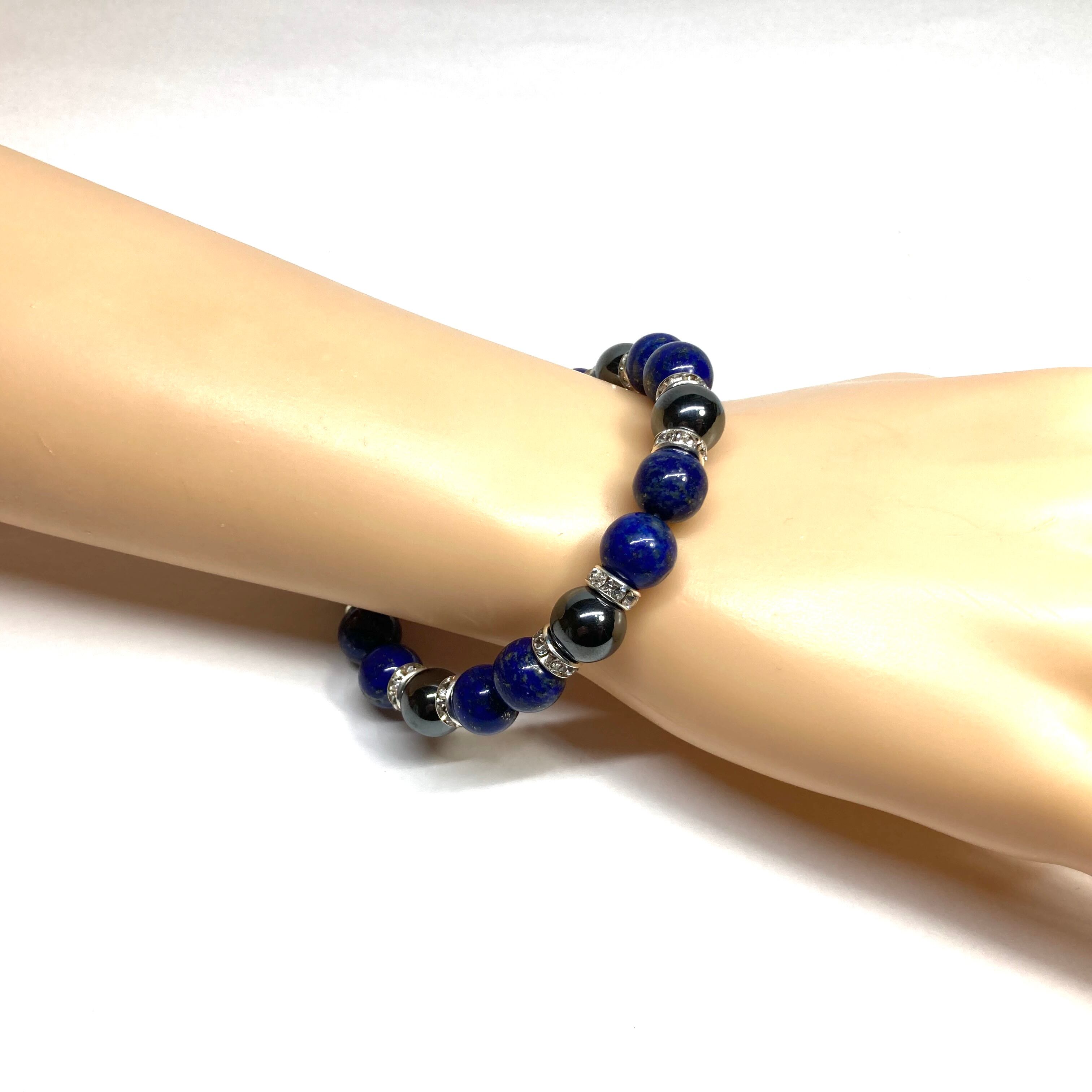 こちらは、ラピスラズリとヘマタイトを組み合わせたパワーストーンブレスレットです。間にはロンデルを挟み高級感あるデザインに仕上げております。石大きさは腕にも馴染みやすいように10mm玉で内径約18cm(伸可能)です。 数に限りがございますので気になる方はお早めにどうぞ。