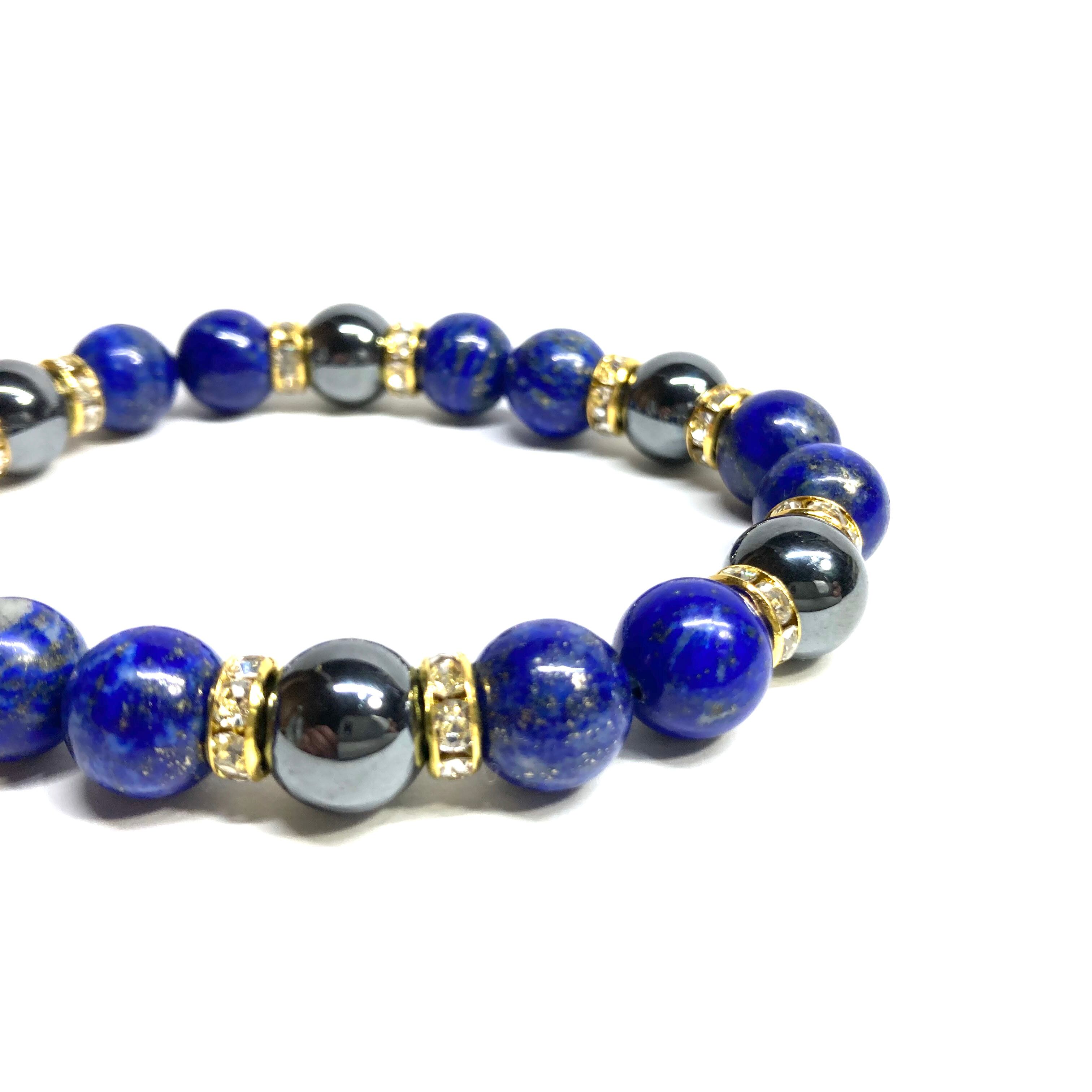 こちらは、ラピスラズリとヘマタイトを組み合わせたパワーストーンブレスレットです。間にはロンデルを挟み高級感あるデザインに仕上げております。石大きさは腕にも馴染みやすいように10mm玉で内径約18cm(伸可能)です。 数に限りがございますので気になる方はお早めにどうぞ。