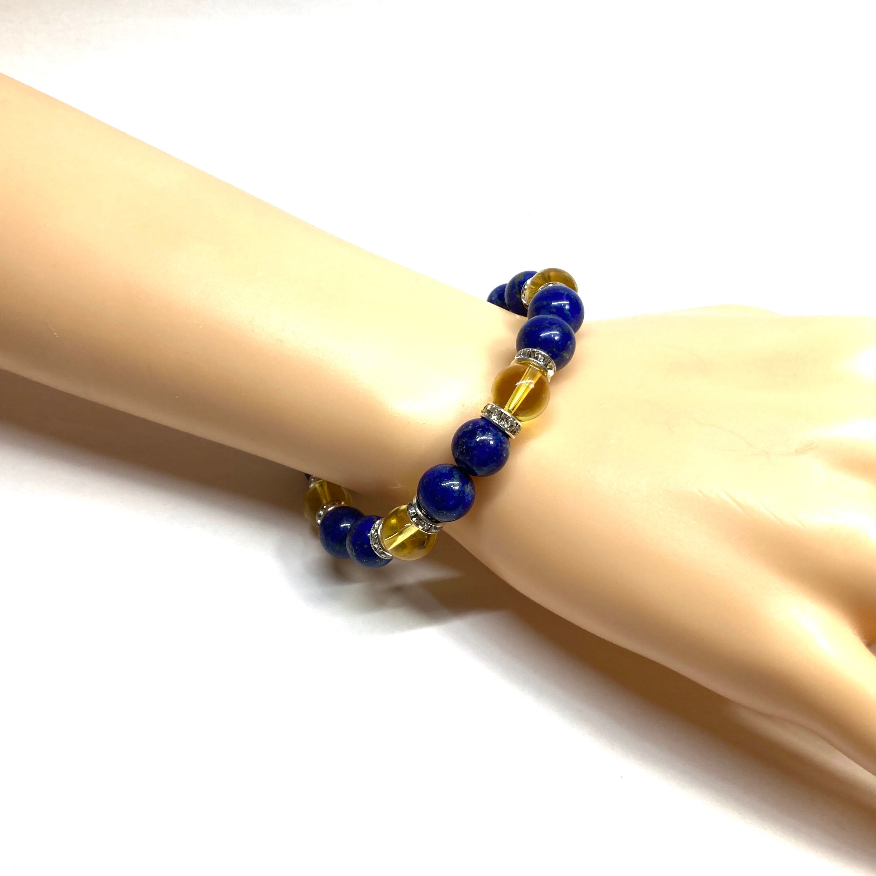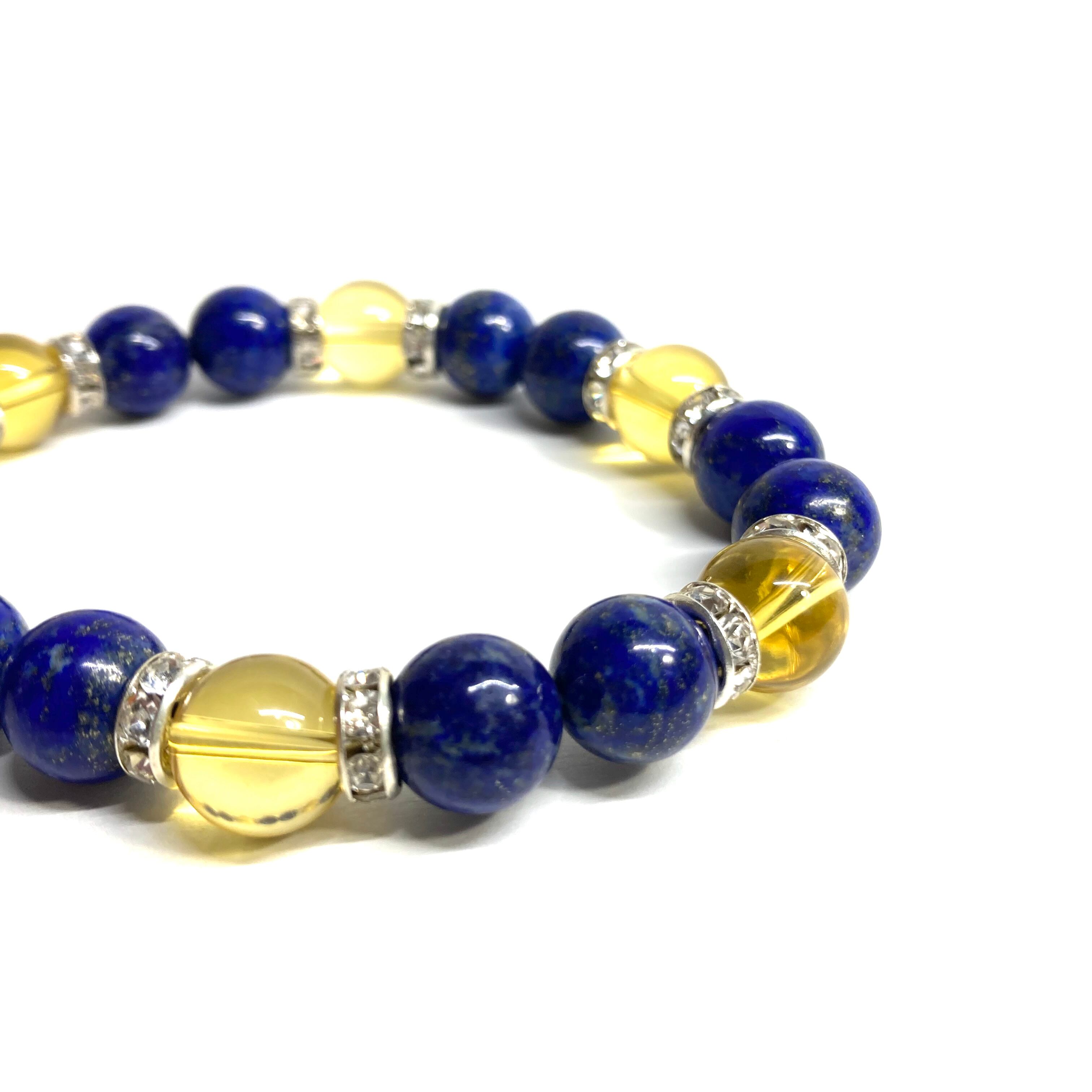 こちらは、ラピスラズリとシトリンを組み合わせたパワーストーンブレスレットです。間にはロンデルを挟み高級感あるデザインに仕上げております。石大きさは腕にも馴染みやすいように10mm玉で内径約18cm(伸可能)です。 数に限りがございますので気になる方はお早めにどうぞ。