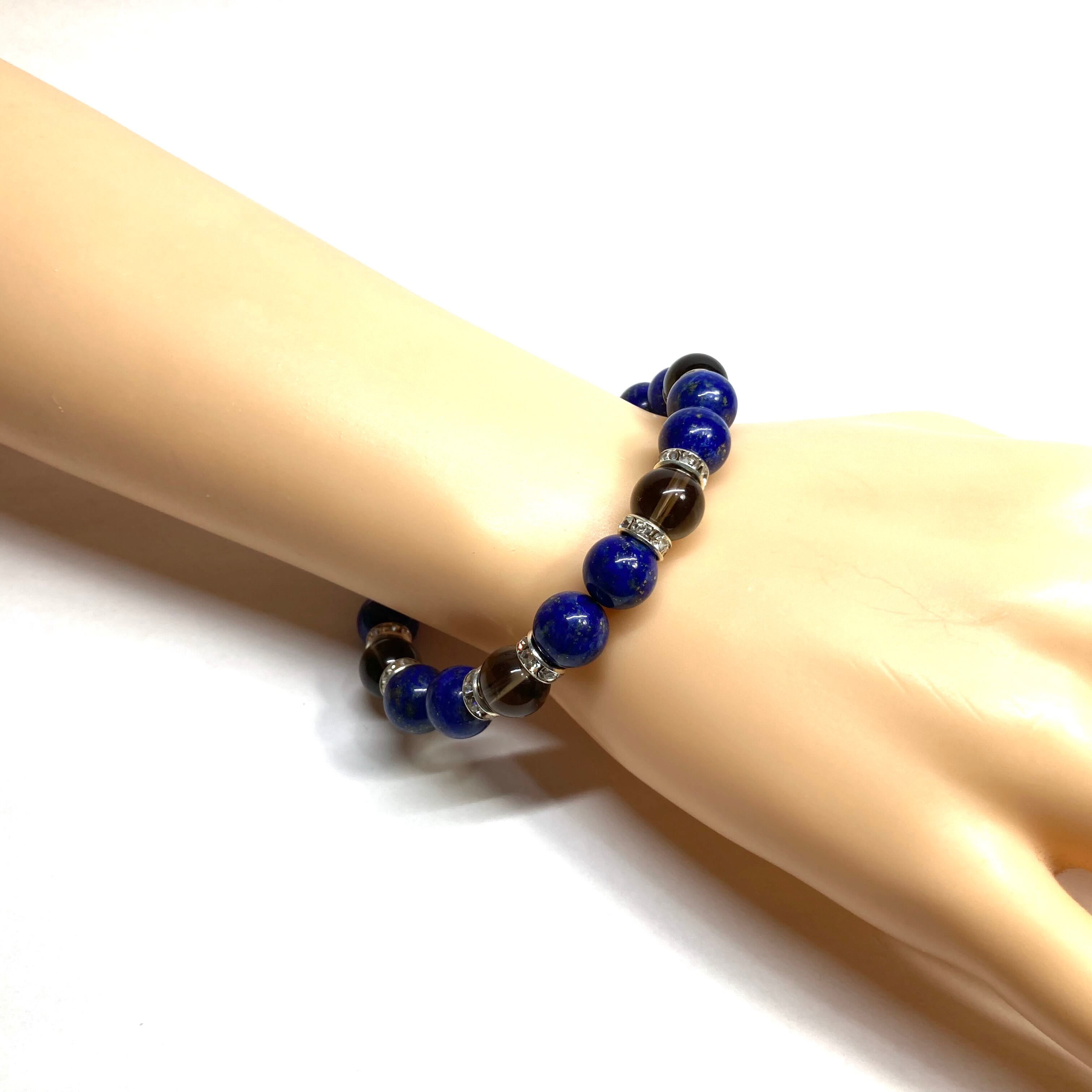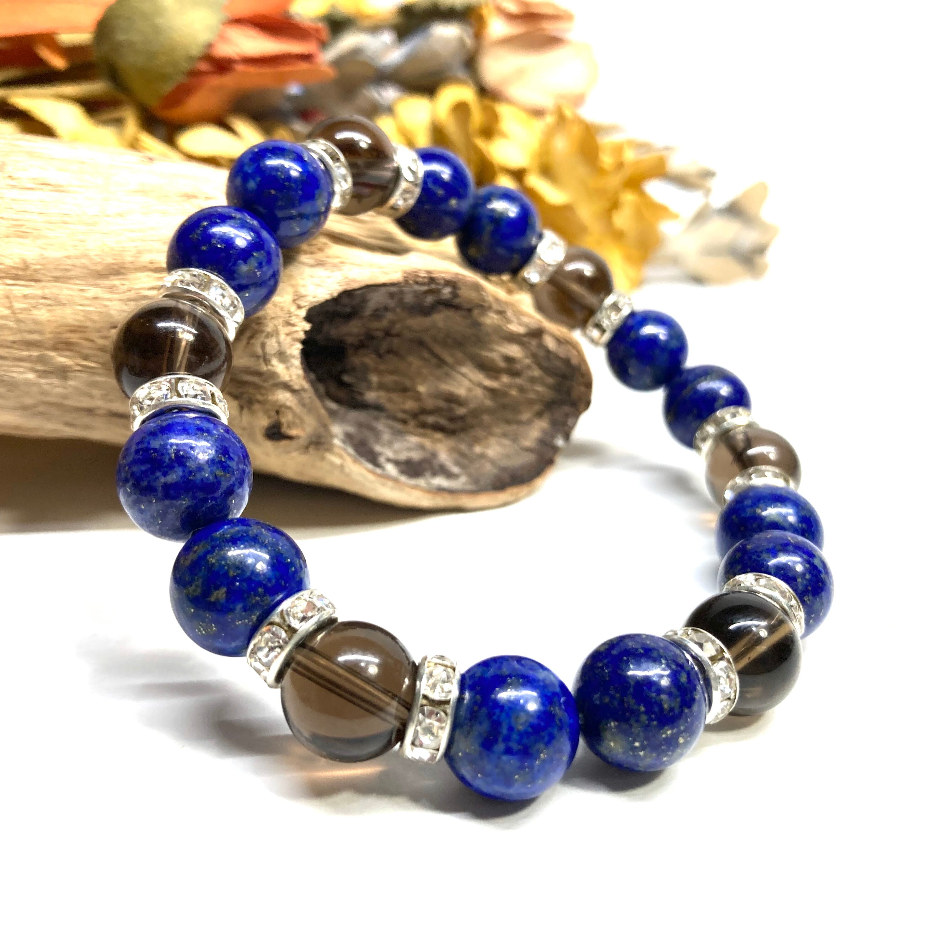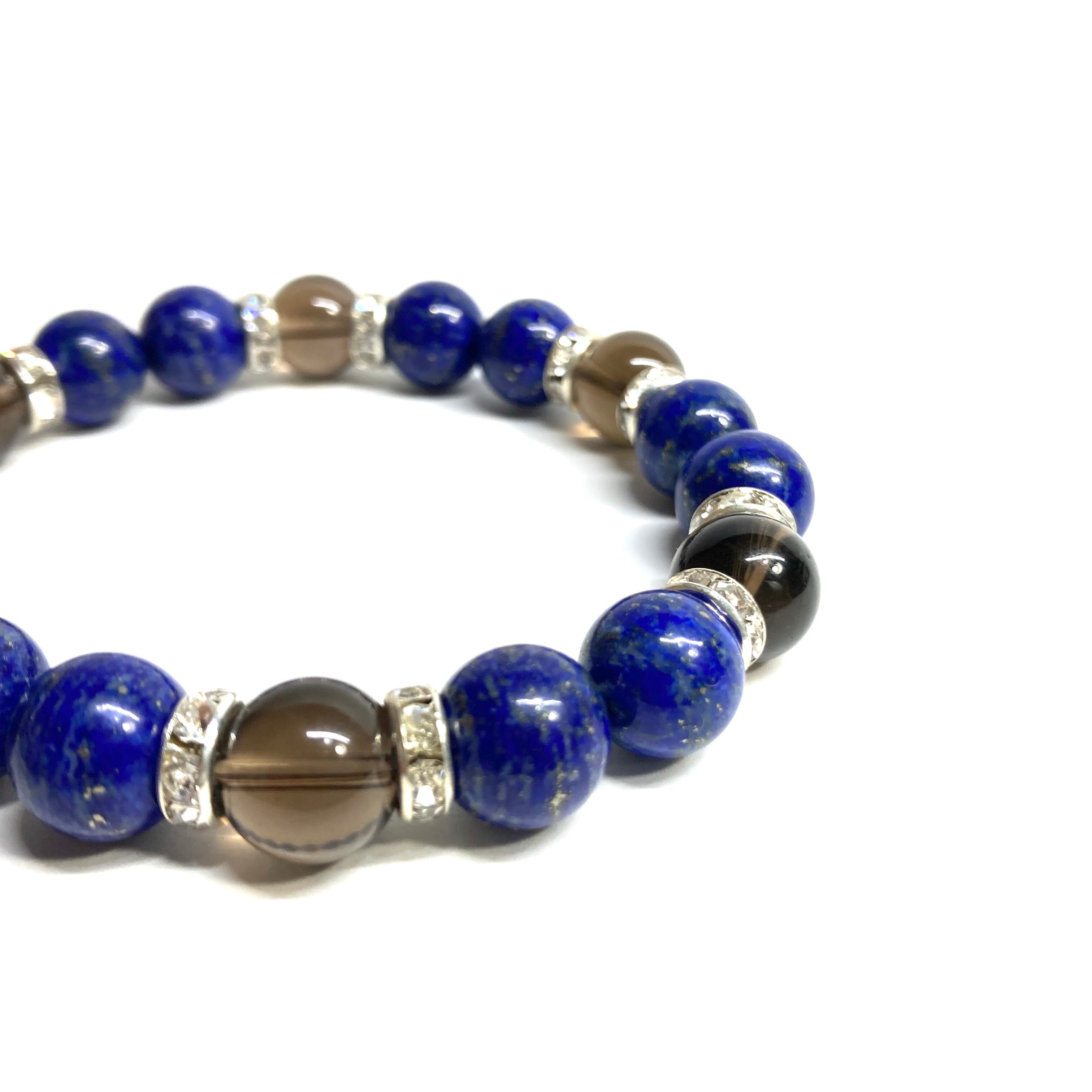 こちらは、ラピスラズリとスモーキークォーツを組み合わせたパワーストーンブレスレットです。間にはロンデルを挟み高級感あるデザインに仕上げております。石大きさは腕にも馴染みやすいように10mm玉で内径約18cm(伸可能)です。 数に限りがございますので気になる方はお早めにどうぞ。