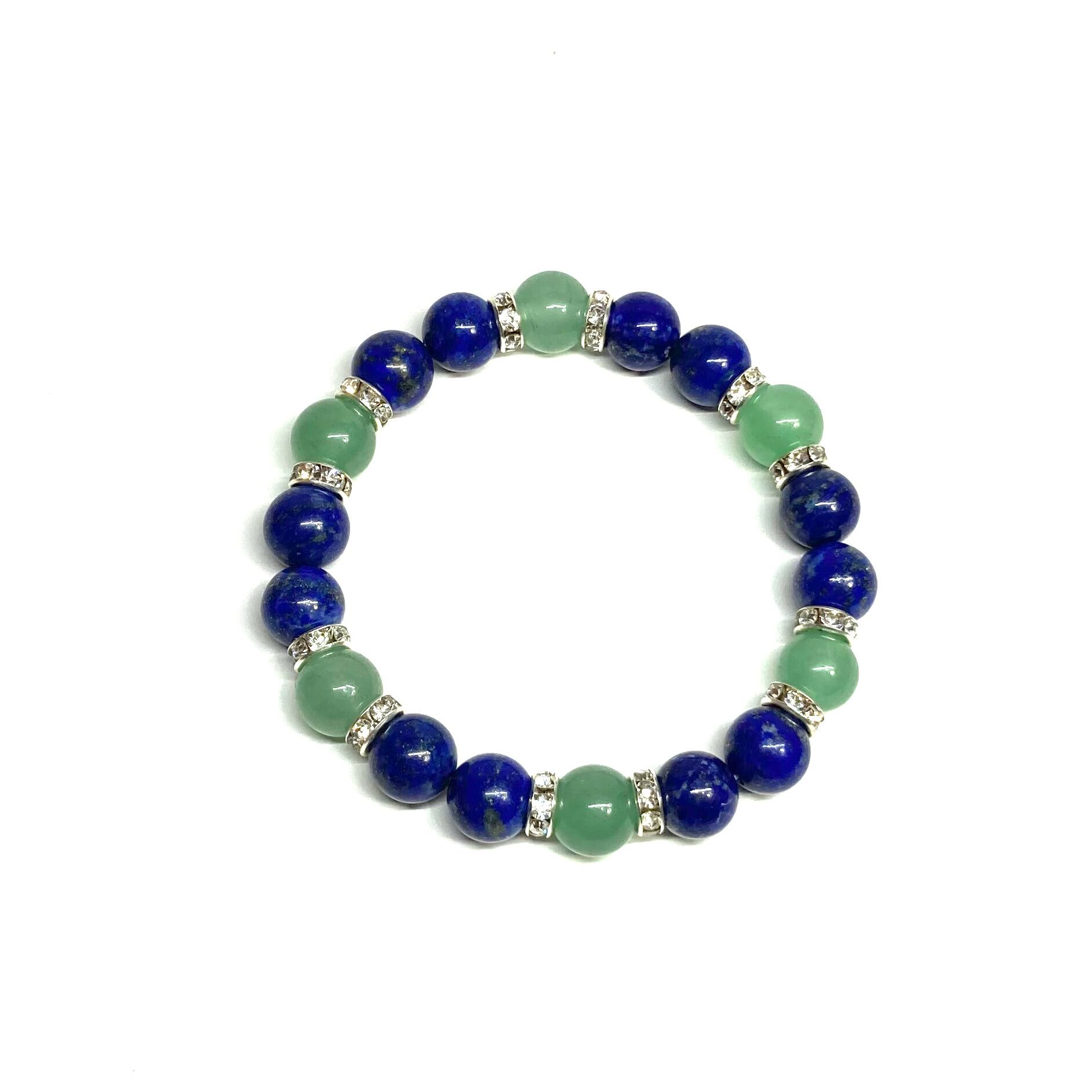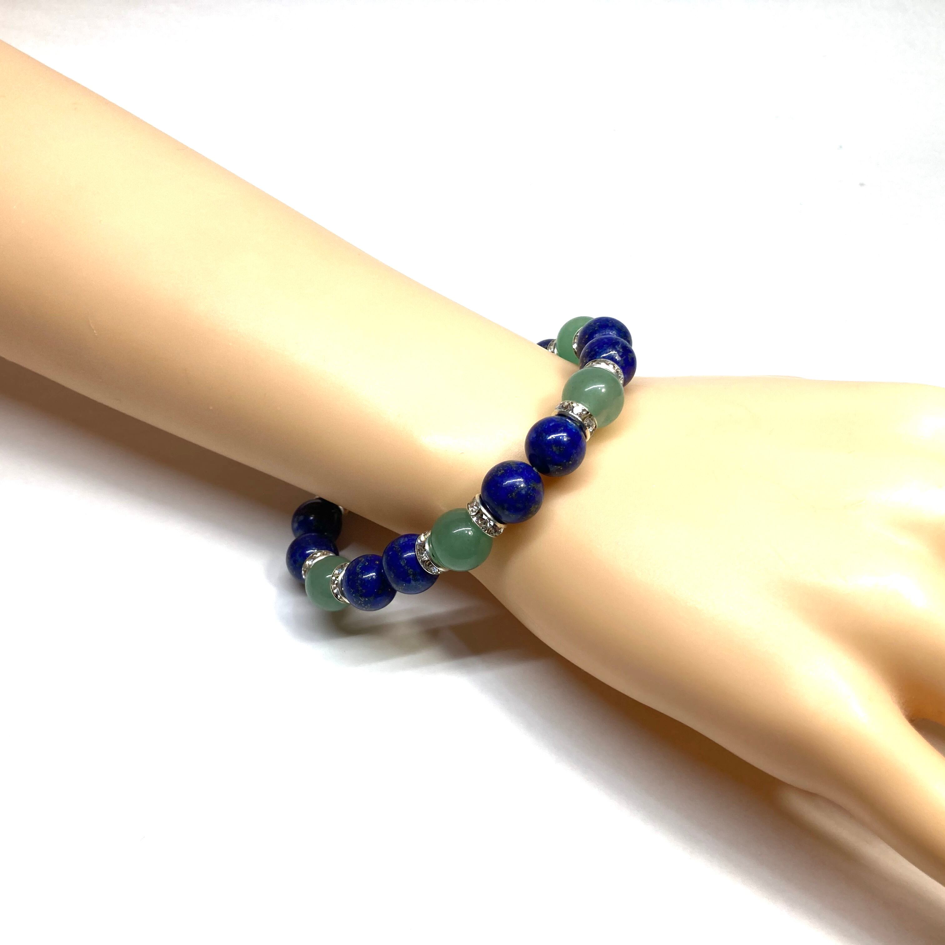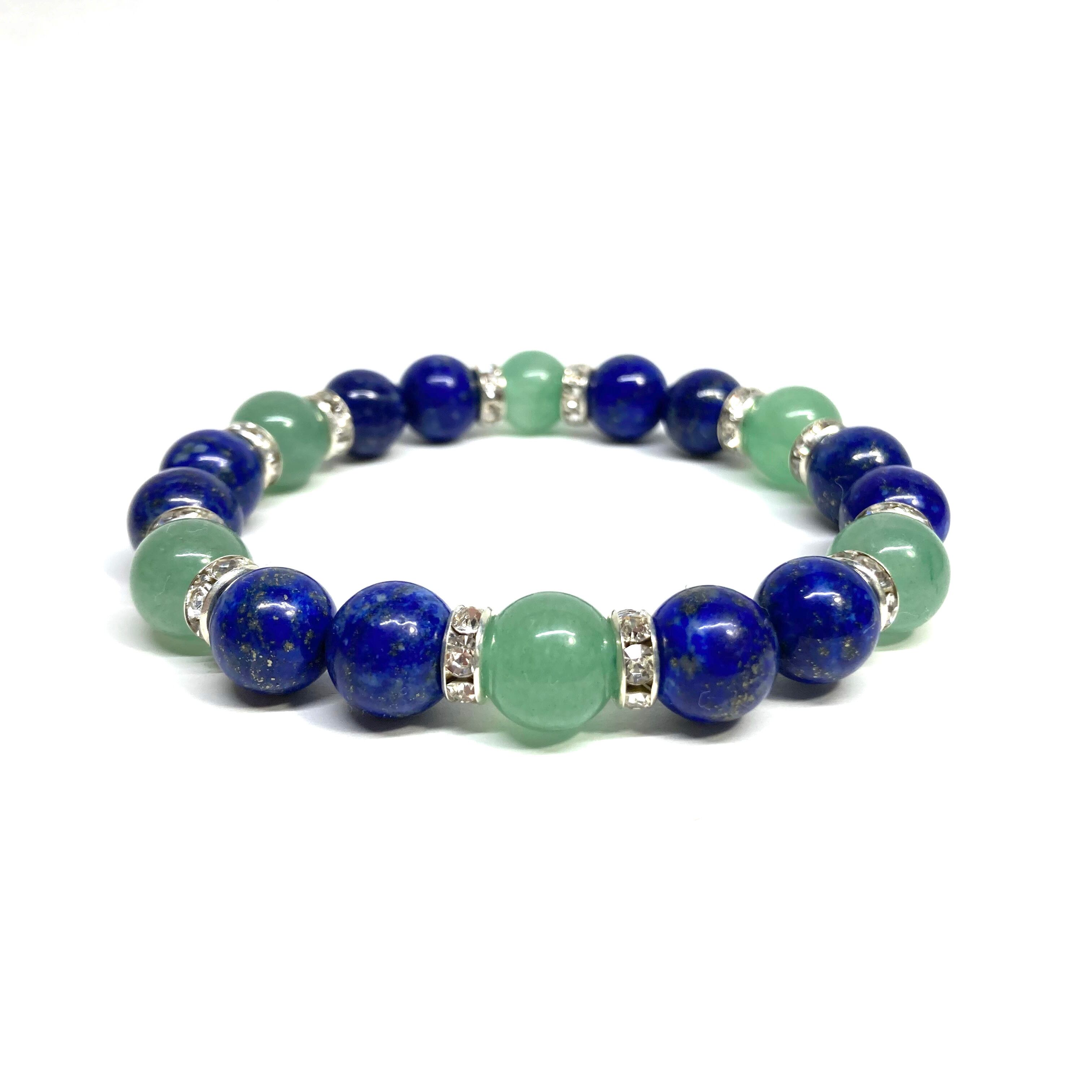 こちらは、ラピスラズリとアベンチュリンを組み合わせたパワーストーンブレスレットです。間にはロンデルを挟み高級感あるデザインに仕上げております。石大きさは腕にも馴染みやすいように10mm玉で内径約18cm(伸可能)です。 数に限りがございますので気になる方はお早めにどうぞ。