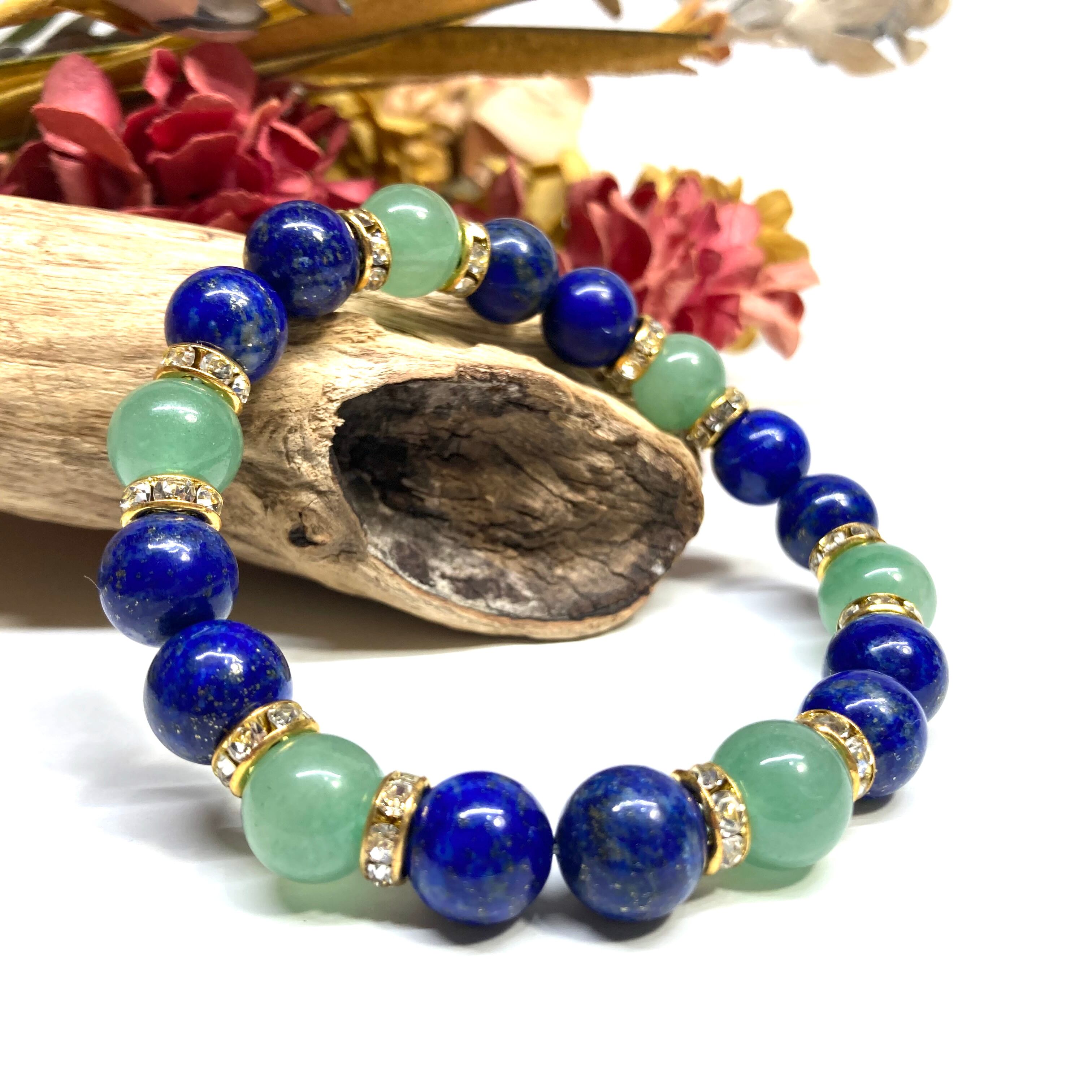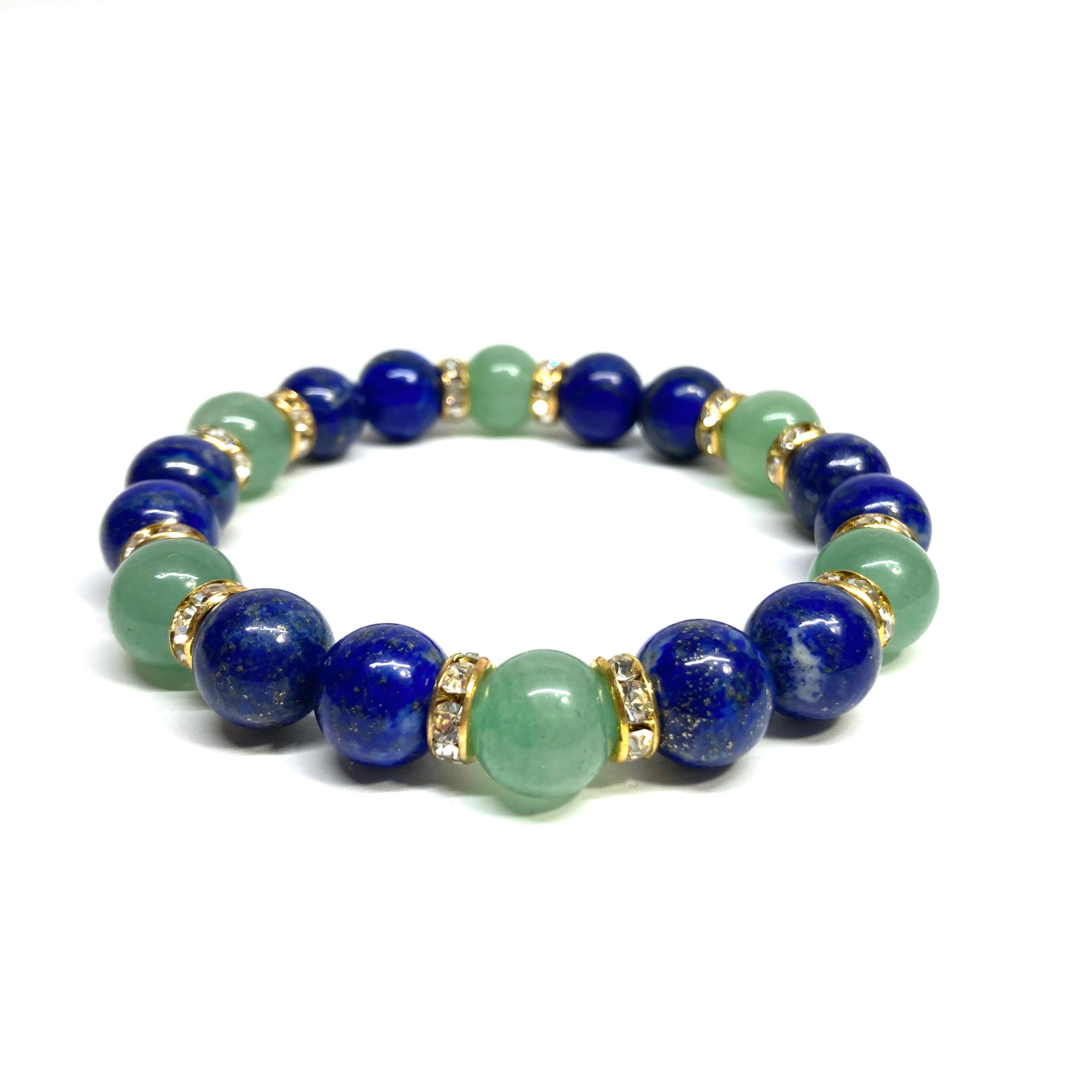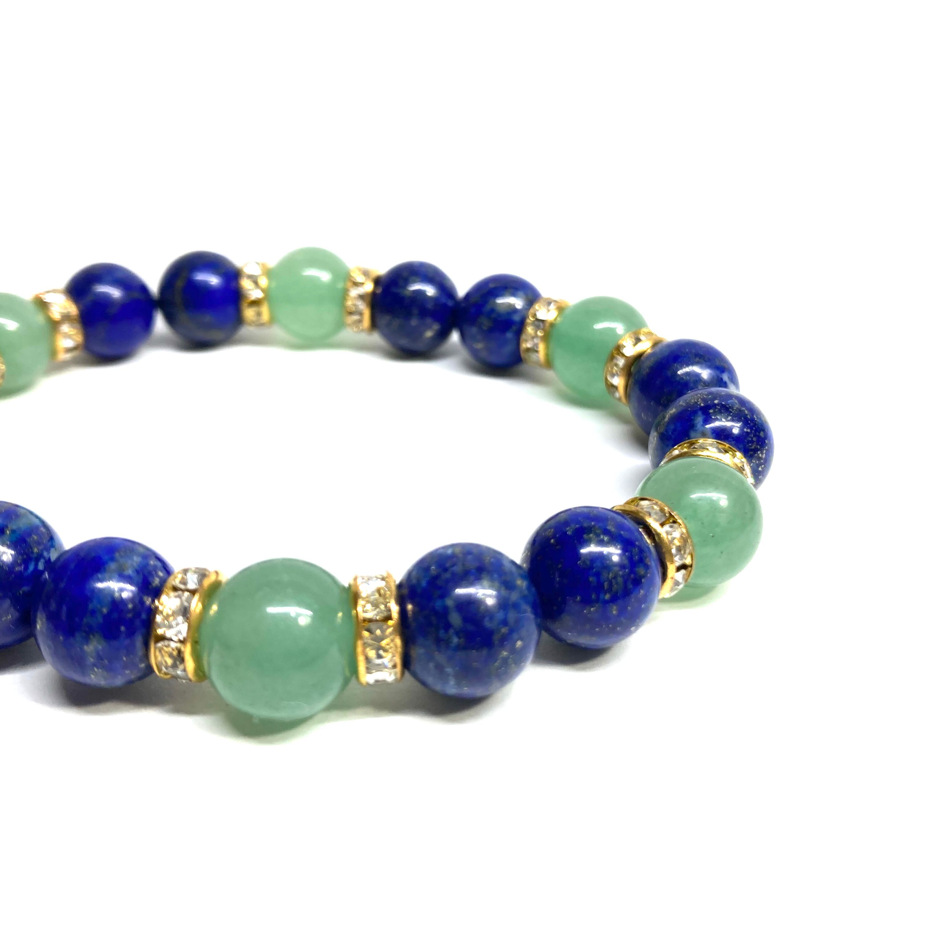 こちらは、ラピスラズリとアベンチュリンを組み合わせたパワーストーンブレスレットです。間にはロンデルを挟み高級感あるデザインに仕上げております。石大きさは腕にも馴染みやすいように10mm玉で内径約18cm(伸可能)です。 数に限りがございますので気になる方はお早めにどうぞ。