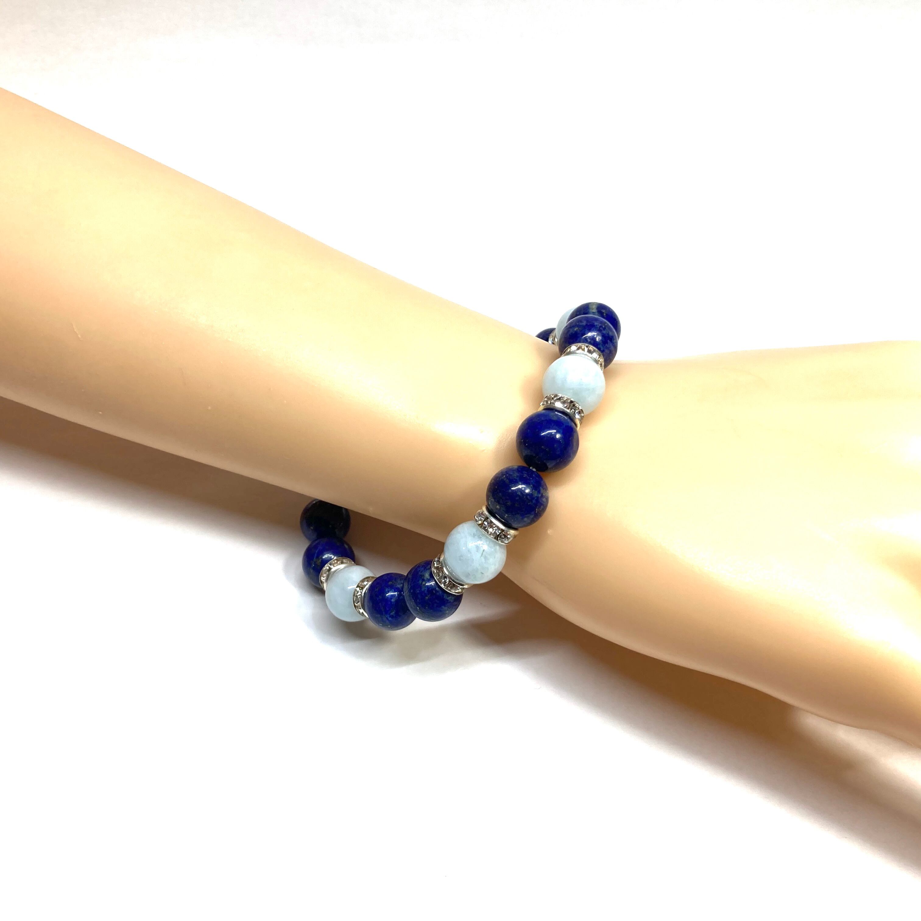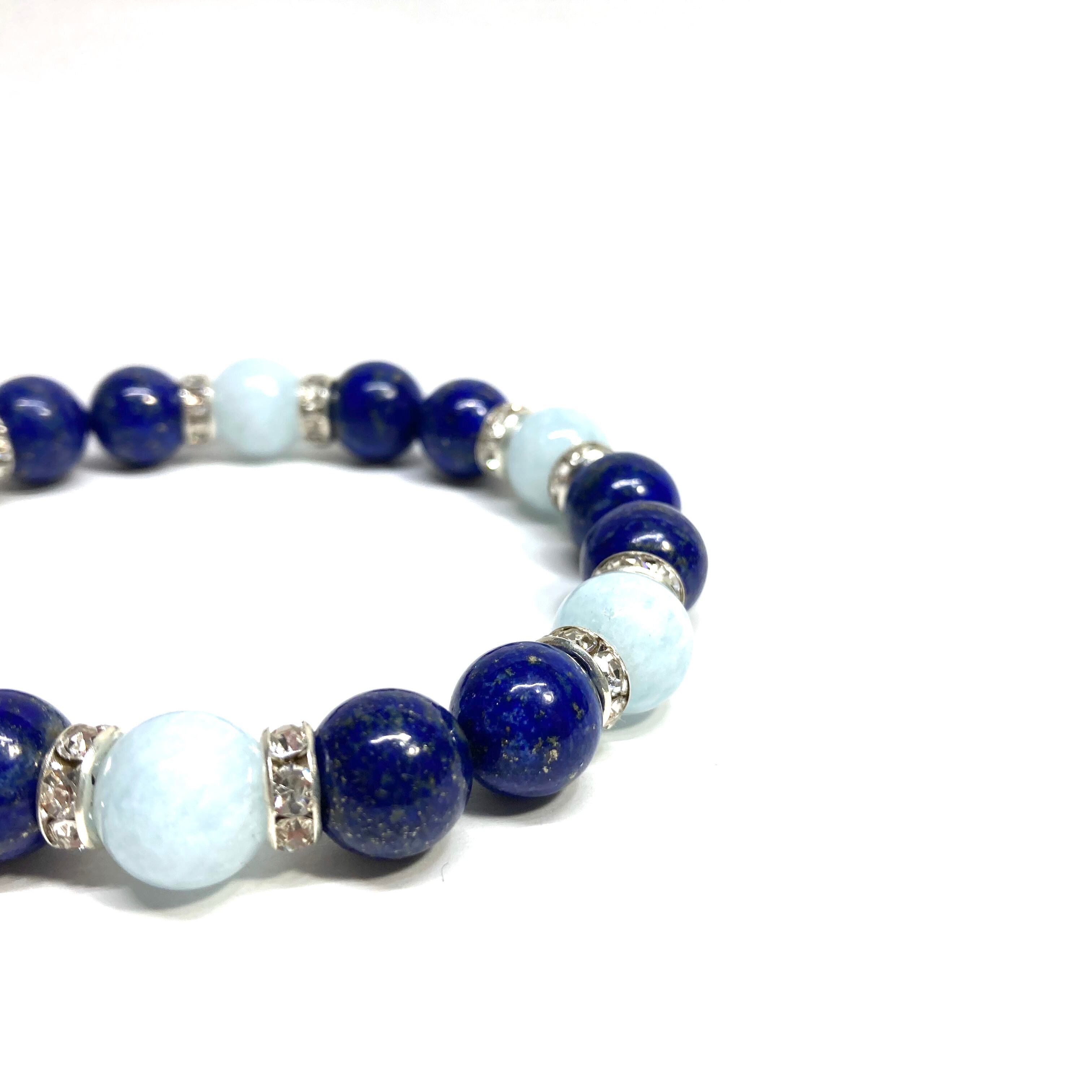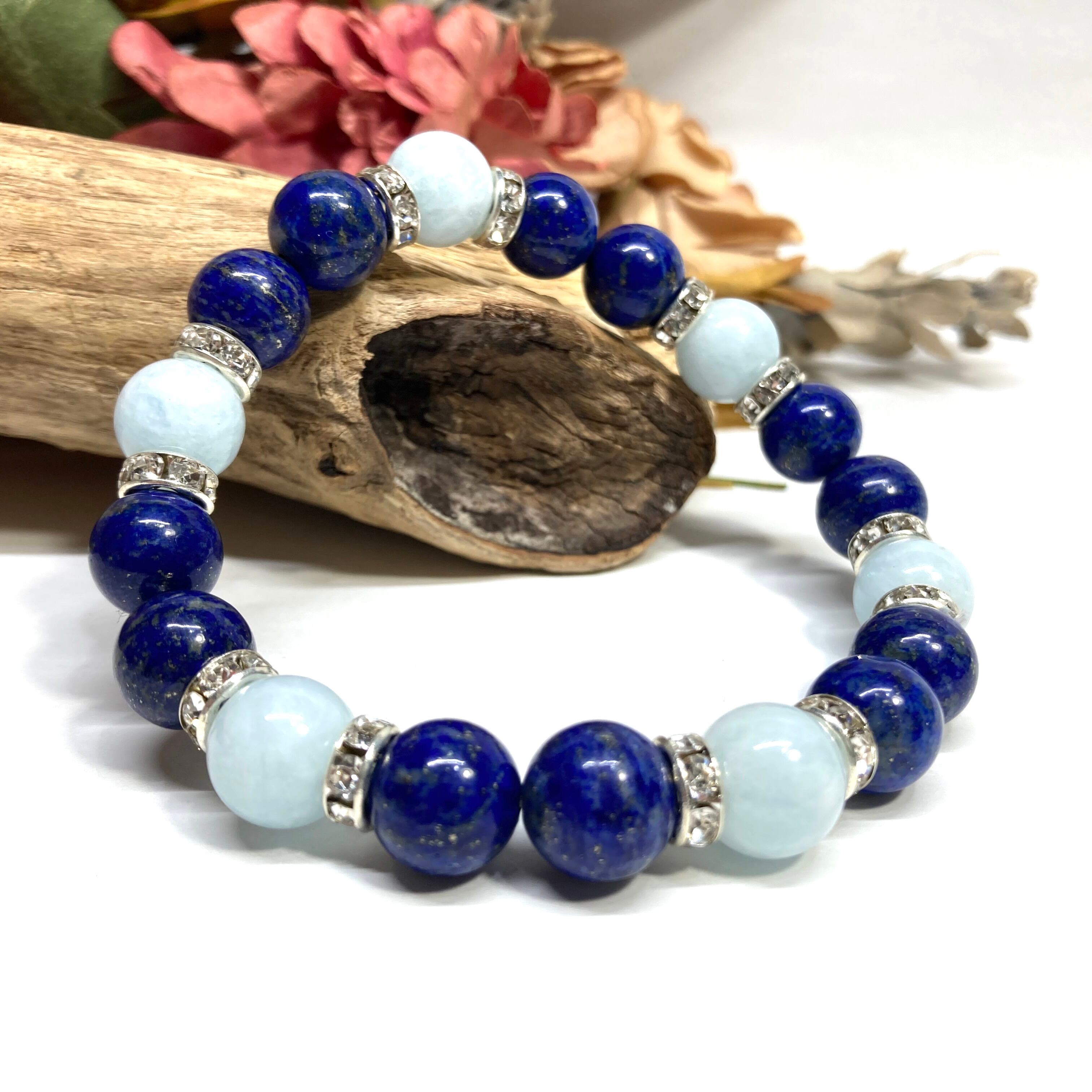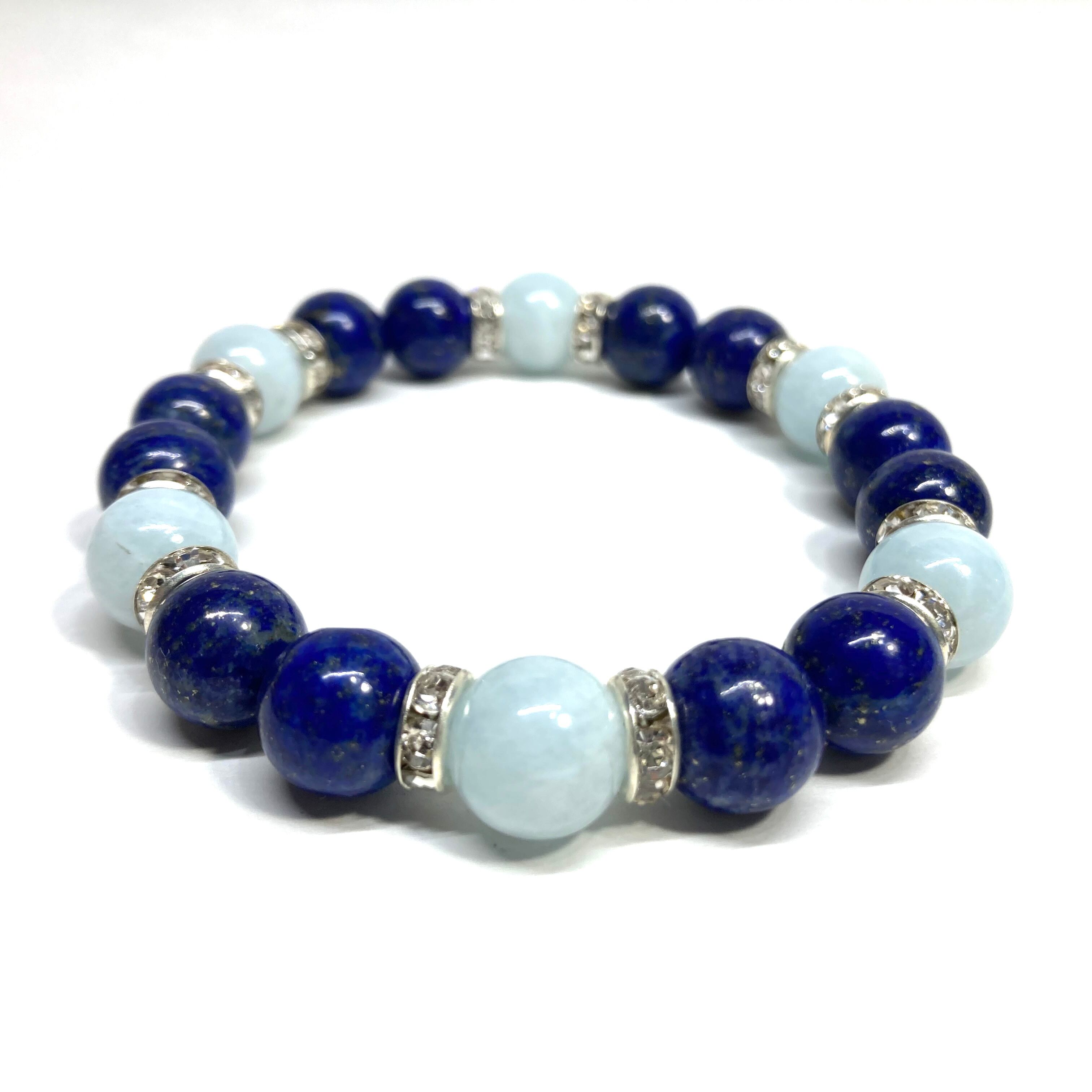 こちらは、ラピスラズリとアクアマリンを組み合わせたパワーストーンブレスレットです。間にはロンデルを挟み高級感あるデザインに仕上げております。石大きさは腕にも馴染みやすいように10mm玉で内径約18cm(伸可能)です。 数に限りがございますので気になる方はお早めにどうぞ。
