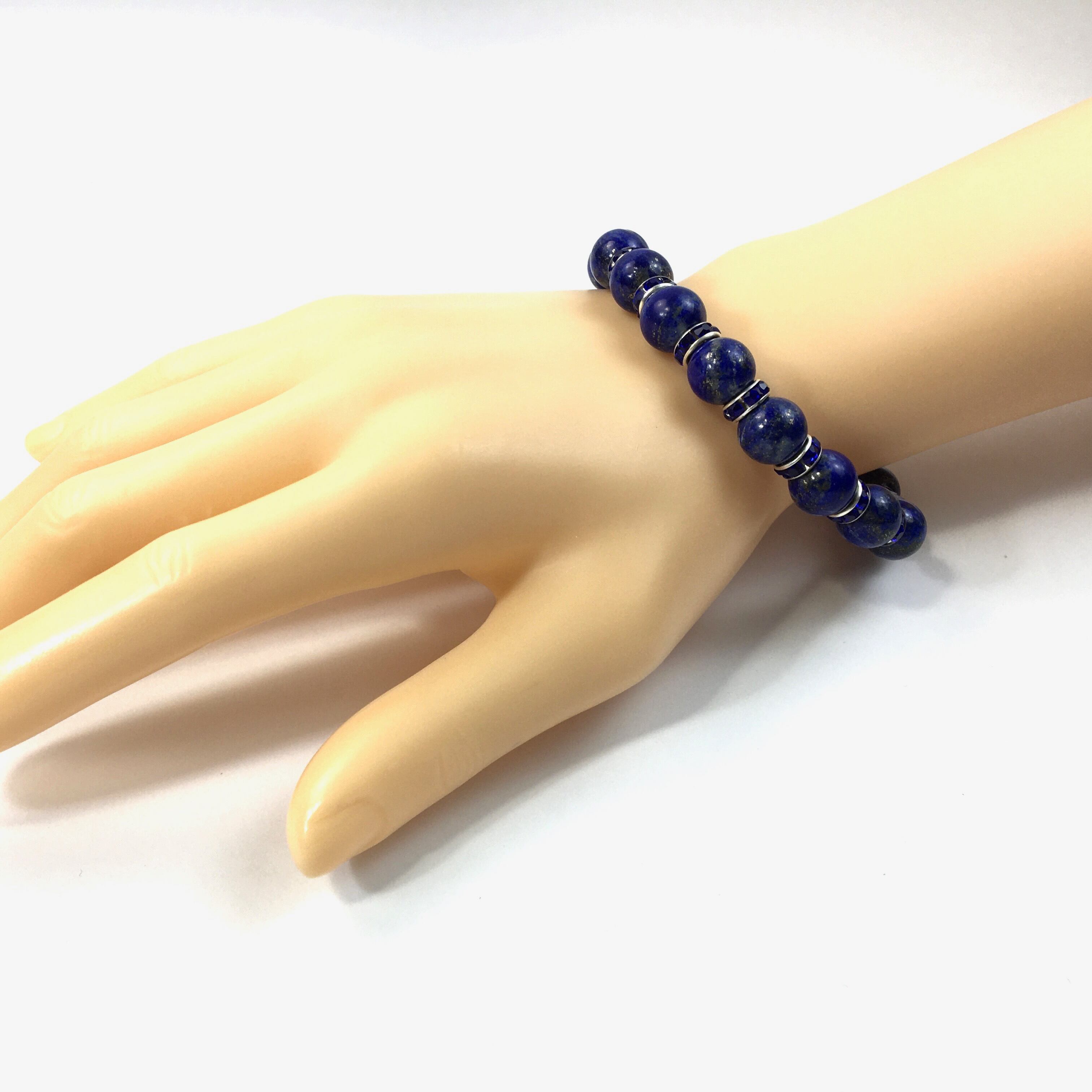 こちらは、ラピスラズリの10mm玉を使用したパワーストーンブレスレットです。石との間にはロンデルを挟み高級感を演出しております。シンプルなデザインは、シーン問わずどんなコーディネートとも合わせ易いブレスレットです。サイズは種類を選択からお選びください。(内周約14cm?内周約22cmでお選び頂けます)当社の中でも一番人気の実績があるデザインとなっております。気になる方はお早めにどうぞ。