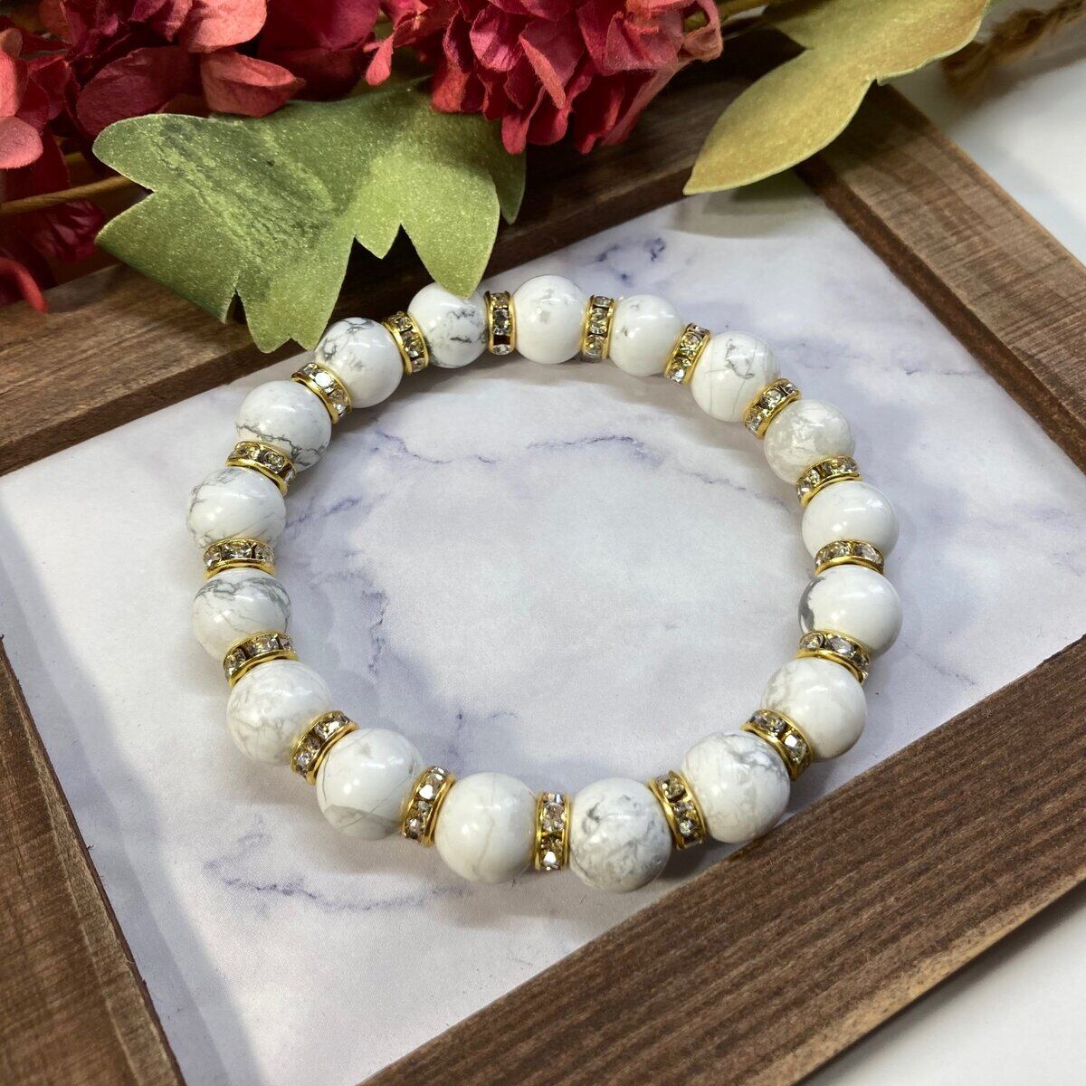 こちらは、ハウライトの10mm玉を使用したパワーストーンブレスレットです。石との間にはロンデルを挟み高級感を演出しております。シンプルなデザインは、シーン問わずどんなコーディネートとも合わせ易いブレスレットです。サイズは種類を選択からお選びください。(内周約14cm?内周約22cmでお選び頂けます)当社の中でも一番人気の実績があるデザインとなっております。気になる方はお早めにどうぞ。