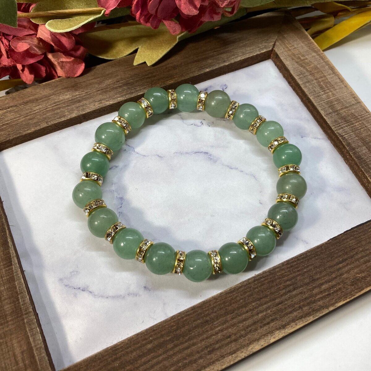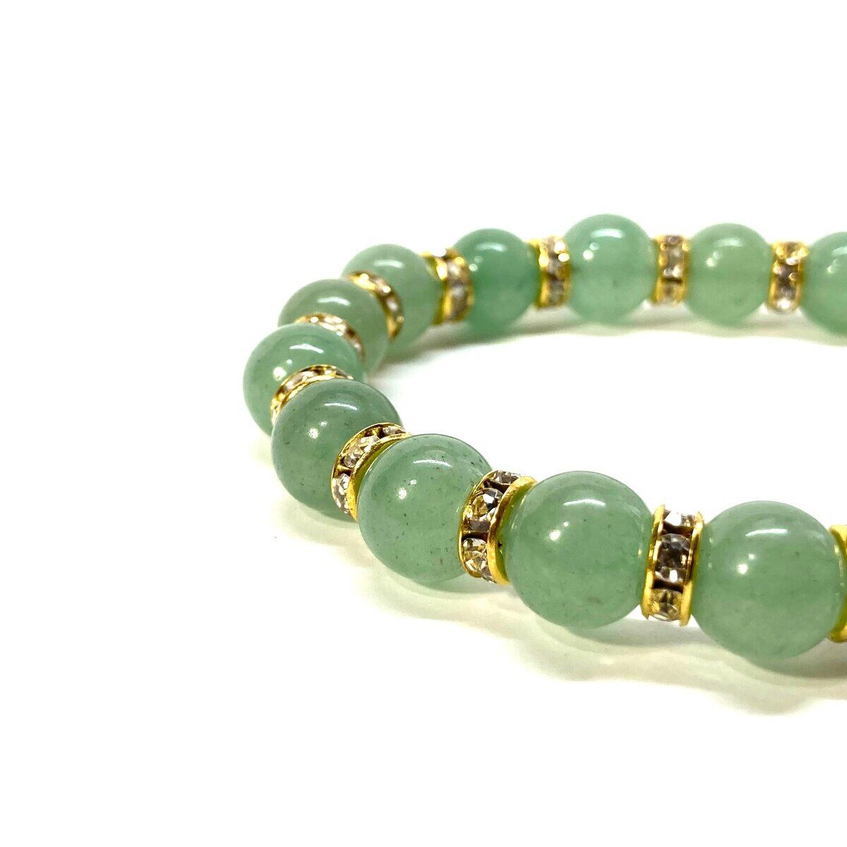 こちらは、アベンチュリンの10mm玉を使用したパワーストーンブレスレットです。石との間にはロンデルを挟み高級感を演出しております。シンプルなデザインは、シーン問わずどんなコーディネートとも合わせ易いブレスレットです。サイズは種類を選択からお選びください。(内周約14cm?内周約22cmでお選び頂けます)当社の中でも一番人気の実績があるデザインとなっております。気になる方はお早めにどうぞ。