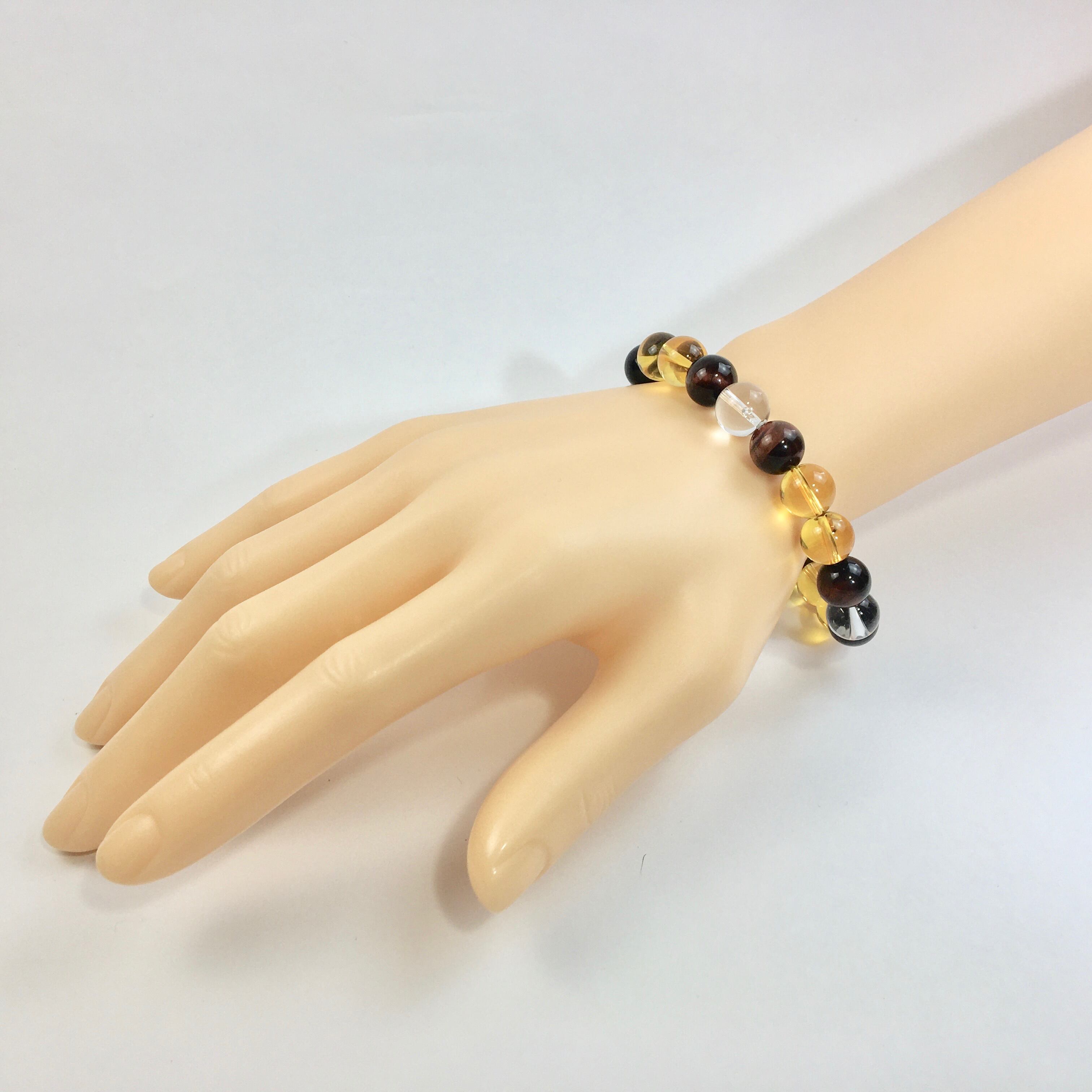 こちらは、水晶とレッドタイガーアイとシトリン使用したパワーストーンブレスレットです。今回はパーツは使わずシンプルに石のみでデザインしてあります。パーツを使っていないので金属アレルギーの方などにもオススメできるブレスレットです。石の大きさは全て10mm玉を使用して内径約17cmです。数に限りがございますので気になる方はお早めにどうぞ。