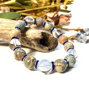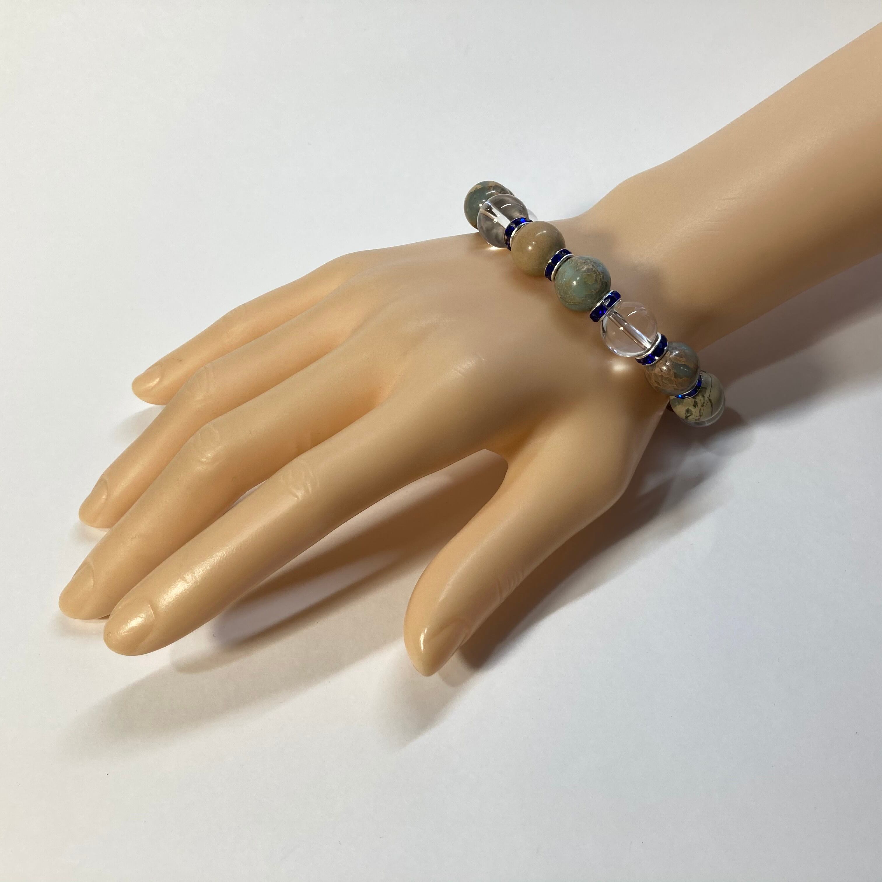 こちらは、インプレッションストーンと水晶を組み合わせたパワーストーンブレスレットです。間にはロンデルを挟み高級感あるデザインに仕上げております。石大きさは12mm玉を使用して内径約18cmです。気になる方は是非この機会にどうぞ。