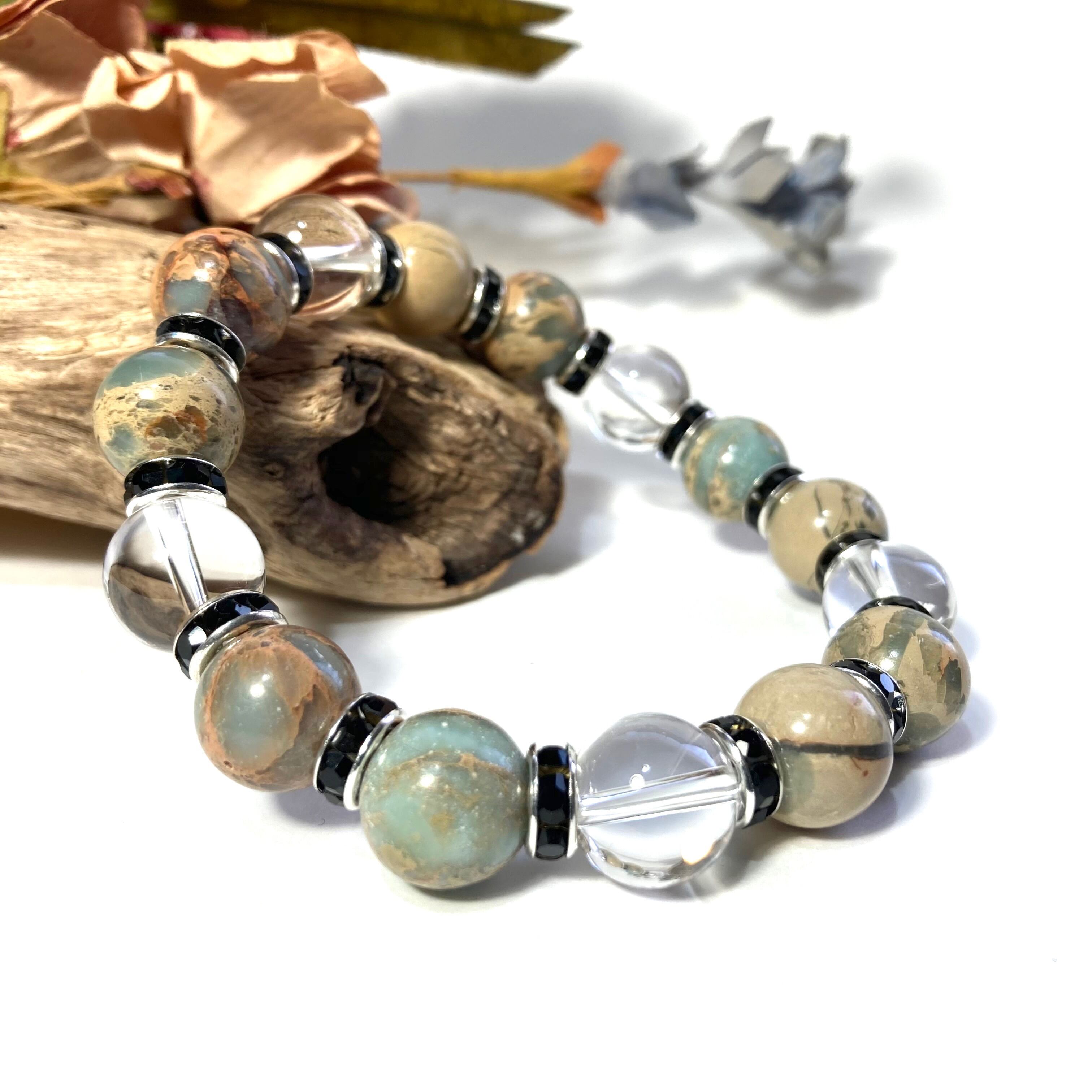 こちらは、インプレッションストーンと水晶を組み合わせたパワーストーンブレスレットです。間にはロンデルを挟み高級感あるデザインに仕上げております。石大きさは12mm玉を使用して内径約18cmです。気になる方は是非この機会にどうぞ。
