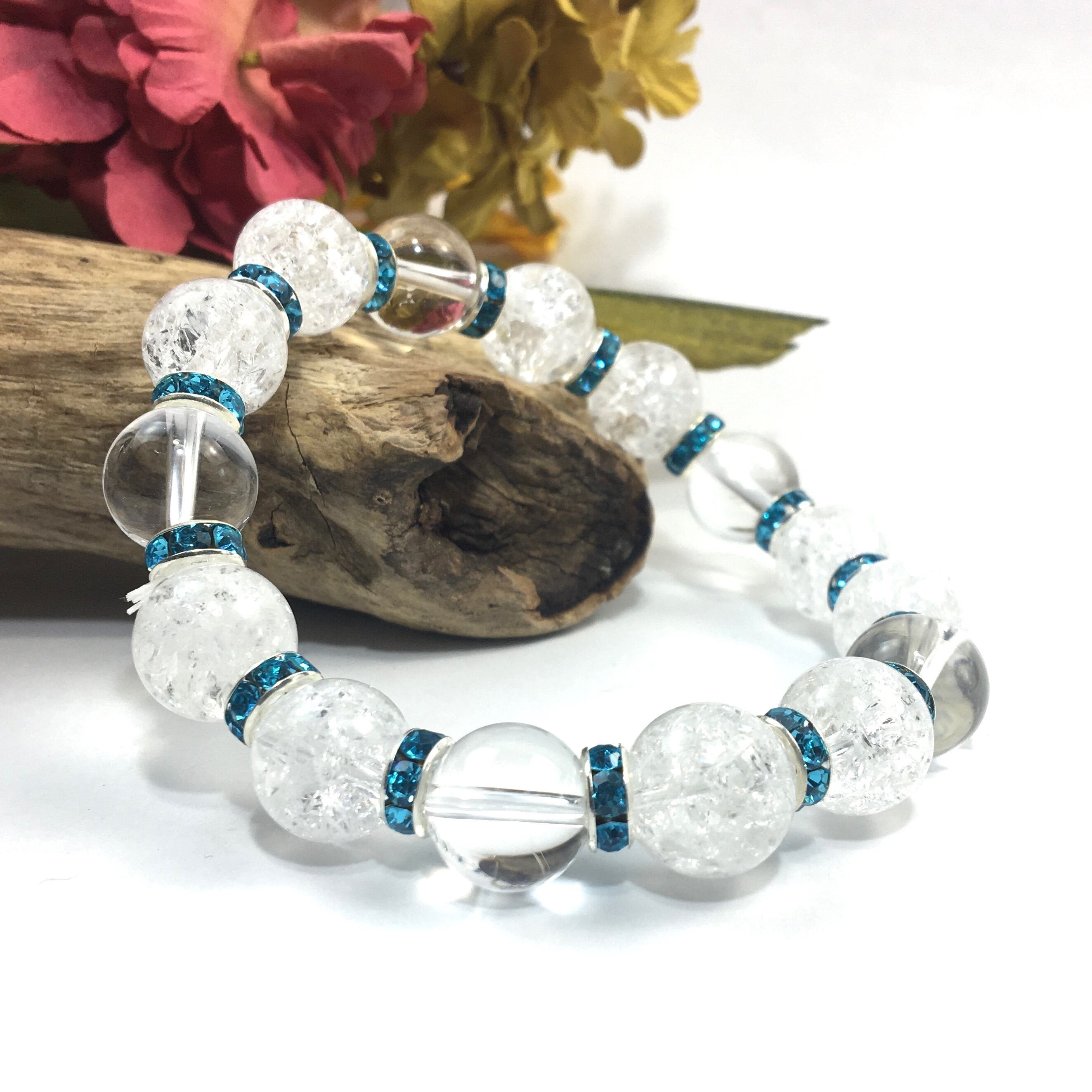 クラック水晶&水晶 パワーストーン ブレスレット 天然石 12mm (ライトブルー)メンズ・レディース 男性・女性 数珠ブレス 開運