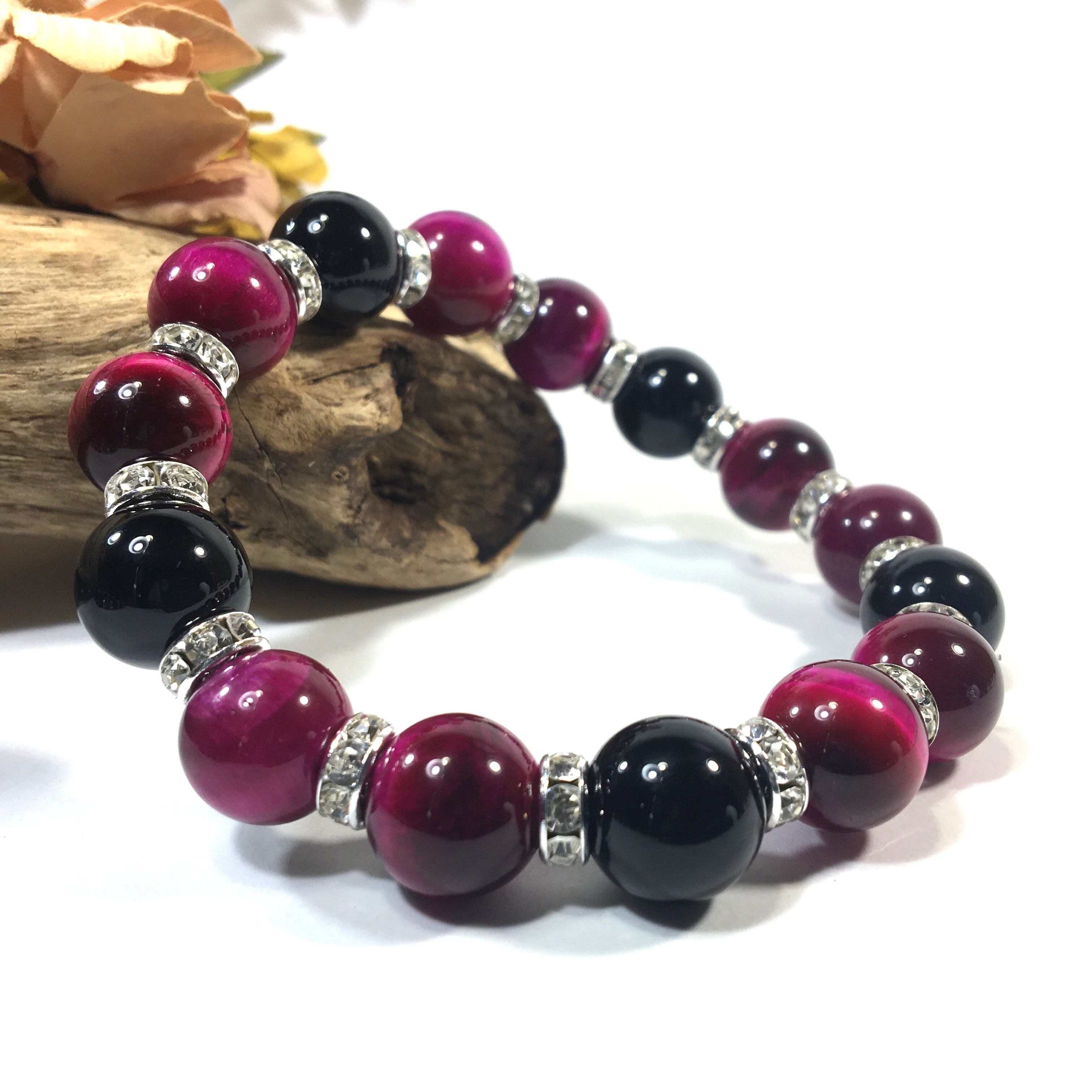 ピンクタイガーアイ&オニキス パワーストーン ブレスレット 12mm (シルバー)メンズ・レディース 男性・女性 数珠ブレス 開運