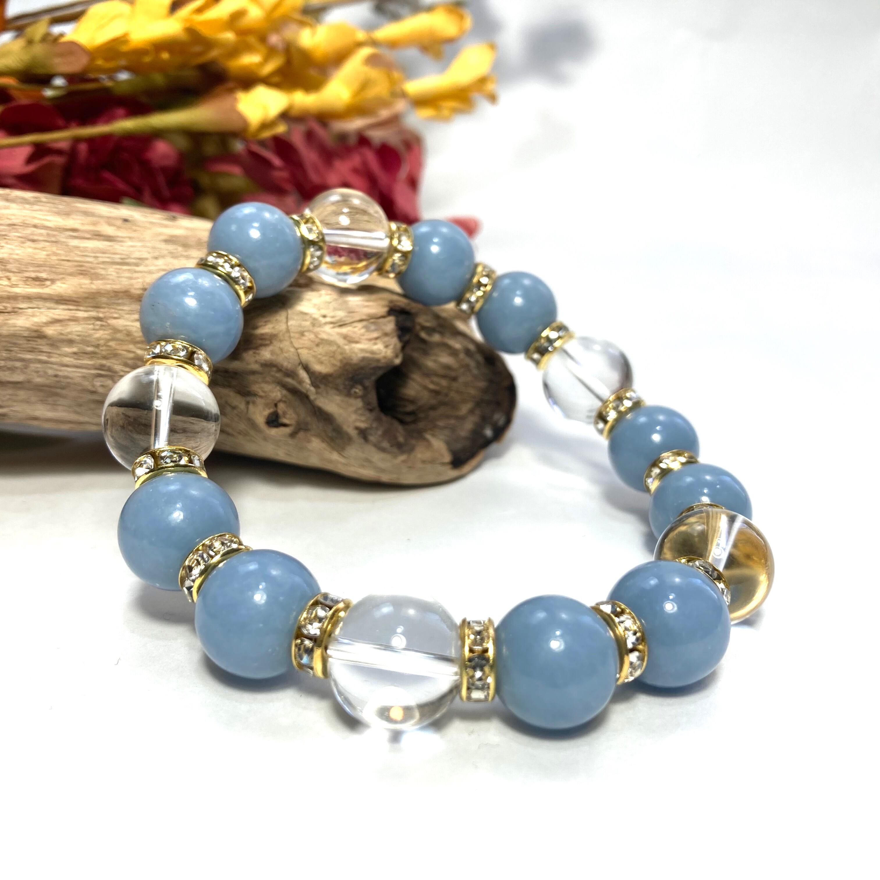 こちらは、エンジェライトと水晶を組み合わせたパワーストーンブレスレットです。間にはロンデルを挟み高級感あるデザインに仕上げております。石大きさは12mm玉を使用して内周約18cmです。気になる方は是非この機会にどうぞ。