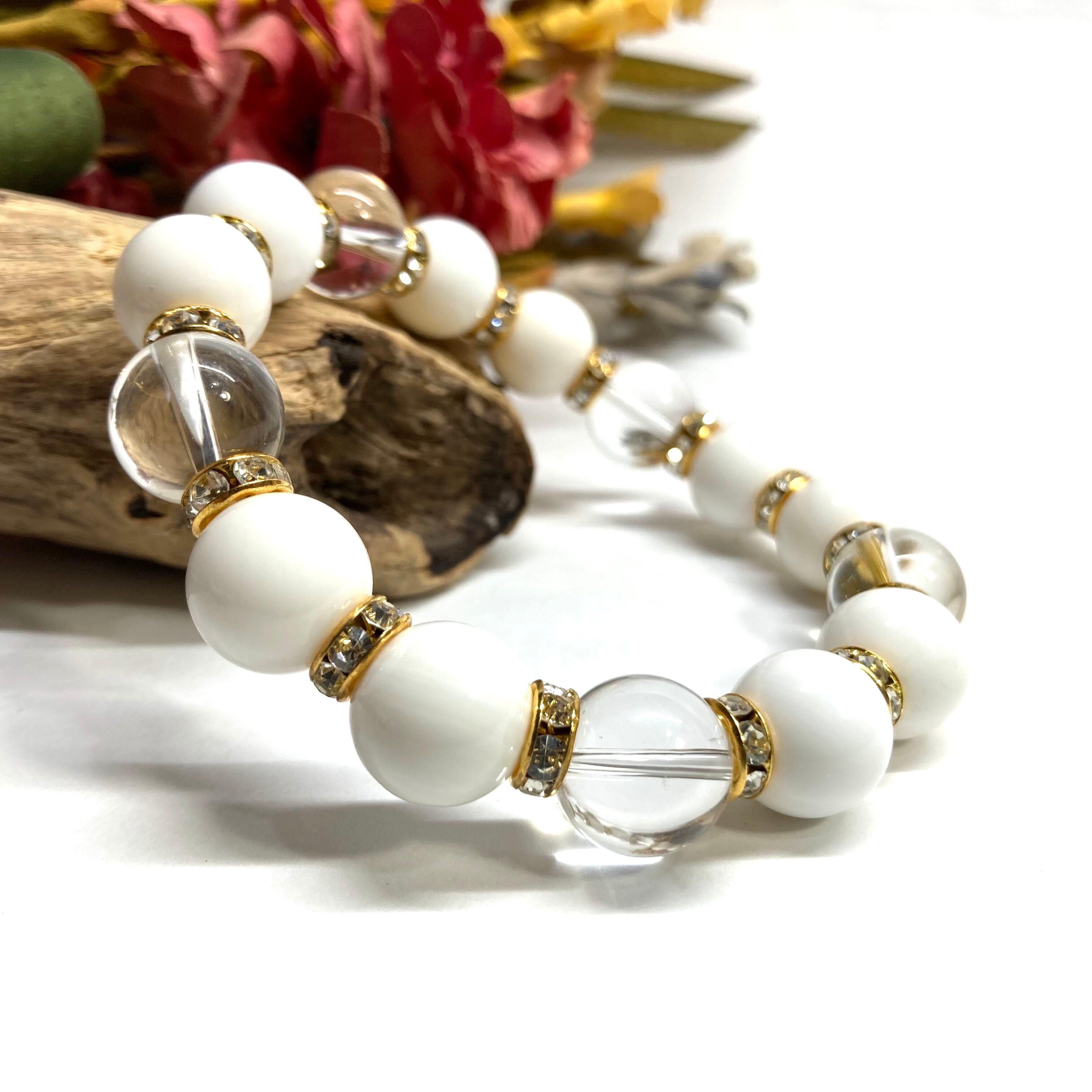 こちらは、ホワイトオニキスと水晶を組み合わせたパワーストーンブレスレットです。間にはロンデルを挟み高級感あるデザインに仕上げております。程よくインパクトがある12mm玉を使用して内周約18cmです。(サイズ変更の場合は取引ナビにてご連絡をお願いします。) 数に限りがございますので気になる方はお早めにどうぞ。