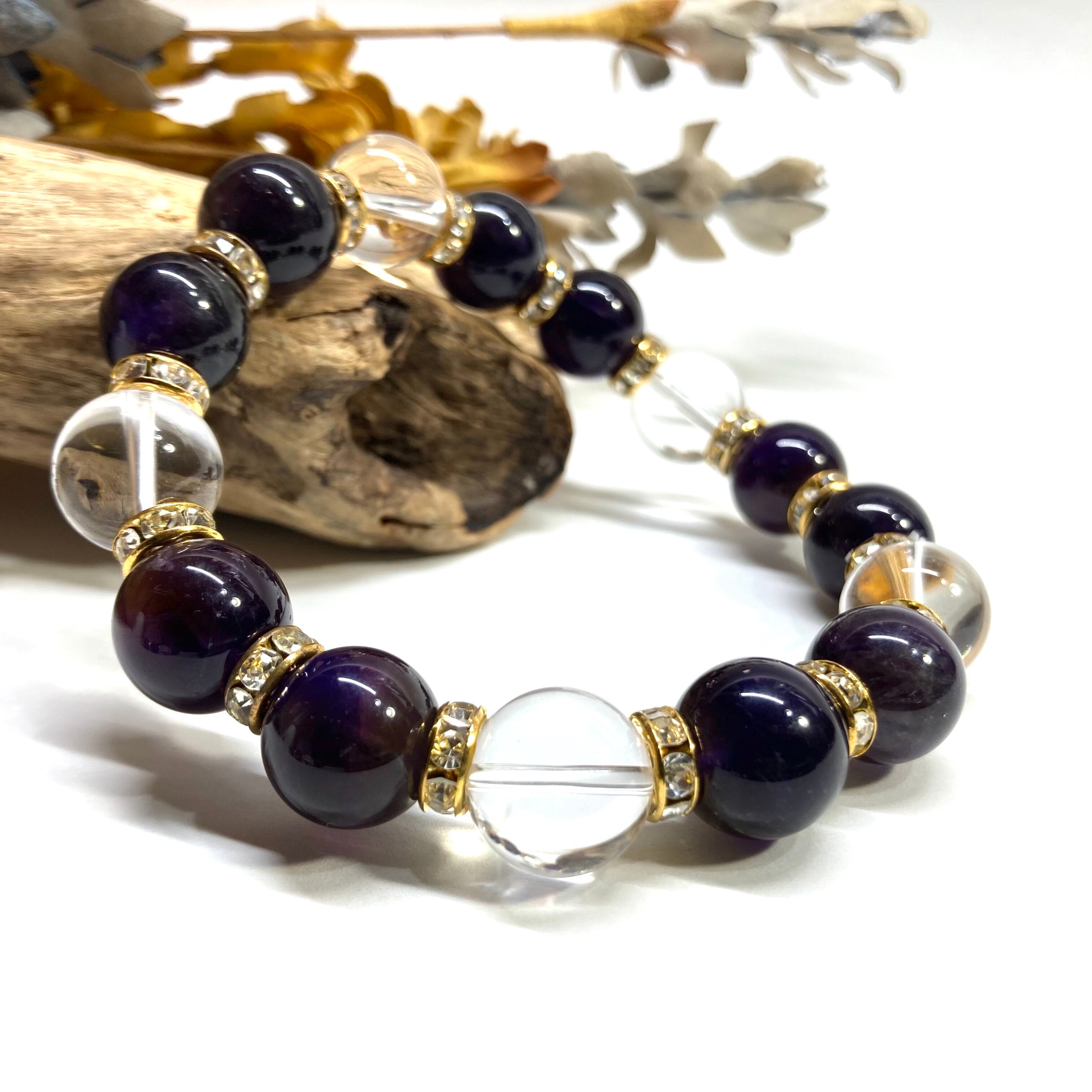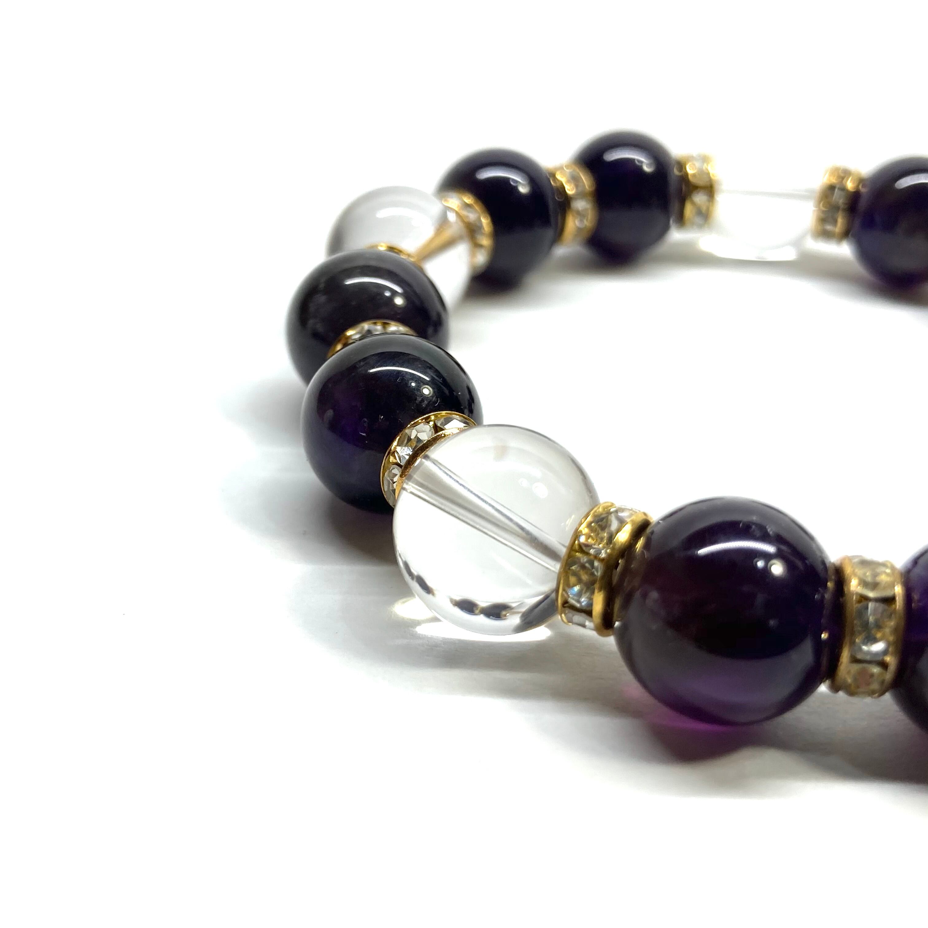 こちらは、10mm玉のアメジストと水晶を組み合わせたパワーストーンブレスレットです。間にはロンデルを挟み高級感あるデザインに仕上げております。石大きさは12mm玉を使用して内周約18cmです。数に限りがございますので気になる方はお早めにどうぞ。
