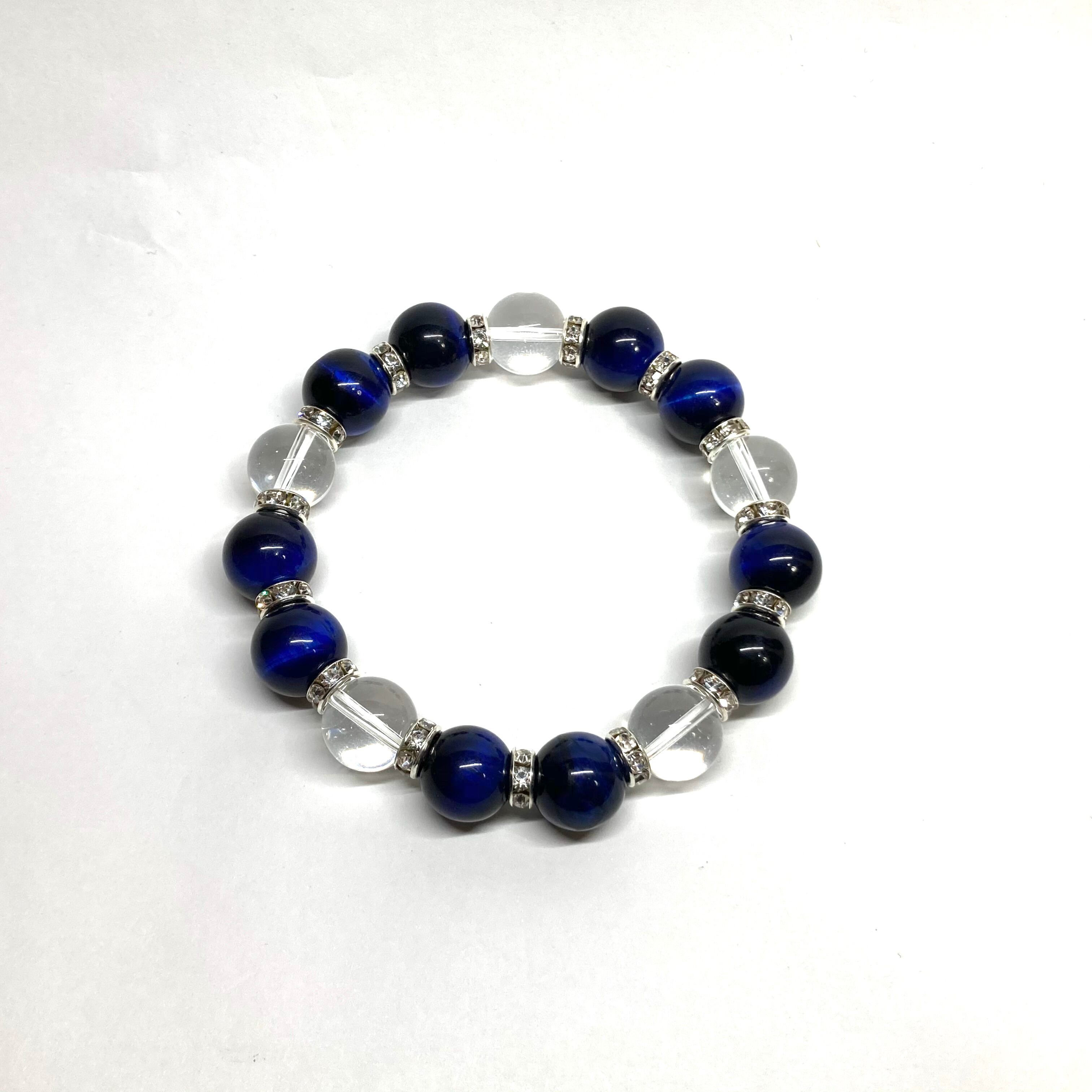 こちらは、ブルータイガーアイと水晶を組み合わせたパワーストーンブレスレットです。間にはロンデルを挟み高級感あるデザインに仕上げております。程よくインパクトがある12mm玉を使用して内周約18cmです。数に限りがございますので気になる方はお早めにどうぞ。