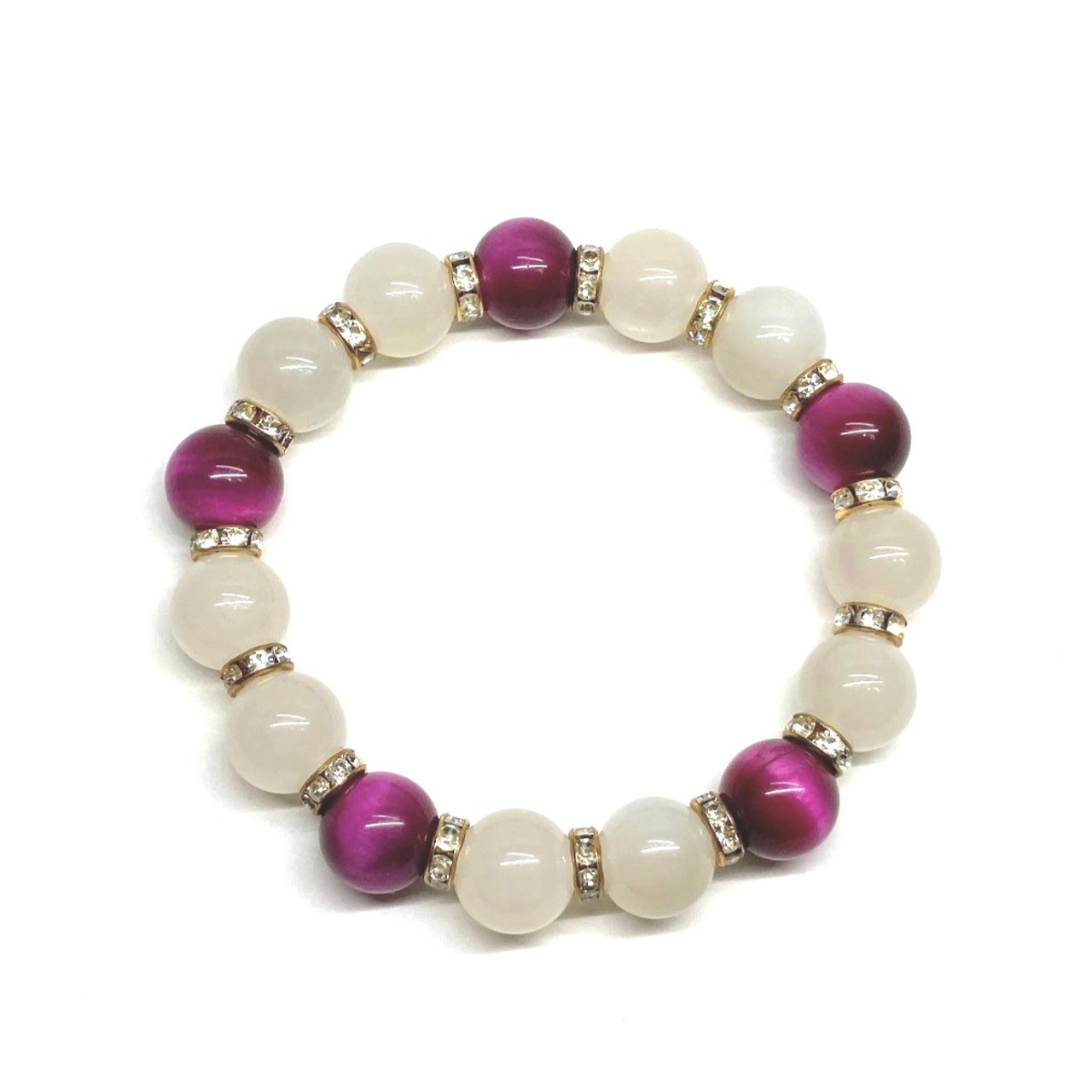 こちらは、ムーンストーンとピンクタイガーアイを組み合わせたパワーストーンブレスレットです。間にはロンデルを挟み高級感あるデザインに仕上げております。石大きさは12mm玉を使用して内周 約18cmです。気になる方は是非この機会にどうぞ。