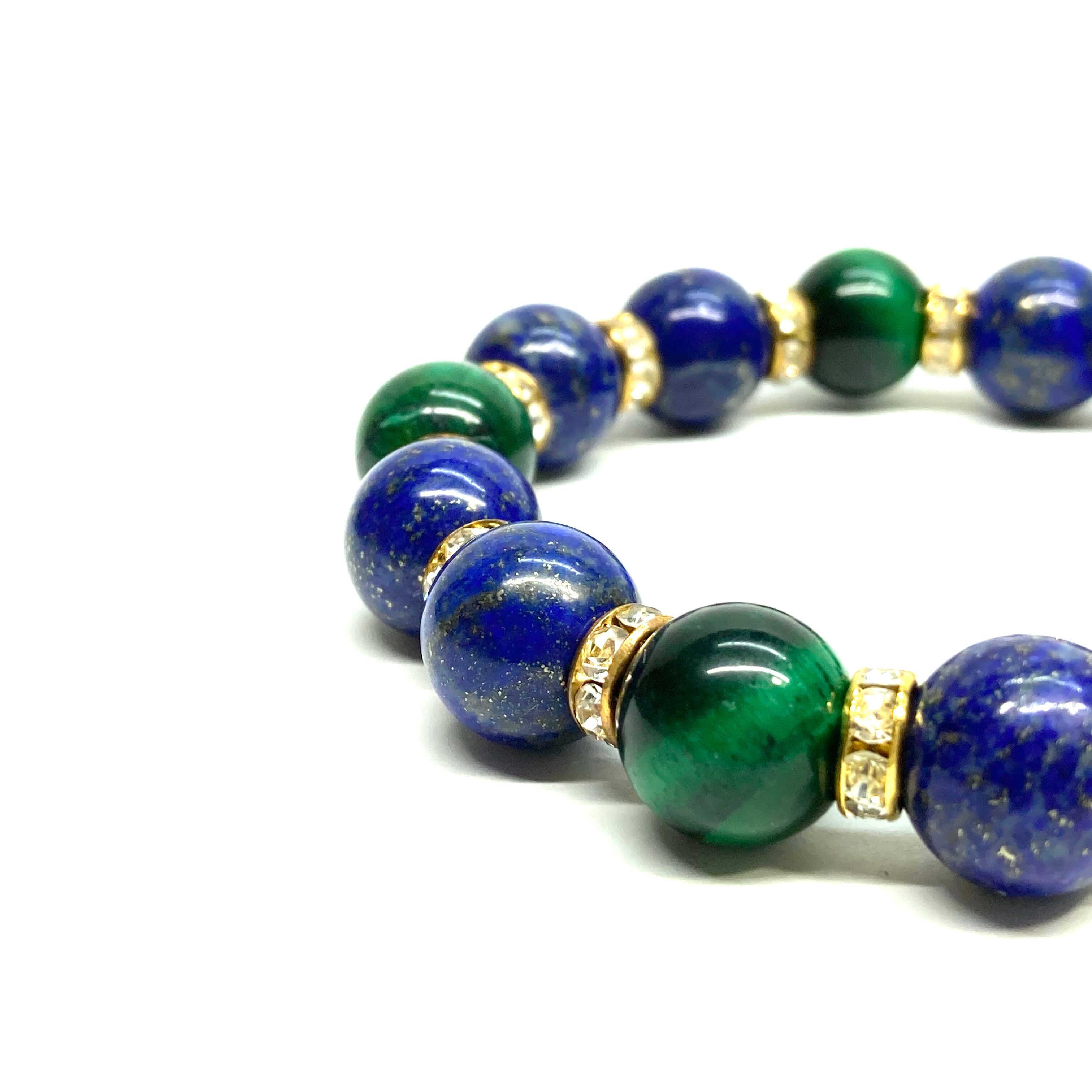 こちらは、ラピスラズリとブルータイガーアイを組み合わせたパワーストーンブレスレットです。間にはロンデルを挟み高級感あるデザインに仕上げております。石大きさは12mm玉を使用して内周 約18cmです。気になる方は是非この機会にどうぞ。