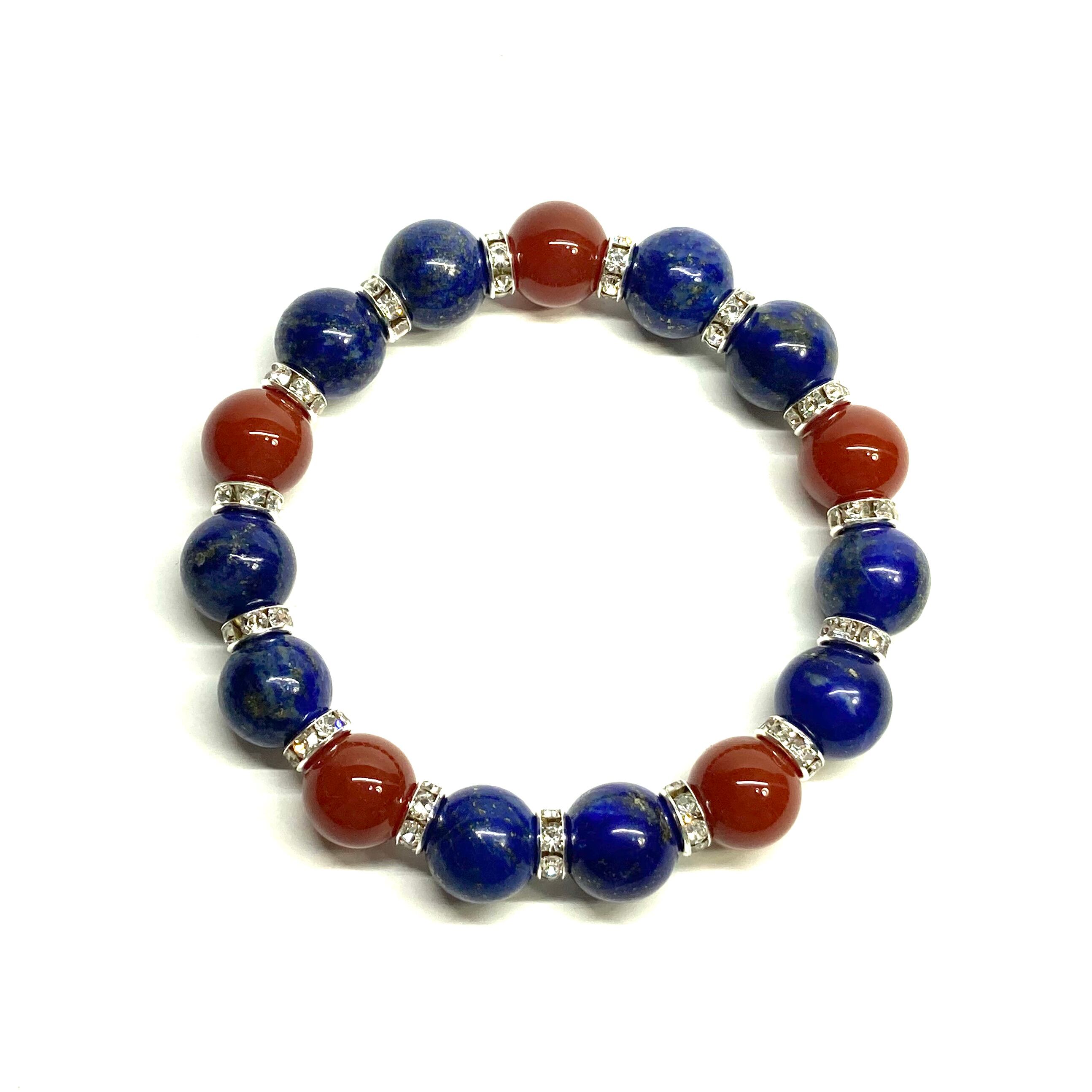 こちらは、ラピスラズリと赤瑪瑙を組み合わせたパワーストーンブレスレットです。間にはロンデルを挟み高級感あるデザインに仕上げております。石大きさは12mm玉を使用して内周 約18cmです。気になる方は是非この機会にどうぞ。