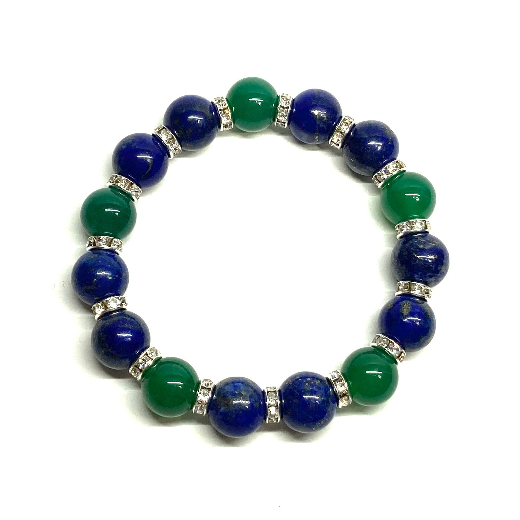 こちらは、ラピスラズリと緑瑪瑙を組み合わせたパワーストーンブレスレットです。間にはロンデルを挟み高級感あるデザインに仕上げております。石大きさは12mm玉を使用して内周 約18cmです。気になる方は是非この機会にどうぞ。