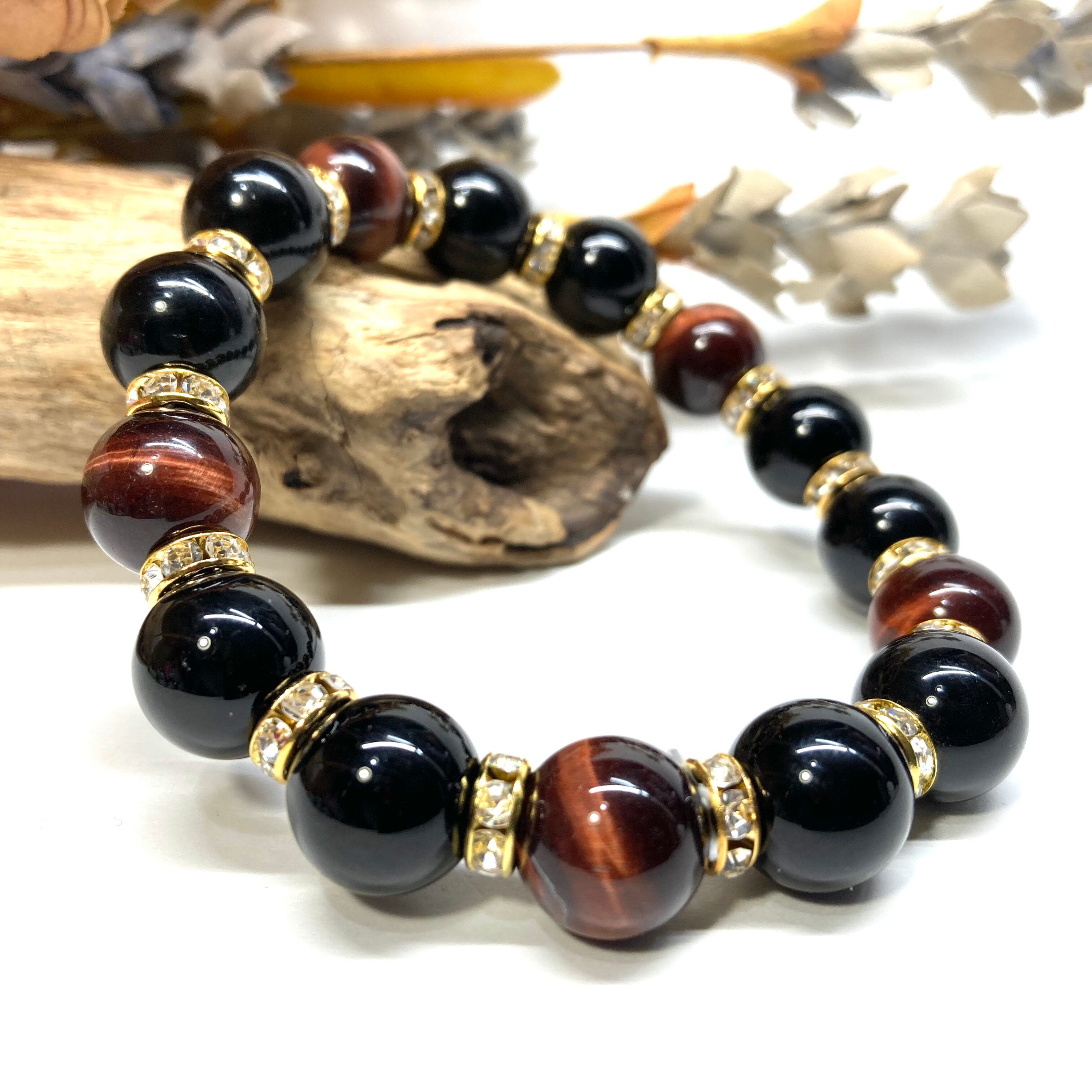 モリオン&レッドタイガーアイ パワーストーン ブレスレット 天然石ブレス (ゴールド) 12mm 幸運 開運 厄払い メンズ 男性