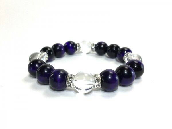 こちらは、12mm玉のパープルタイガーアイと水晶を使用した天然石ブレスレットです。石との間にはロンデルを挟み高級感を演出しています。シンプルなデザインですのでどんなコーディネートとも合わせ易いブレスレットです。石大きさは12mm玉です。内周約18cmです。気になる方は是非この機会にどうぞ。