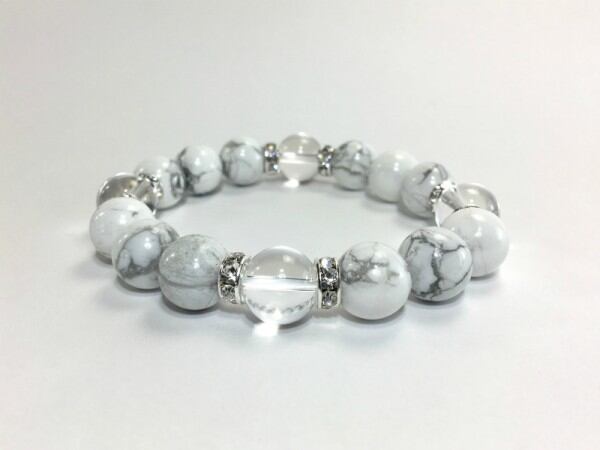 こちらは、12mm玉のハウライトと水晶を使用した天然石ブレスレットです。石との間にはロンデルを挟み高級感を演出しています。シンプルなデザインですのでどんなコーディネートとも合わせ易いブレスレットです。石大きさは12mm玉です。内周約18cmです。気になる方は是非この機会にどうぞ。