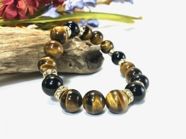 こちらは、12mm玉のタイガーアイとオニキスを使用した天然石ブレスレットです。石との間にはロンデルを挟み高級感を演出しています。シンプルなデザインですのでどんなコーディネートとも合わせ易いブレスレットです。石大きさは12mm玉です。内周約18cmです。気になる方は是非この機会にどうぞ。