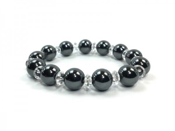 こちらは、ヘマタイトを使用したブレスレットです。間には水晶ソロバンが挟まれてアクセントとなっております。石大きさは腕にも馴染みやすいように12mm玉で内周約17cm(伸可能)です。気になる方は是非この機会にどうぞ。