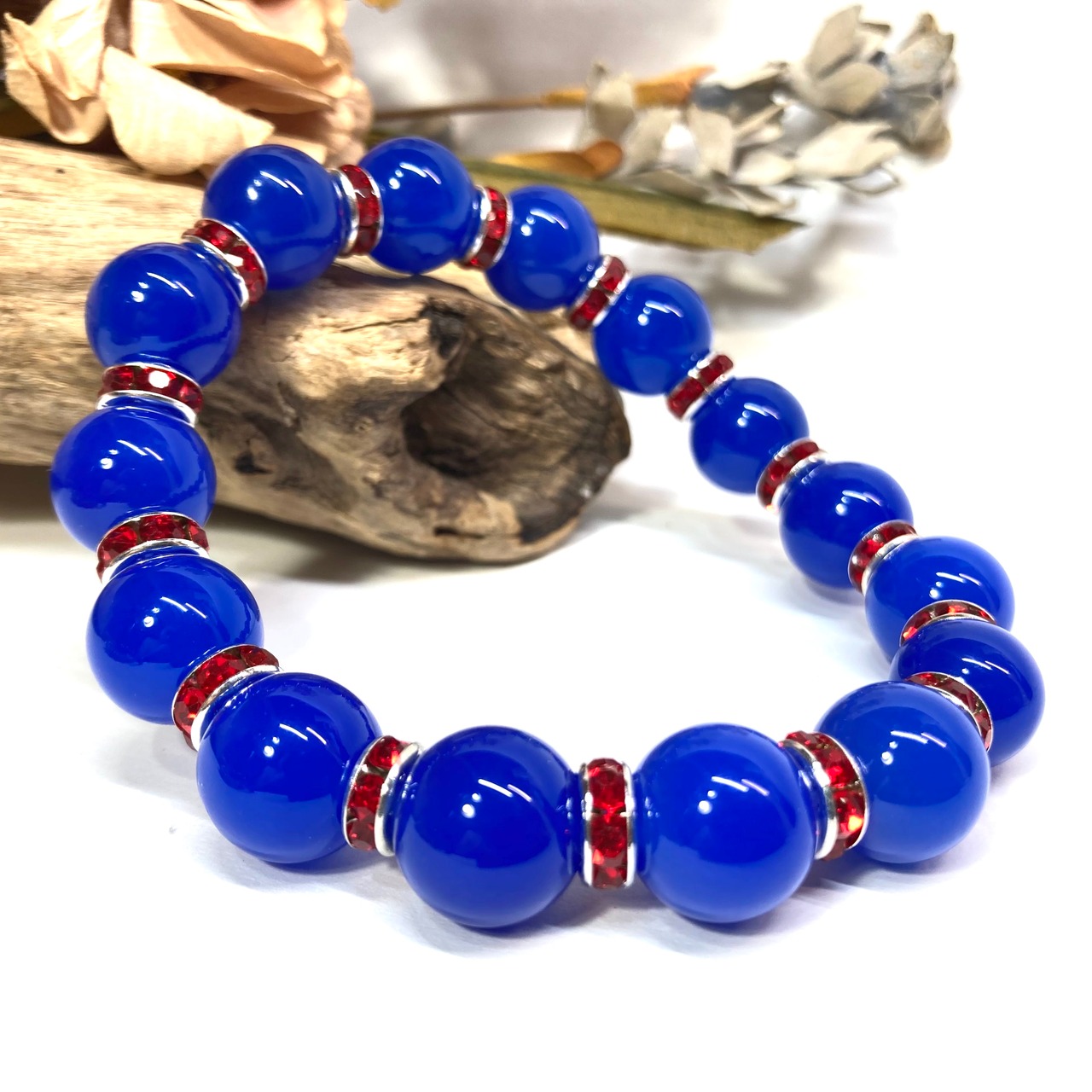 こちらは、12mm玉の青瑪瑙を使用したパワーストーンブレスレットです。間にはロンデルを挟み高級感を演出しております。男女問わずどんなコーディネートとも合わせ易いブレスレットです。サイズは内周約18cmです。数に限りがございますので気になる方はお早めにどうぞ。