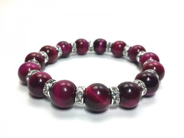 こちらは、12mm玉のピンクタイガーアイを使用したブレスレットです。石との間にはロンデルを挟み高級感を演出しています。シンプルなデザインですのでどんなコーディネートとも合わせ易いブレスレットです。石大きさは12mm玉です。内周約18cmです。気になる方は是非この機会にどうぞ。