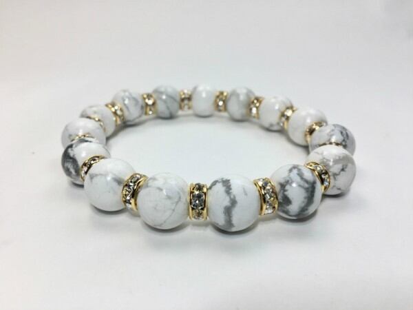 こちらは、12mm玉のハウライトを使用した天然石ブレスレットです。石との間にはロンデルを挟み高級感を演出しています。シンプルなデザインですのでどんなコーディネートとも合わせ易いブレスレットです。石大きさは12mm玉です。内周約18cmです。気になる方は是非この機会にどうぞ。
