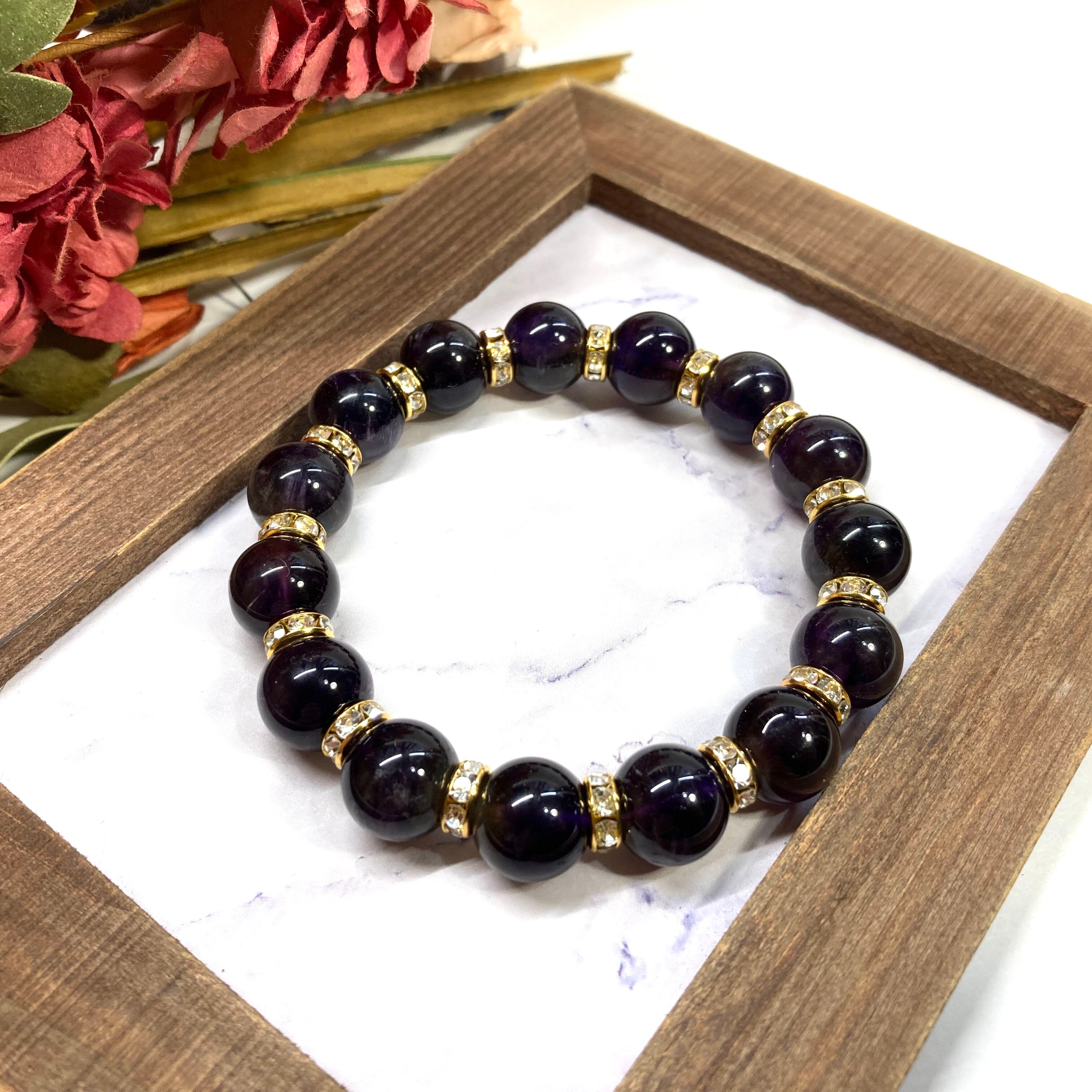 こちらは、10mm玉のアメジストを使用したパワーストーンブレスレットです。間にはロンデルを挟み高級感を演出しております。男女問わずどんなコーディネートとも合わせ易いブレスレットです。サイズは内周約18cmです。数に限りがございますので気になる方はお早めにどうぞ。