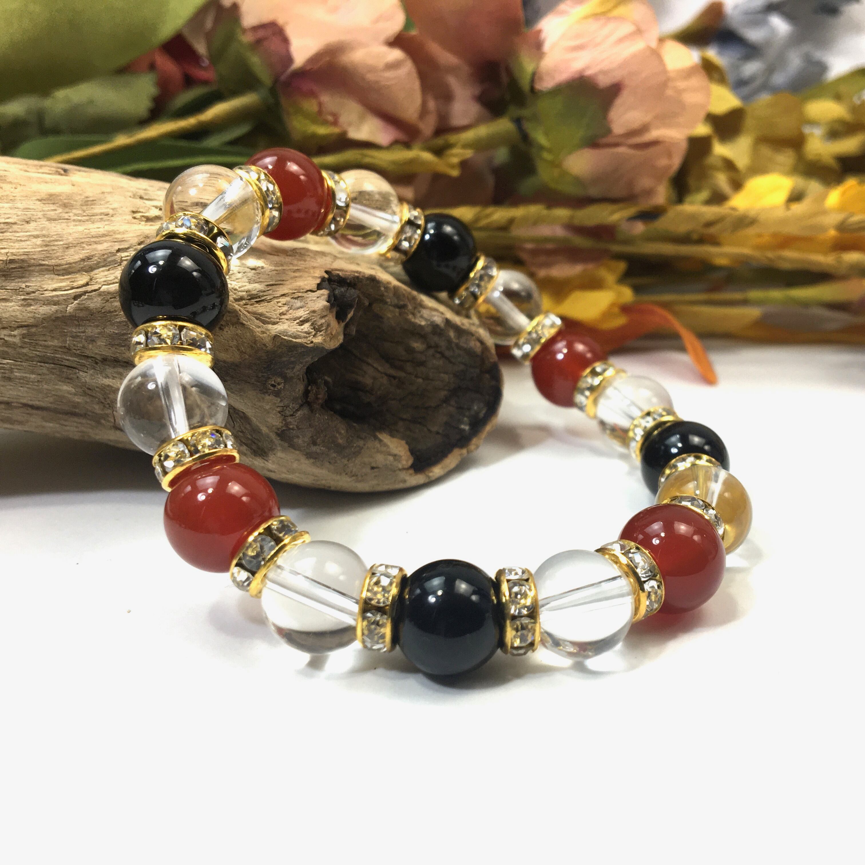 赤瑪瑙×水晶×オニキス パワーストーン ブレスレット 10mm(ゴールド)メンズ・レディース 男性・女性 数珠ブレス 開運