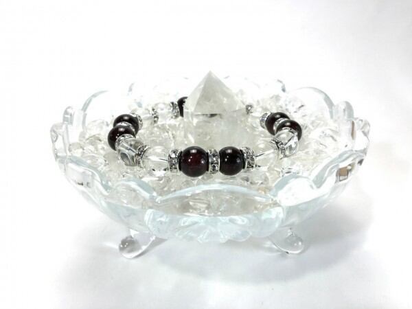 こちらは、ガーネットと水晶を組み合わせたブレスレットです。間にはロンデルを挟み高級感あるデザインに仕上がっています。石大きさは腕にも馴染みやすいように10mm玉で内周約16cm(伸可能)です。数に限りがございますので気になる方はお早めにどうぞ。